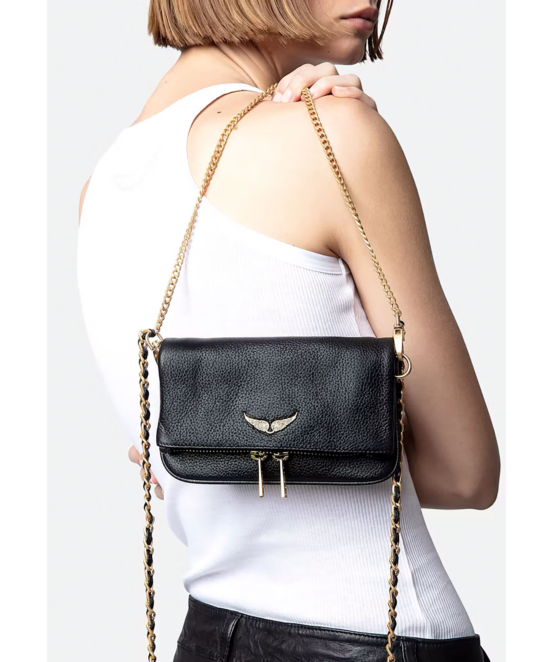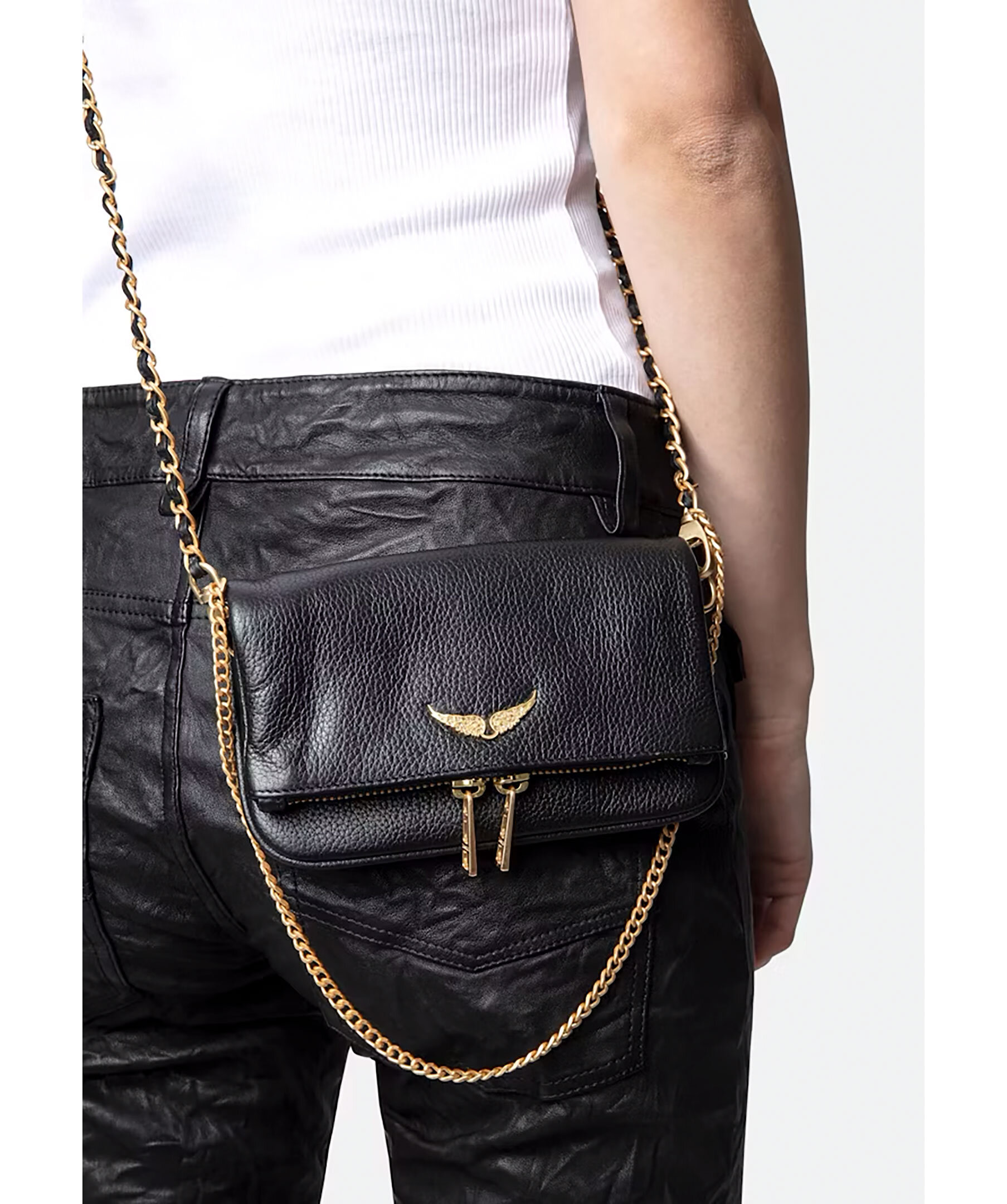 Svart läderclutch med guldtonade detaljer från Zadig Voltaire. Väskan har två avtagbara kedjor, en i läder och en i metall. Bär för hand, över axeln eller över kroppen. Bakficka med dragkedja. Väskan har en flik med magentstängning och dragkedja. Diamanté-utsmyckade vingar på framsidan. Tillverkad i kalvskinn. Tillräckligt stor för en mobiltelefon upp till 6,1 tum (t.ex. iPhone 12/13/14). Mått: B: 17,5cm / H: 11cm. Kedjeremsfall: 23 cm och 61 cm.
