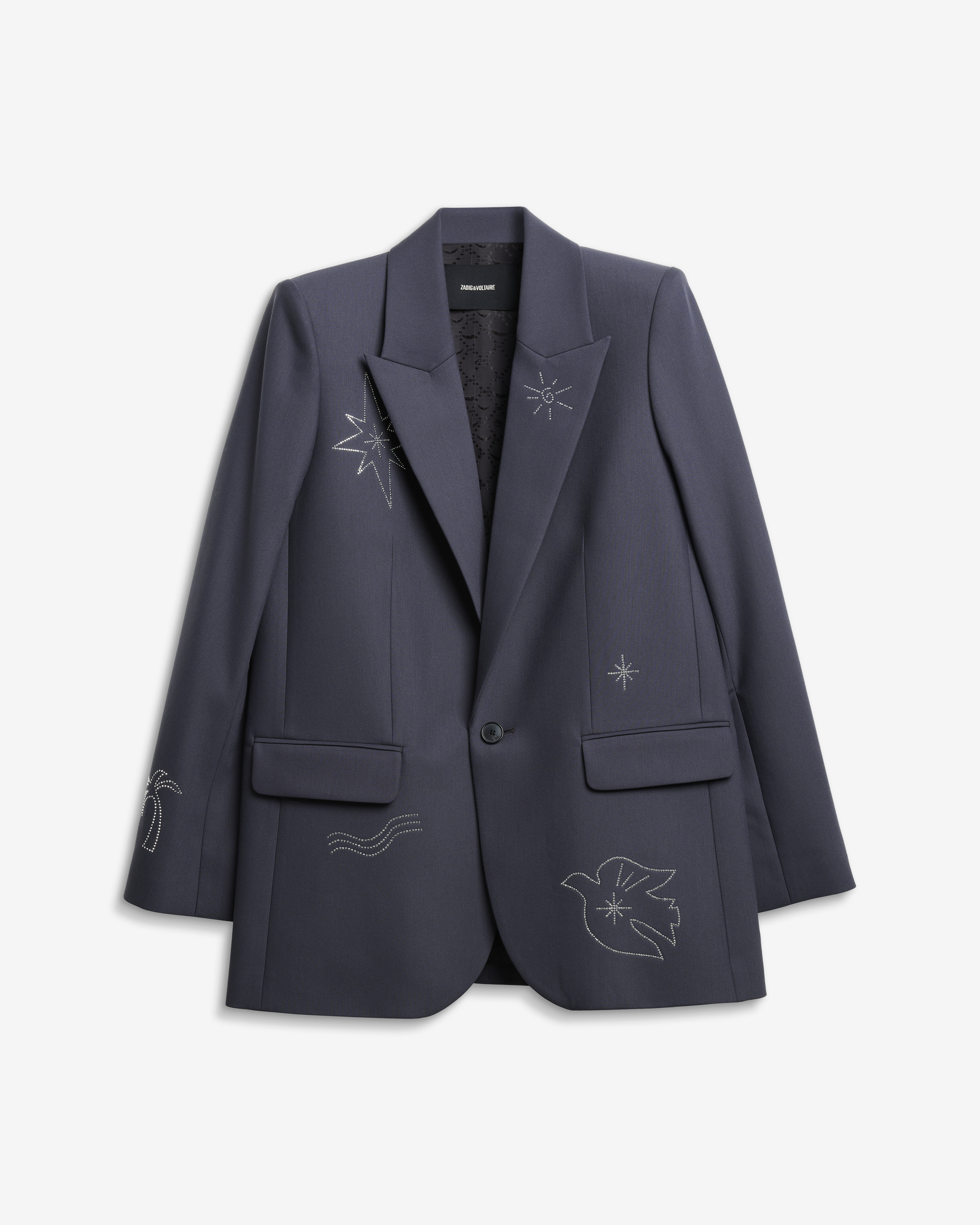 Kavaj från Zadig & Voltaire med rak silhuett och glittrande strassdetaljer som ger en modern twist. Den klassiska designen kombineras med dekorativa inslag för en sofistikerad men uttrycksfull look.
