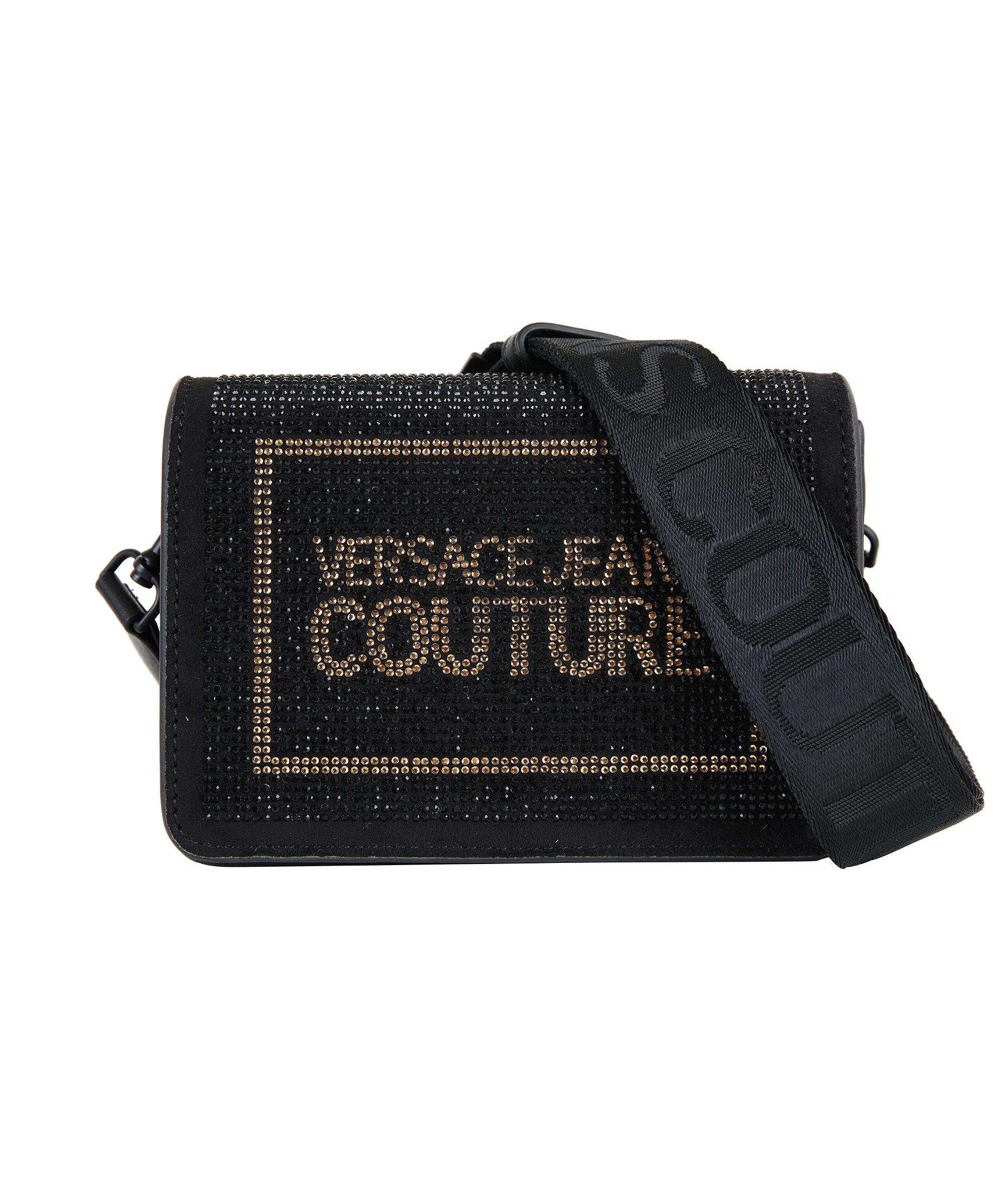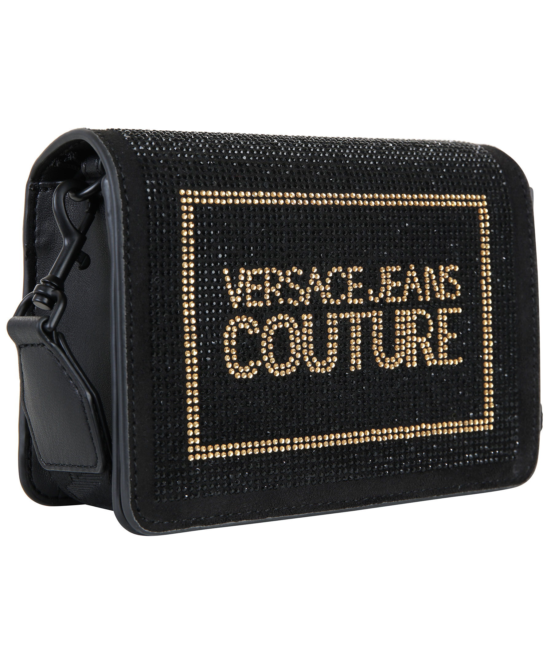 Svart liten handväska från Versace Jeans Couture. Tillverkad i syntet. Framsida täckt i strass med guldfärgad logotyp.Reglerbart axelband med diskret logga.