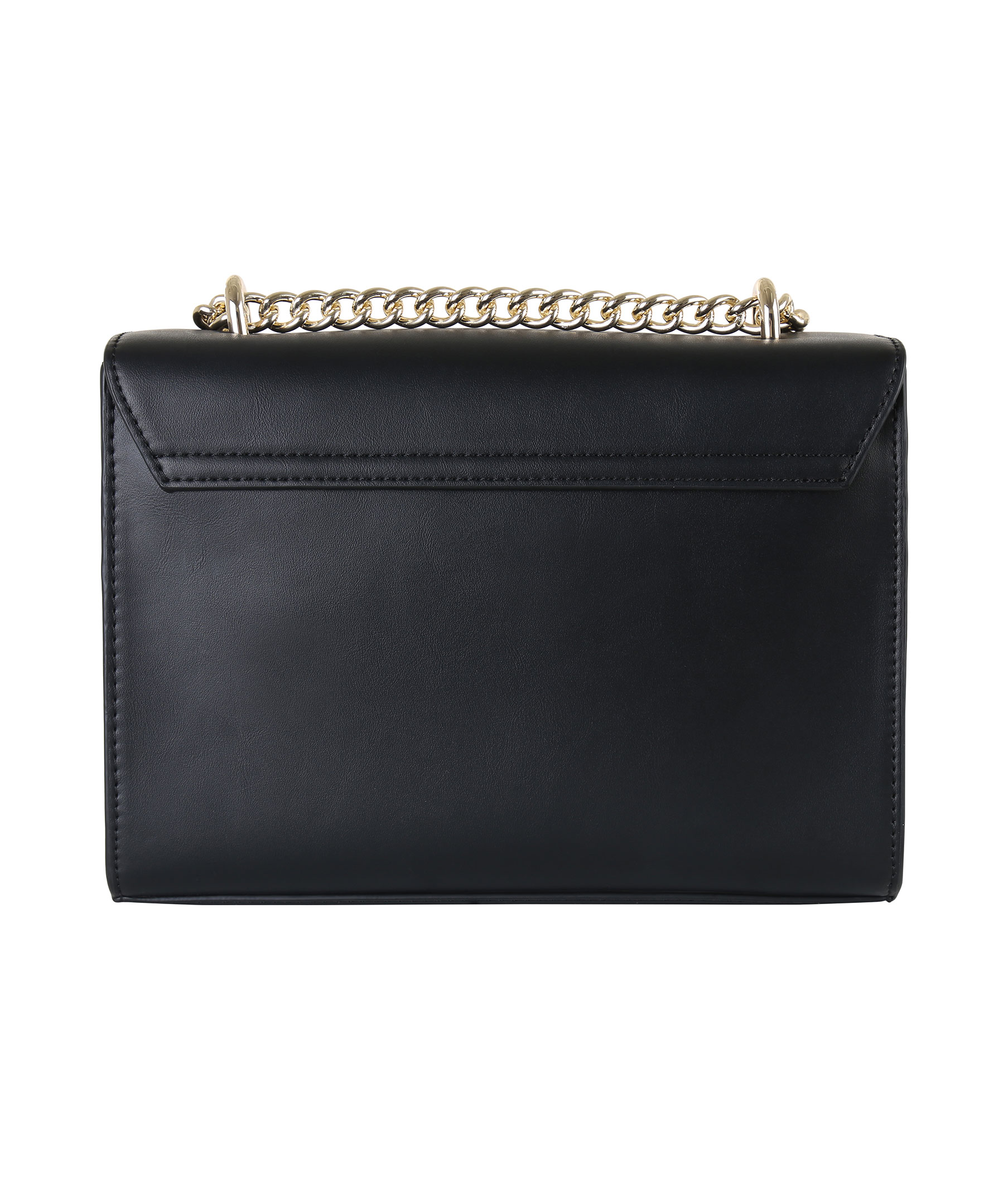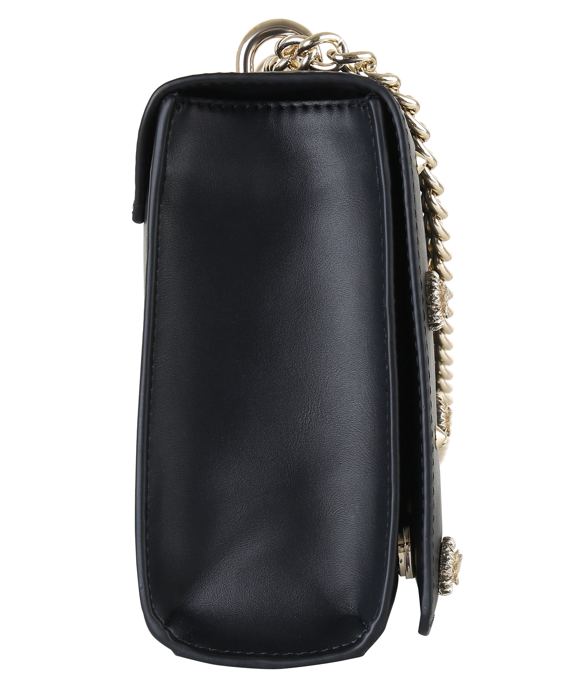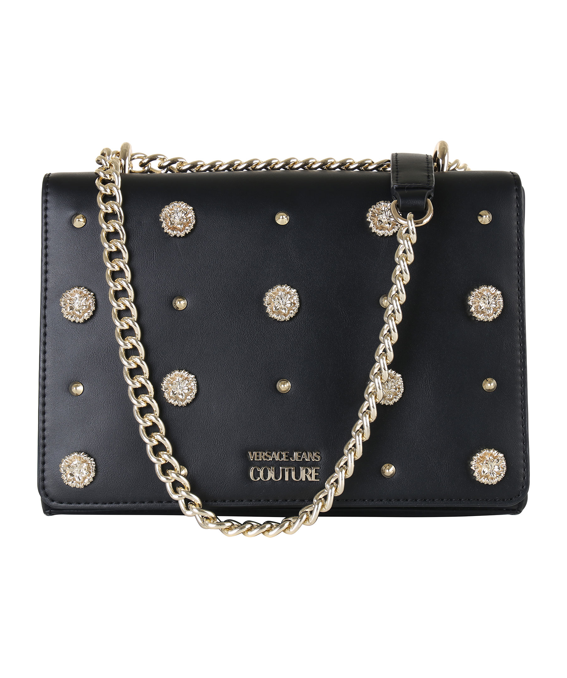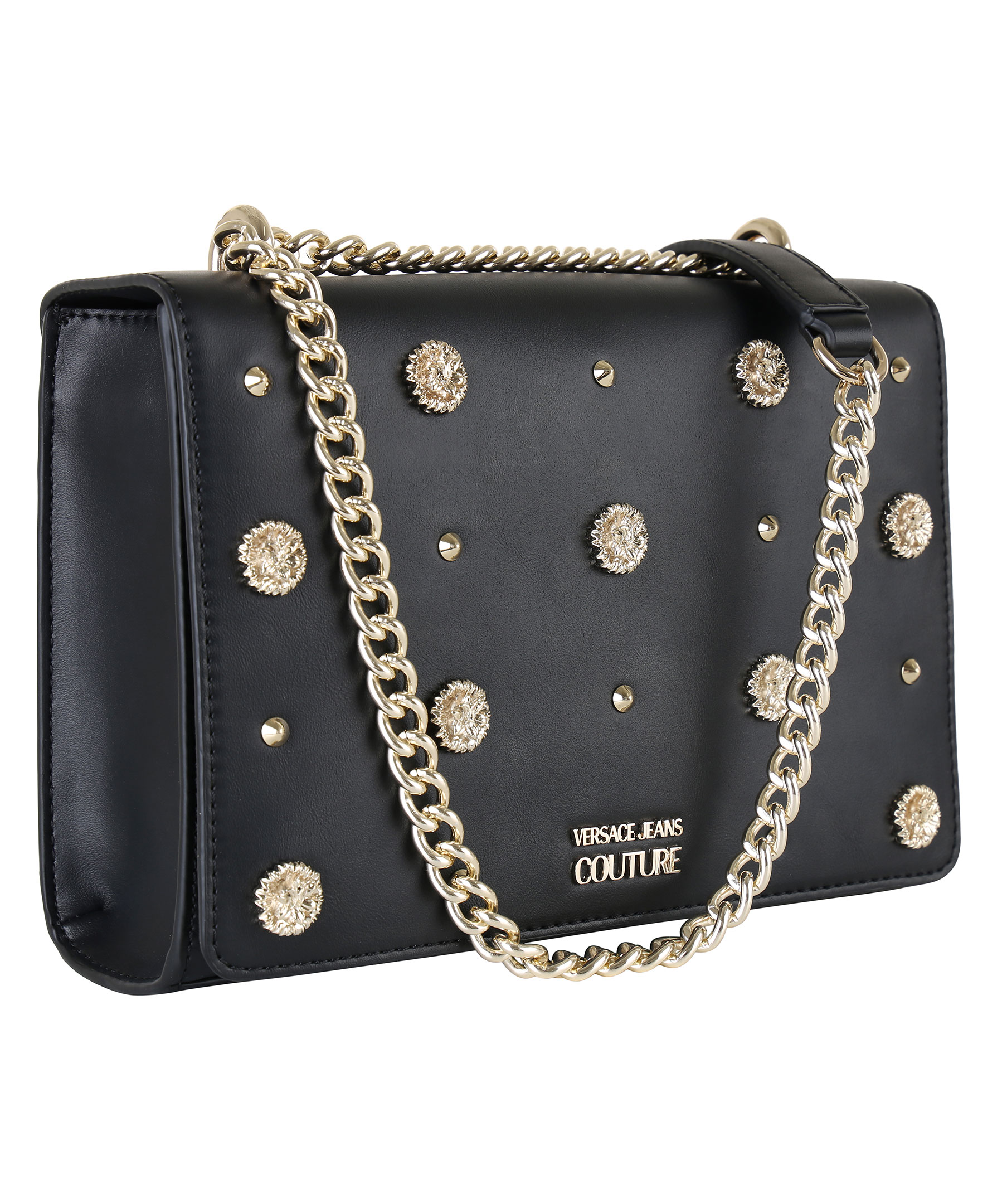 Svart handväska från Versace Jeans Couture. Tillverkad i syntetiskt skinn. Nitar och blom-detaljer i metall framtill. Två invändiga fickor, magnetlås och guldfärgat axelband i metall.