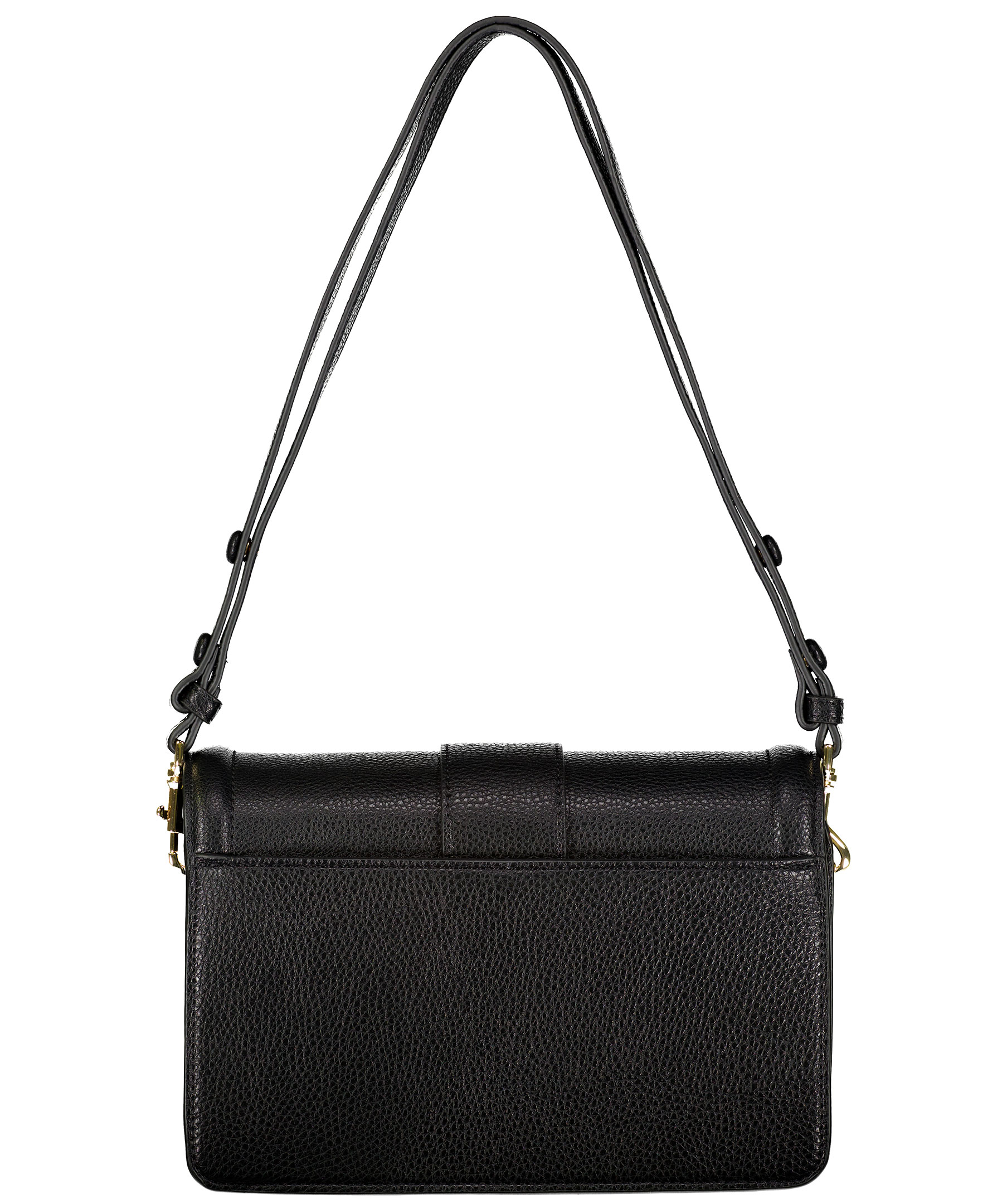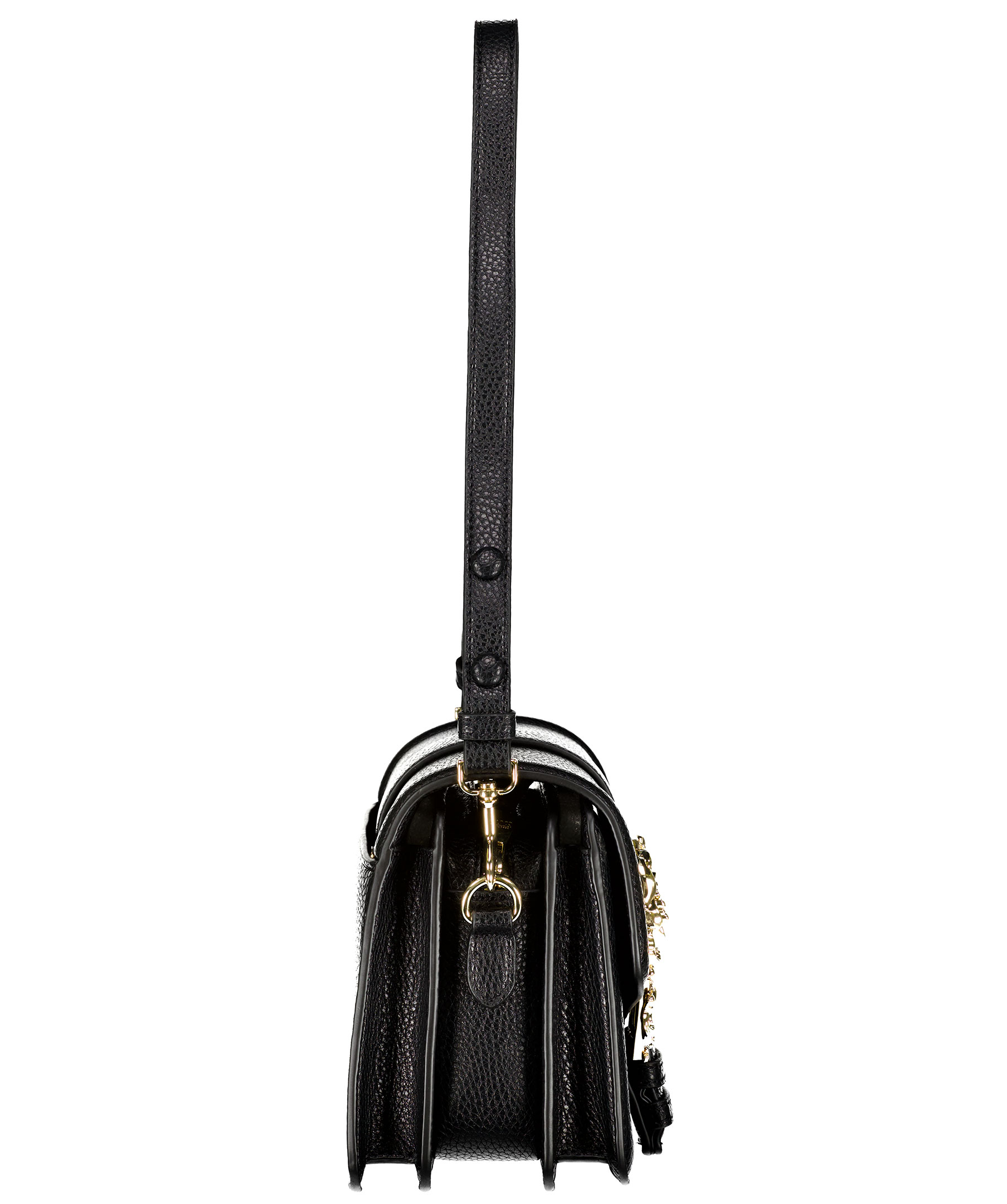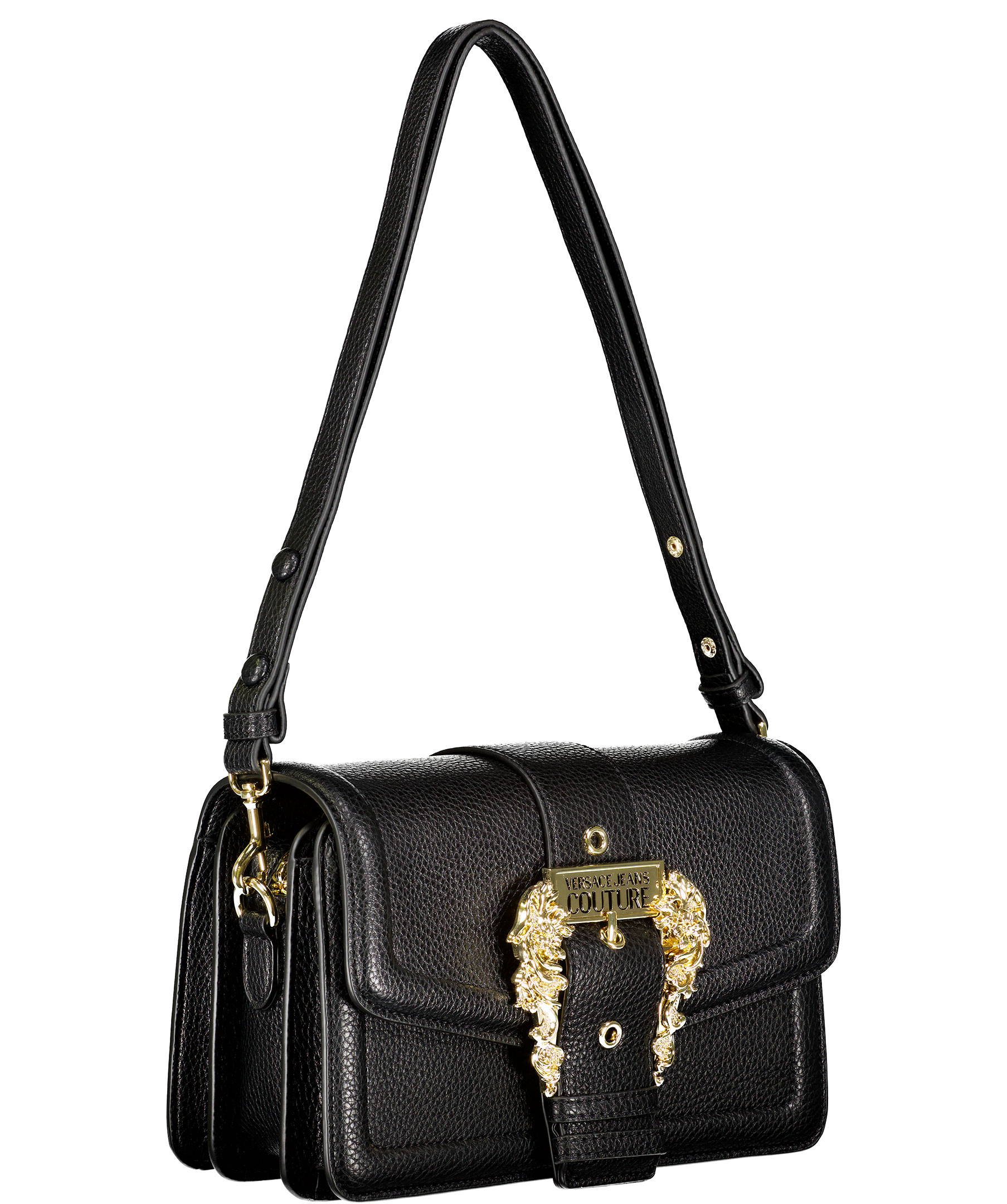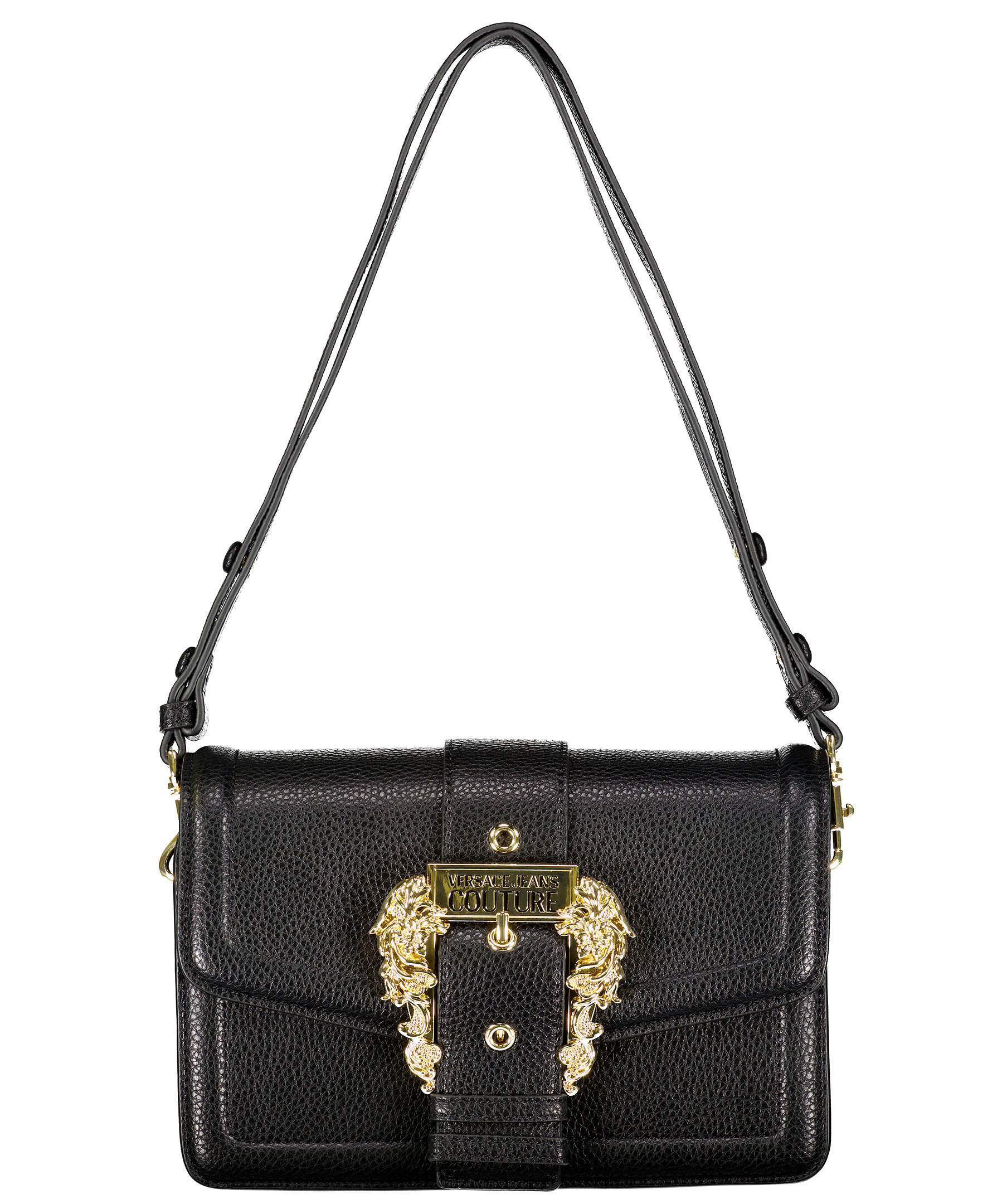 Svart handväska från Versace Jeans Couture. Tillverkad i konstskinn, guldfärgade detaljer. Tredelat mittenfack varav ett stängs med dragkedja, löstagbart axelband.