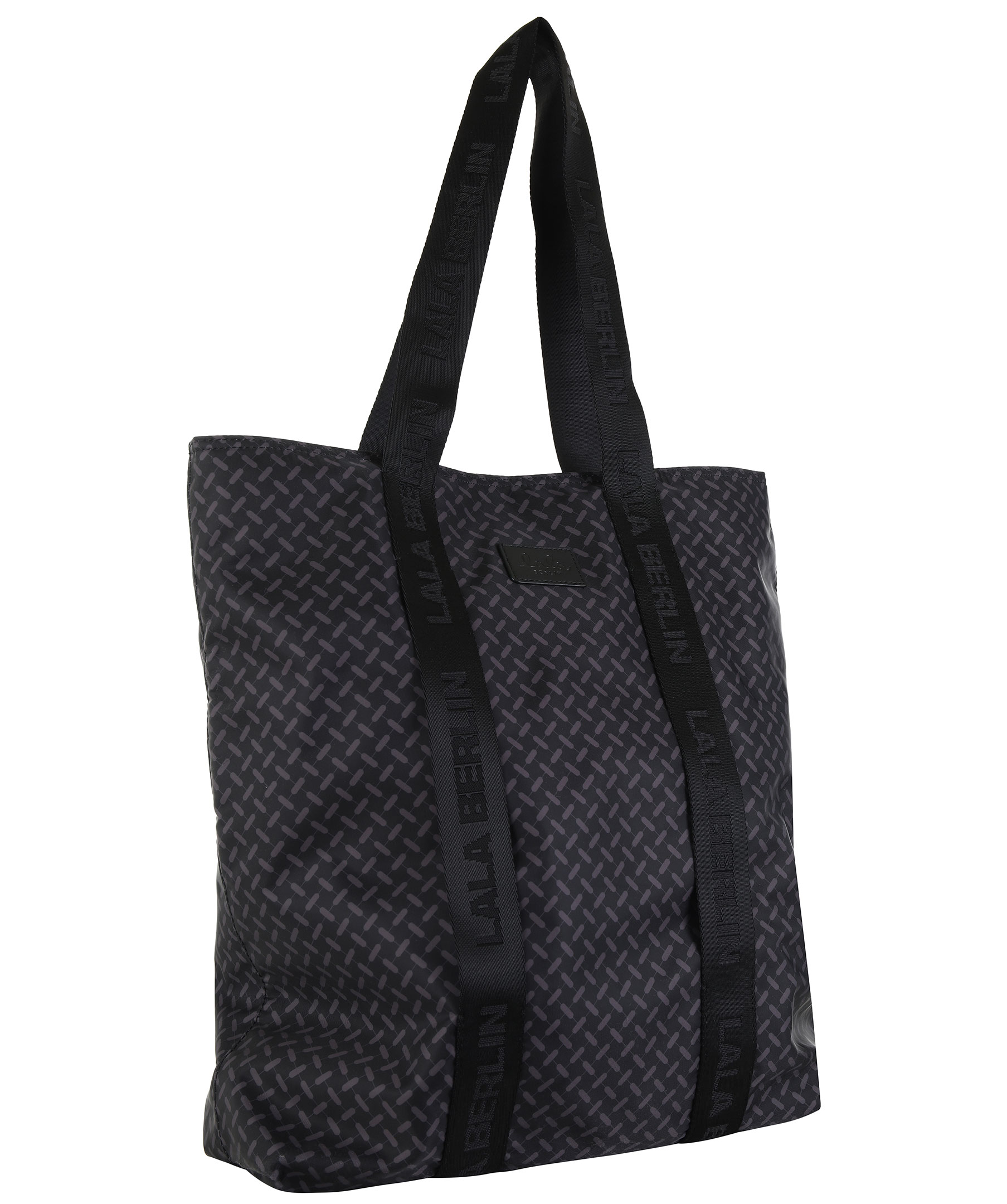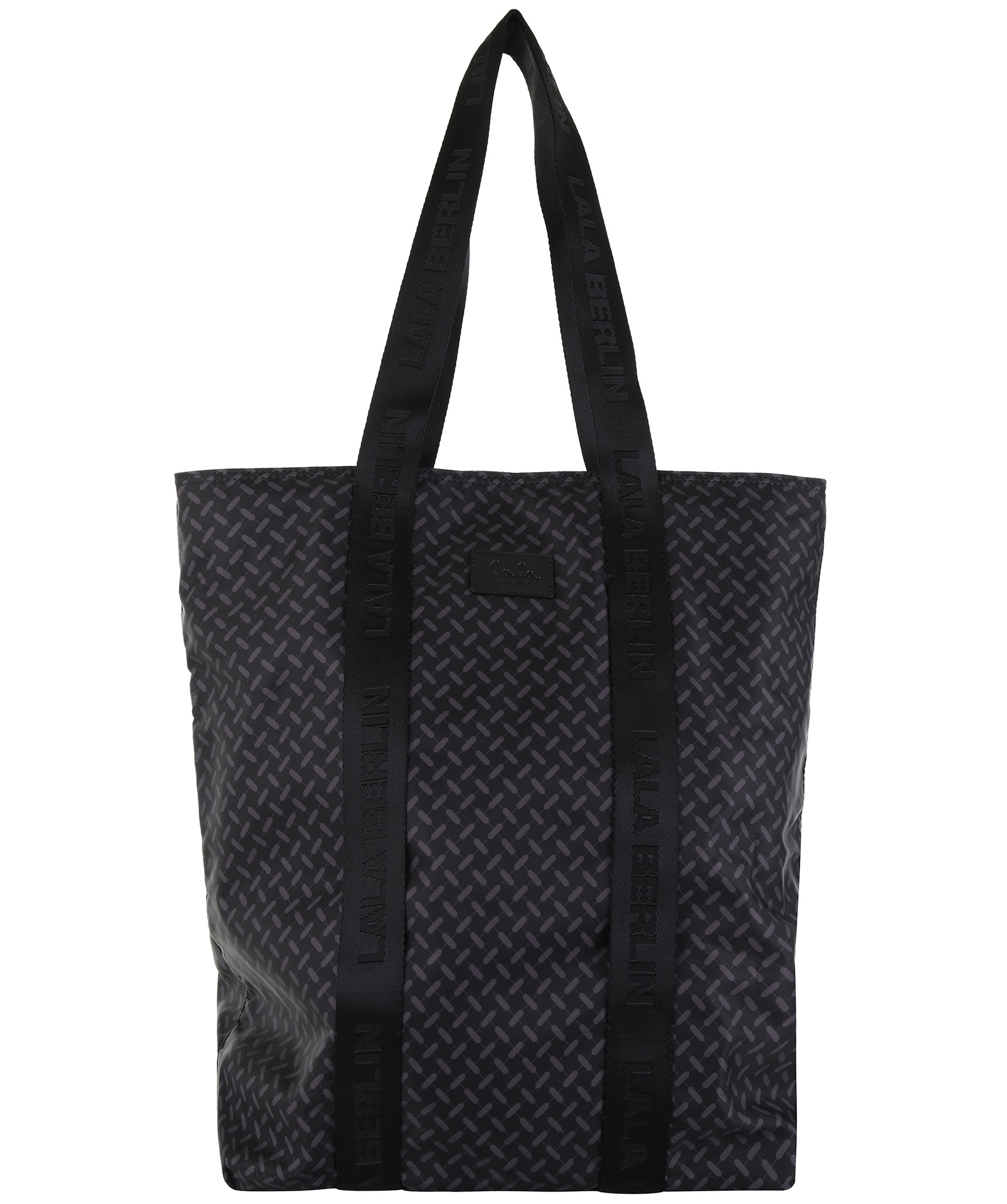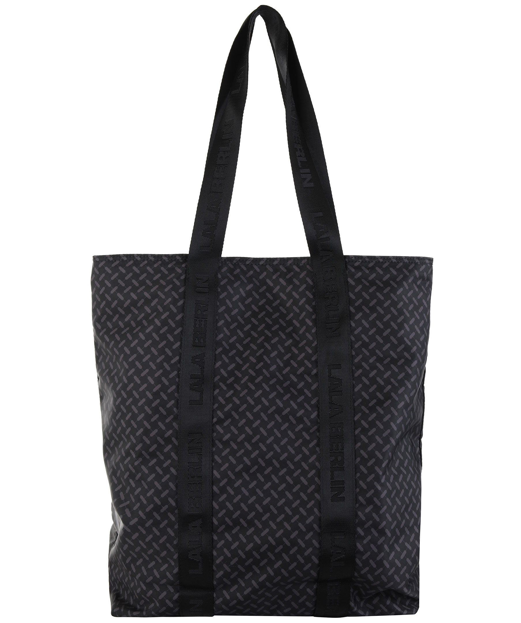 Svart, mönstrad tote bag från La La Berlin. Tillverkad i nylon. Breda band med "La La Berlin" text, svart logotyp framtill, ett fack med dragkedja på insidan.