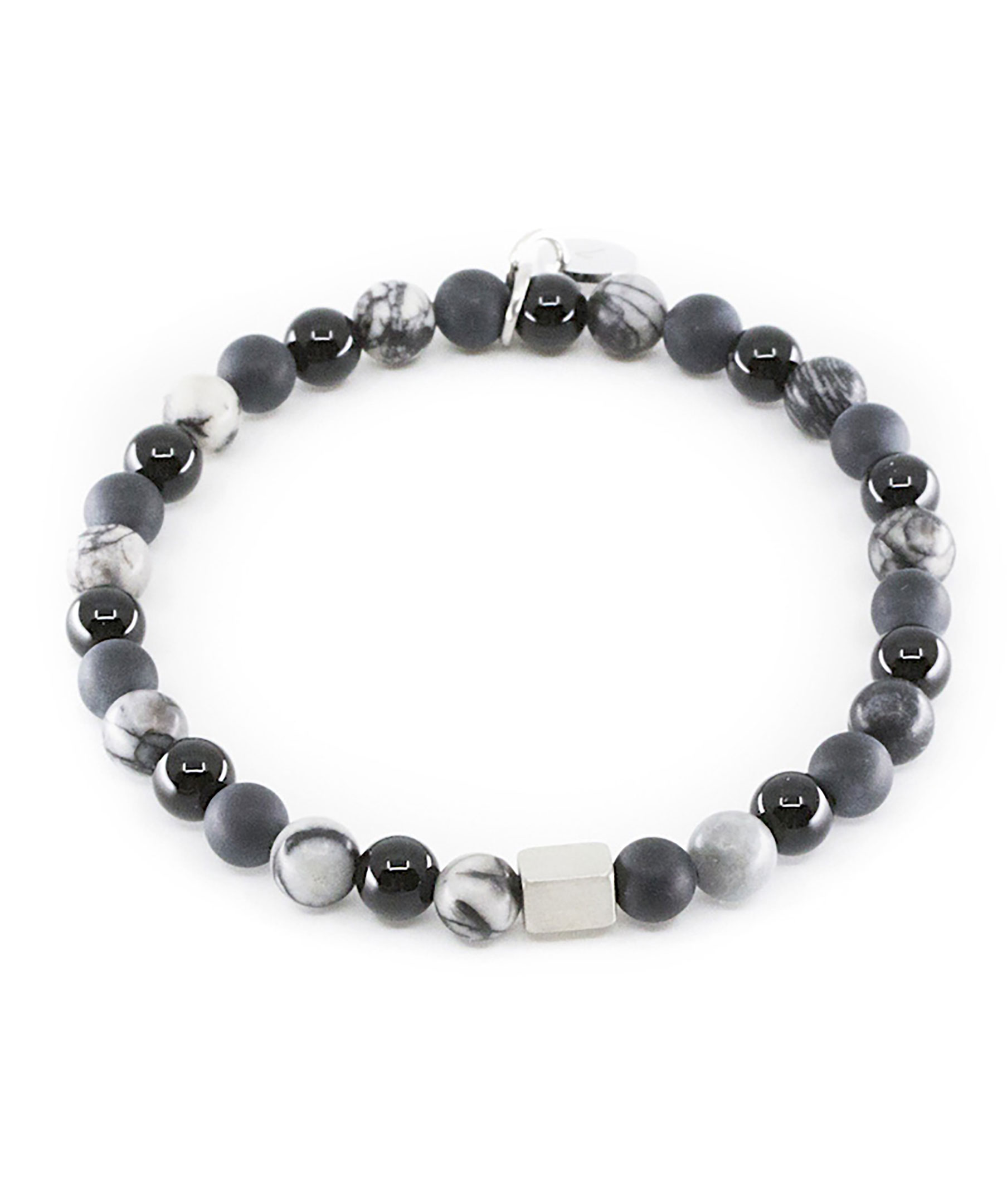 Pärlarmband från Seven/East. Tillverkad med ädelstenarna matt svart onyx, blank svart onyx och network agate som är mattslipad. Detaljer av rostfritt stål. Omkrets ca 19 cm.