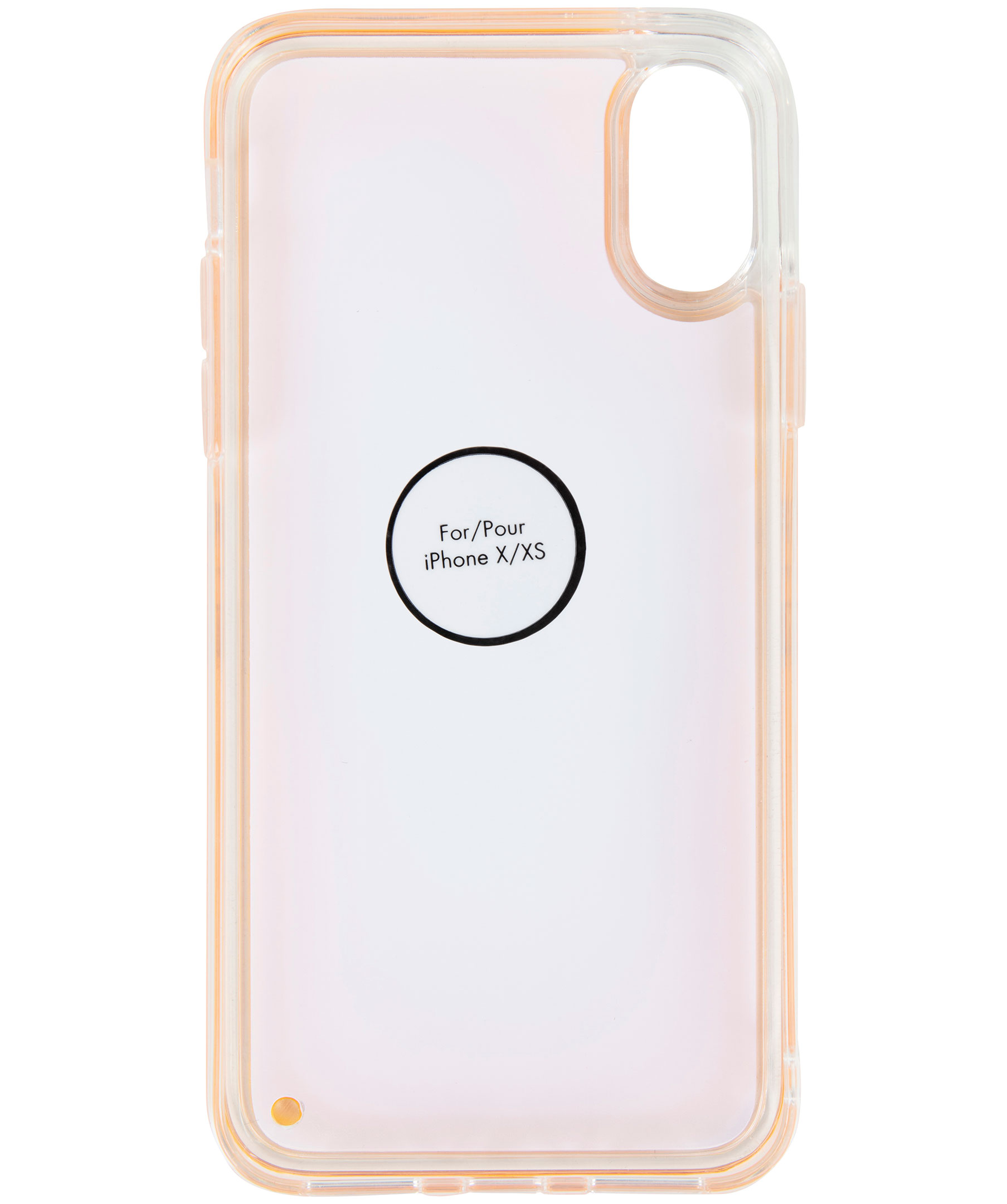 Mobilskal som passar Iphone X och Iphone XS från Kenzo. Transparanta kanter med guldig och oljefärgad logga tryckt på skalets baksida. Flytande orange färgpulver i skalet som lyser i mörkret och rör sig när du rör telefonen.
