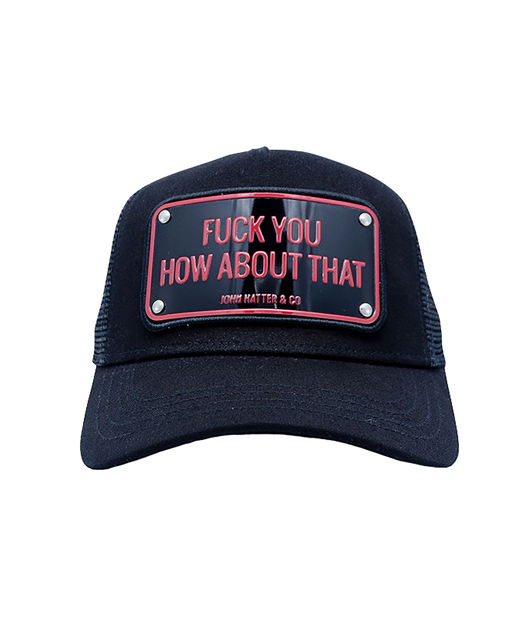 Svart keps från John Hatter. Svart skylt med texten: Fuck you how about that i rött på framsidan. Inspirerad av den klassiska truckerkepsen och är tillverkad av bomull och polyester. Den platta skärmen skyddar ditt ansikte från solen medan baksidan av nät ger en bra andningsförmåga. Snapback-stängning som är justerbar i storlek, vilket gör detta till en basebollkeps i en storlek som passar alla.
