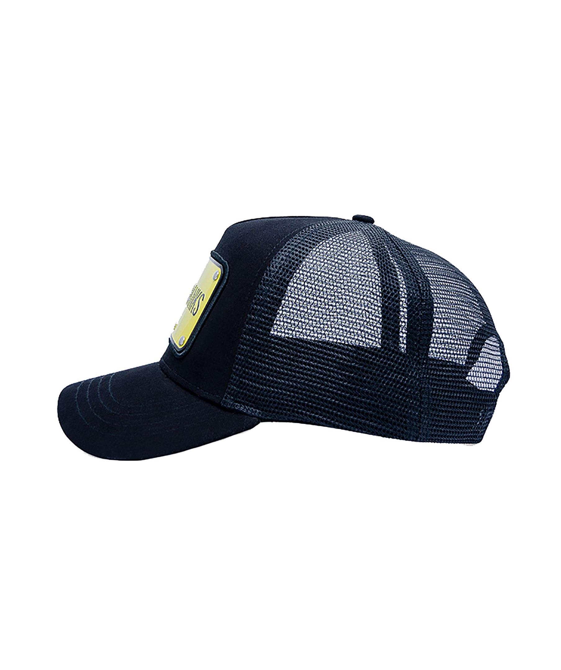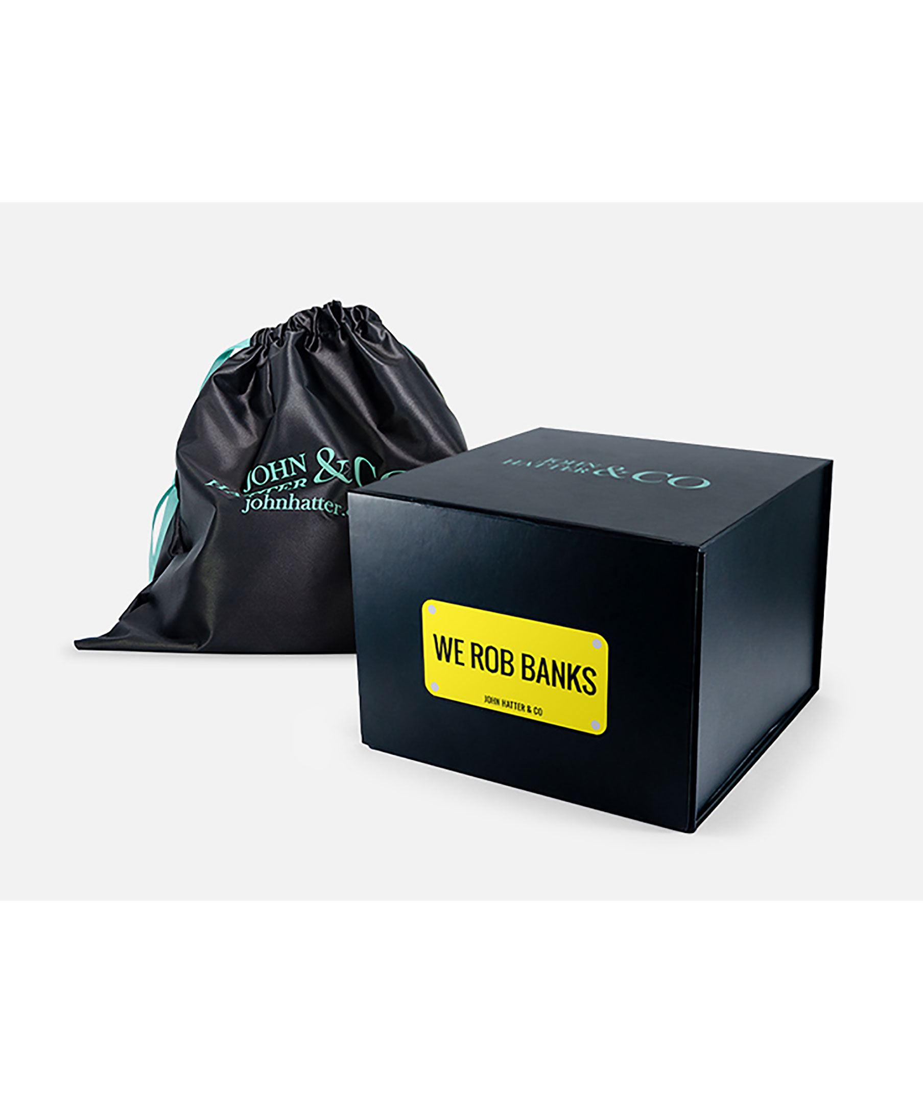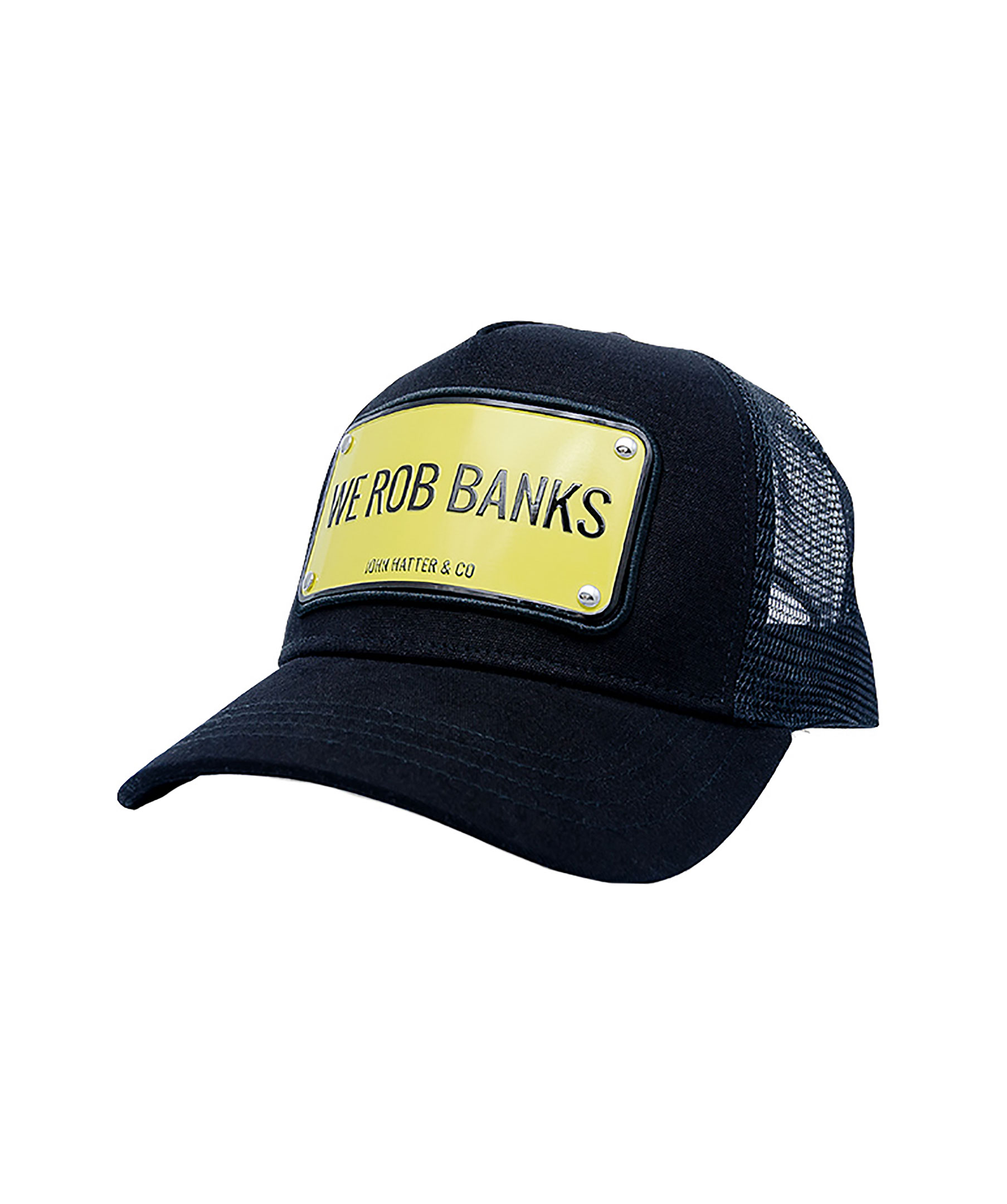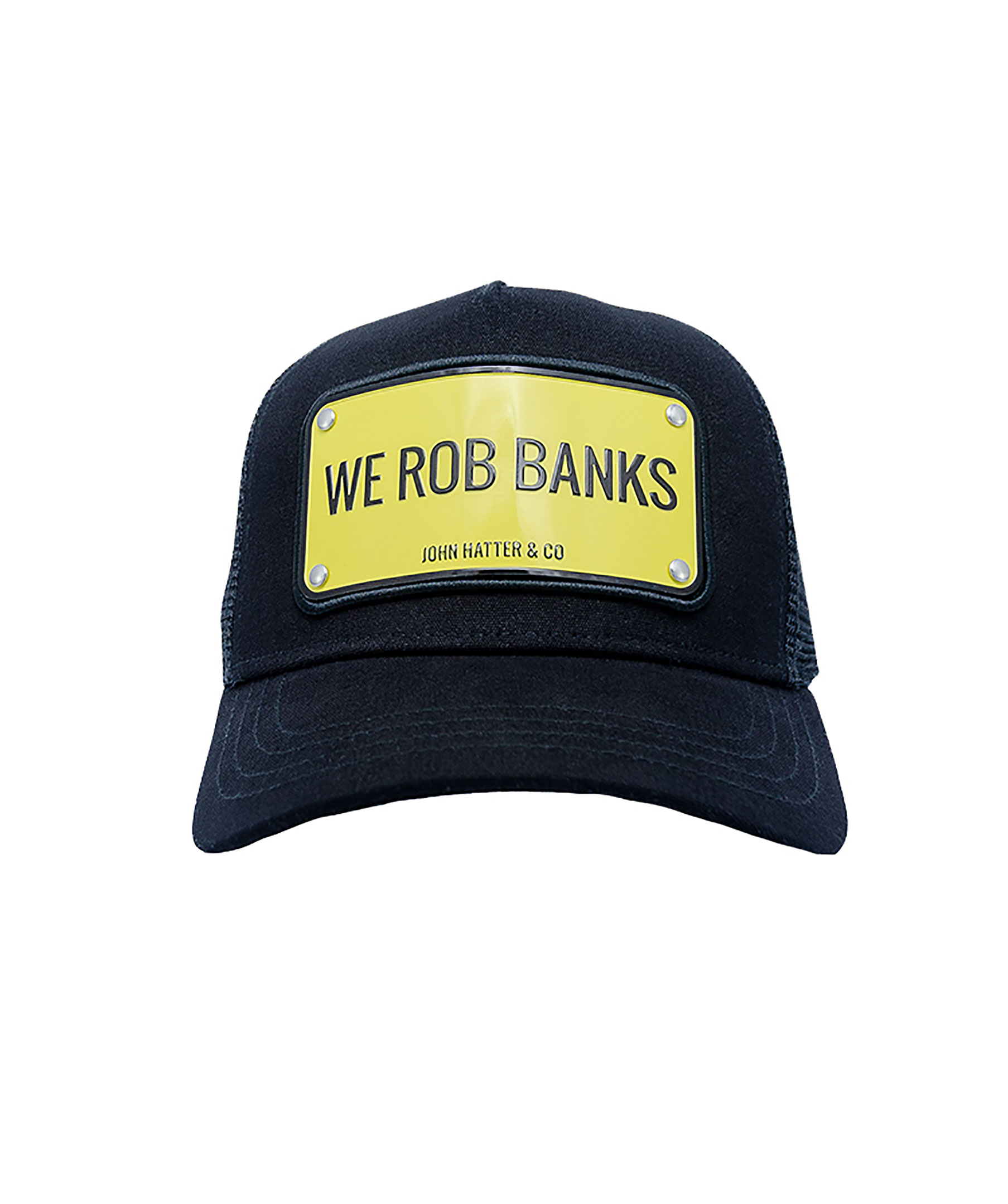 Svart keps från John Hatter. Gul skylt med texten We rob banks i svart på framsidan. Inspirerad av den klassiska truckerkepsen och är tillverkad av bomull och polyester. Den platta skärmen skyddar ditt ansikte från solen medan baksidan av nät ger en bra andningsförmåga. Snapback-stängning som är justerbar i storlek, vilket gör detta till en basebollkeps i en storlek som passar alla.