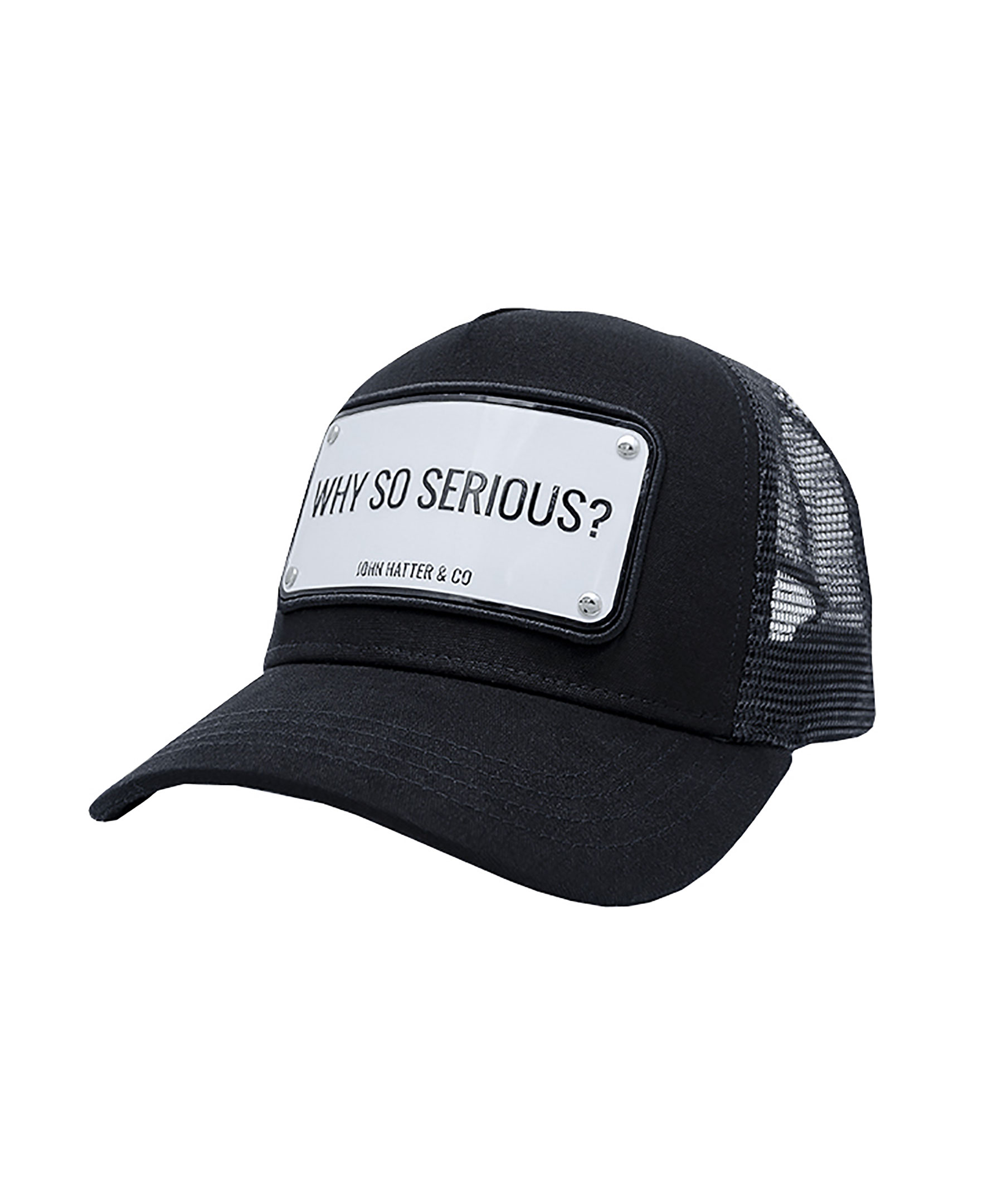 Svart keps från John Hatter. Vit skylt med texten Why so serious? i svart på framsidan. Inspirerad av den klassiska truckerkepsen och är tillverkad av bomull och polyester. Den platta skärmen skyddar ditt ansikte från solen medan baksidan av nät ger en bra andningsförmåga. Snapback-stängning som är justerbar i storlek, vilket gör detta till en basebollkeps i en storlek som passar alla. * Snapback stängning * Truckermodell * Platta med text på framsidan