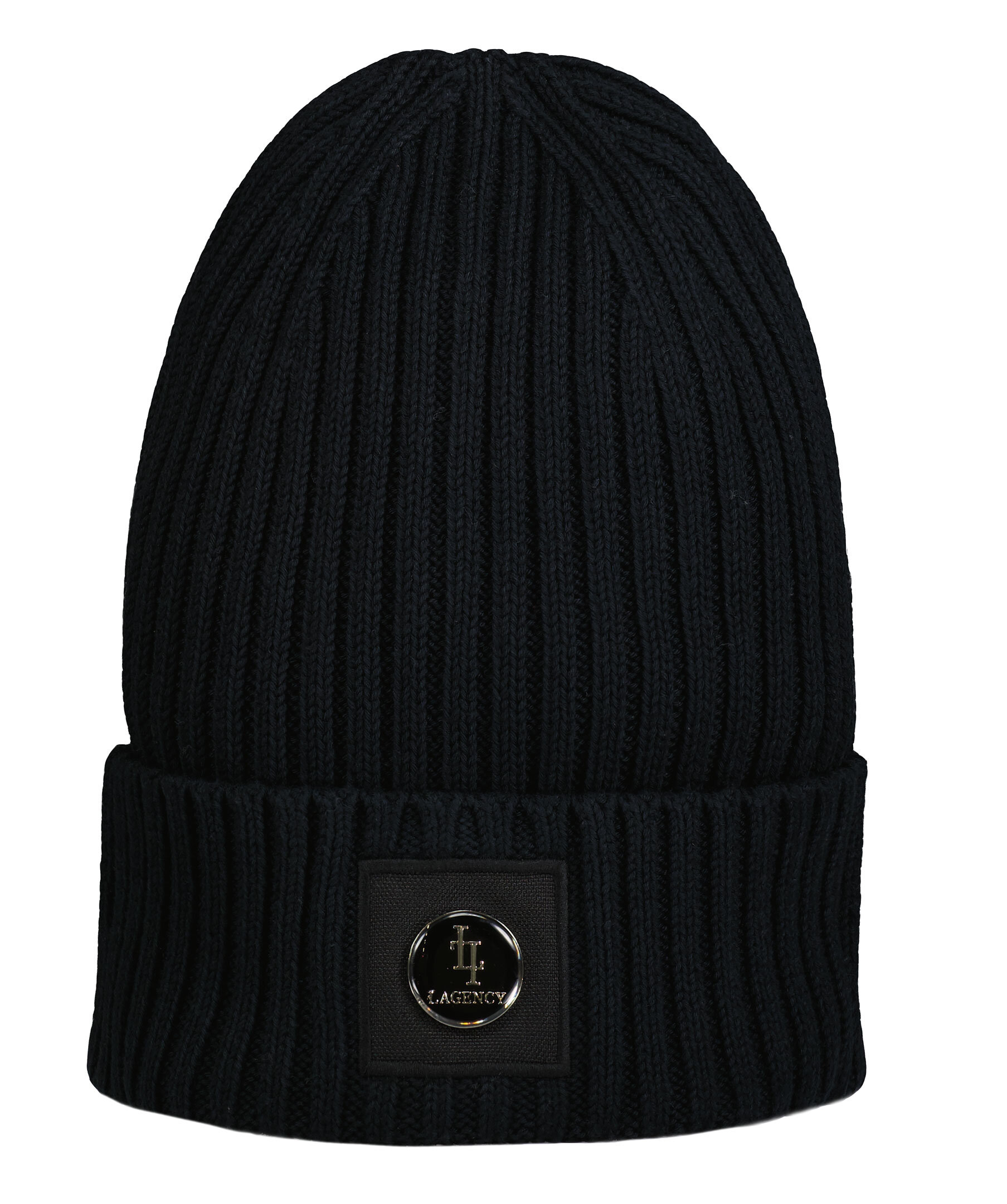 Svart ribbstickad mössa från Lagency. Tillverkad i 100% Bomull. Uppvikt kant med logotyp i metall.