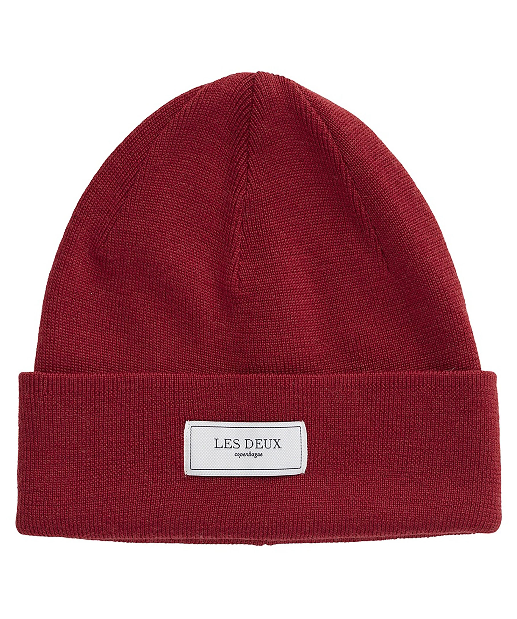 Vinröd mössa från Les Deux gjord i merino ull. Tygpatch med logotyp på framsidan.