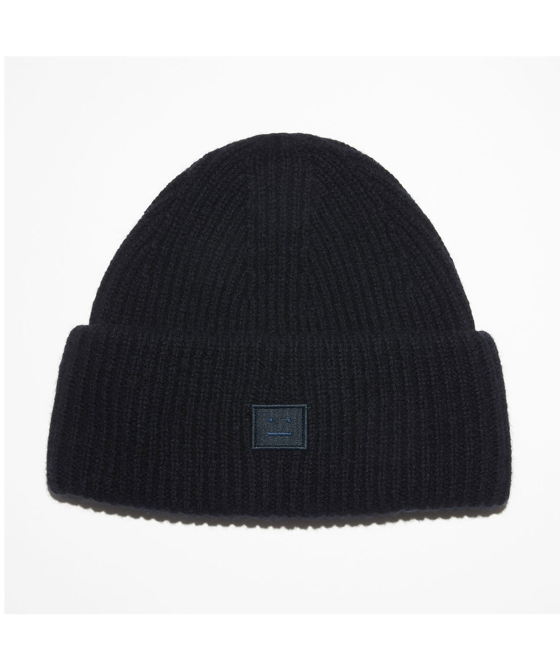 Svart ribbstickad mössa från Acne Studios. Uppåtvänd kant samt logotyplapp på framsidan. Tillverkade i tjock ull.