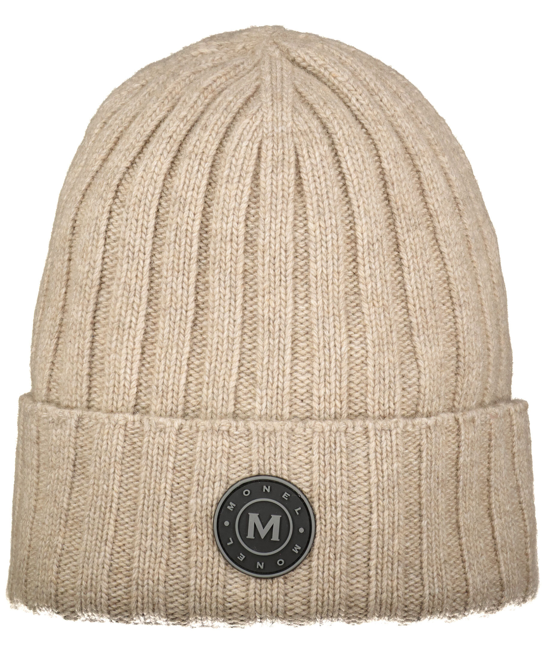 Beige ribbstickad mössa från Monel. Uppvikt kant och logotyp fram. Tillverkad i ull och kashmirblandning.