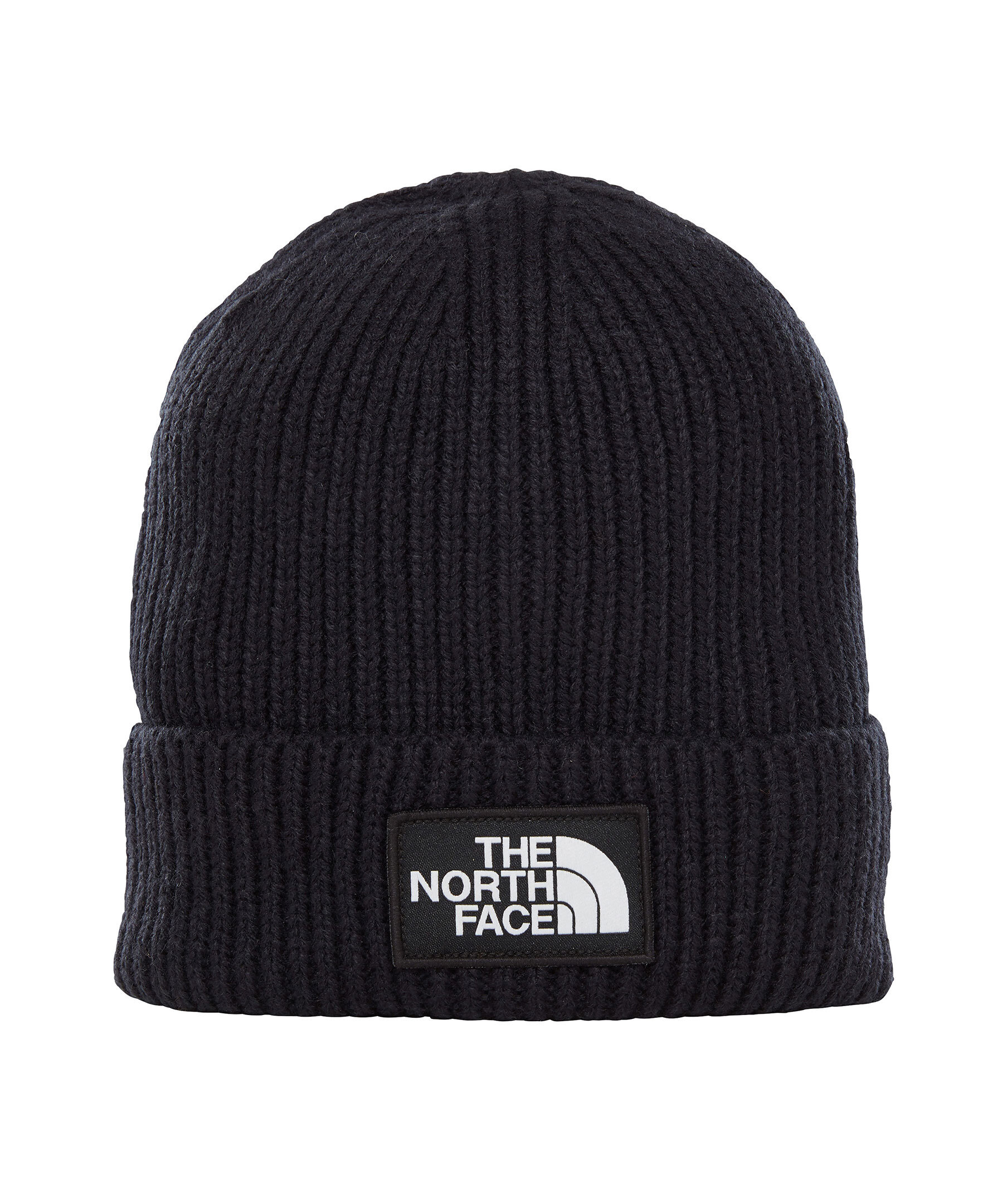 Svart ribbstickad mössa från The North Face. Tygpatch med logotyp, uppvikt kant.