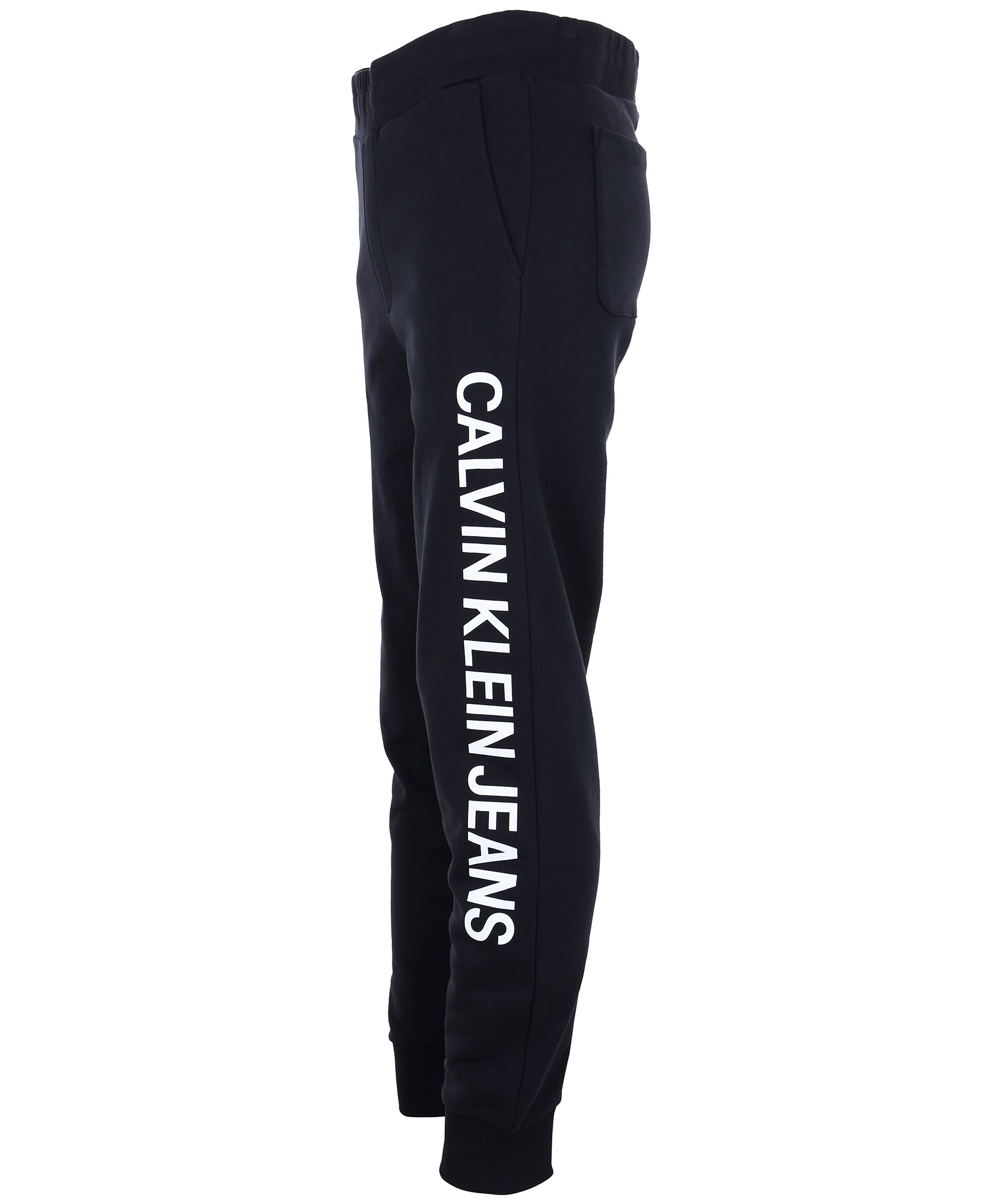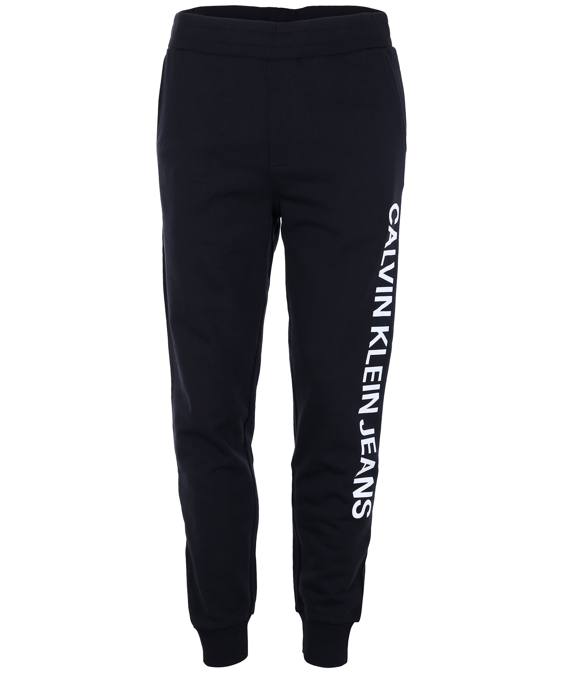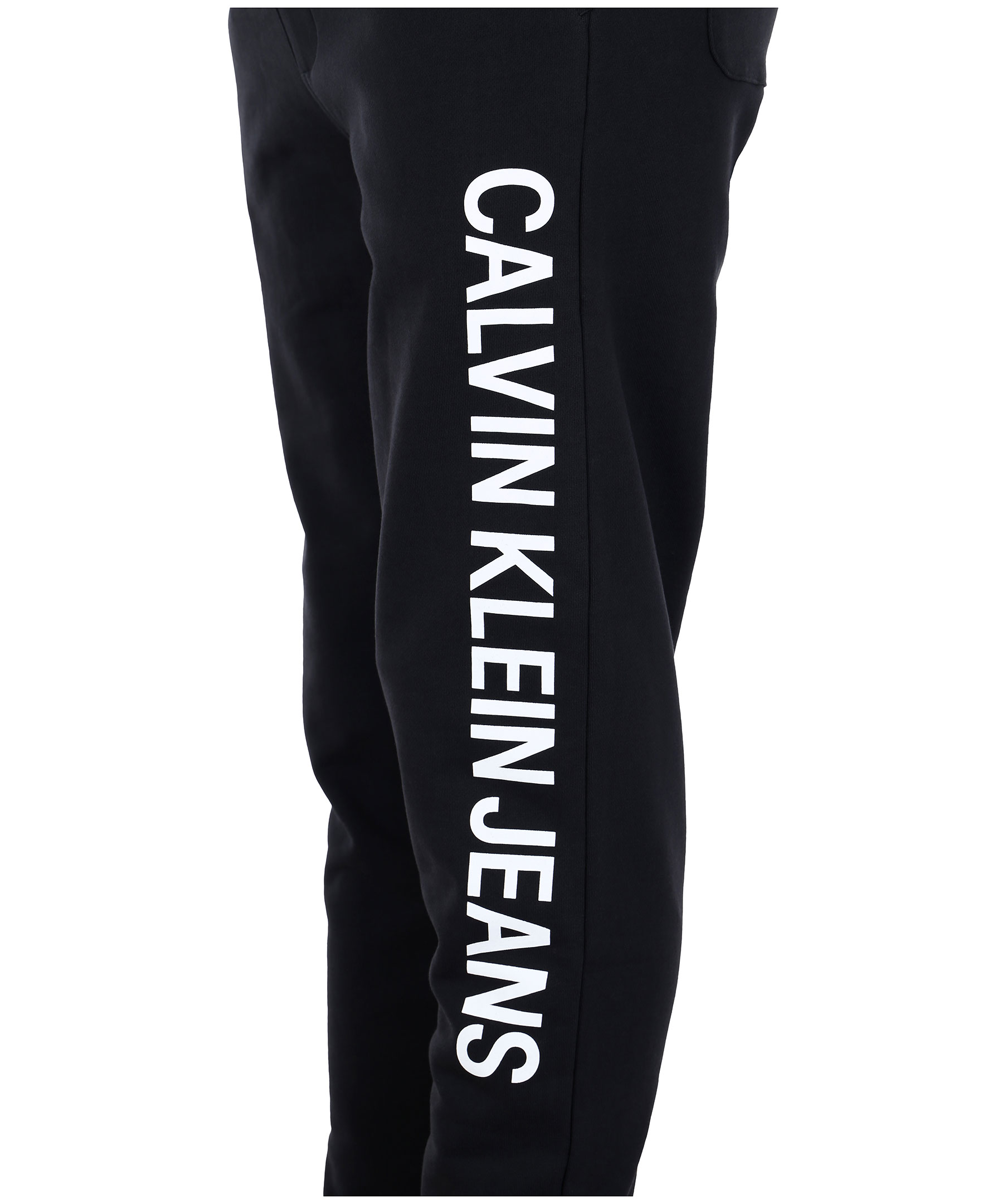 Svarta mjukisbyxor från Calvin Klein. Logotyp tryckt stort på ena byxbenet. Två framfickor och två bakfickor, ribbstickade muddar och dold snörning på insidan av byxans midja.