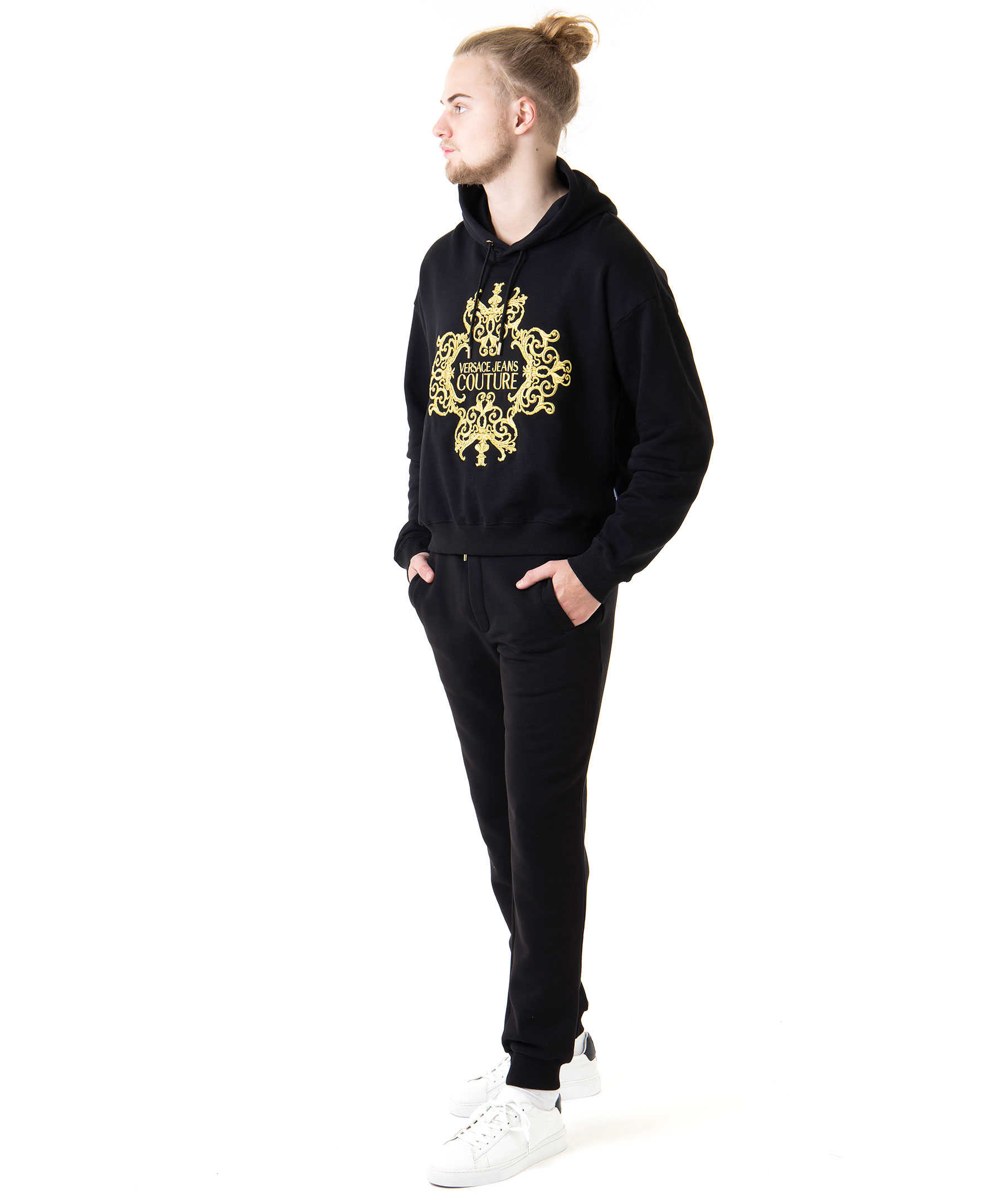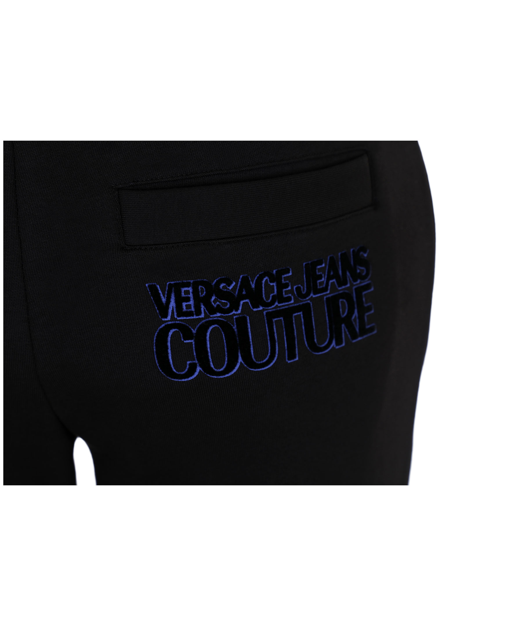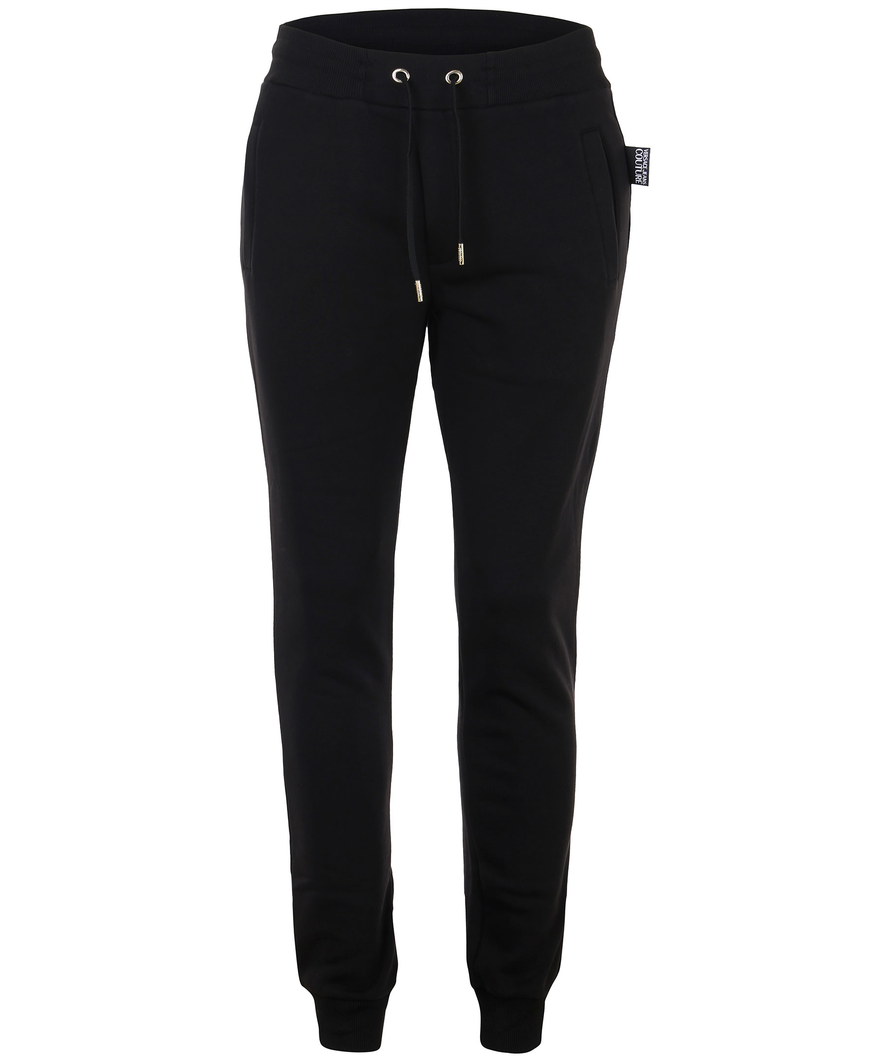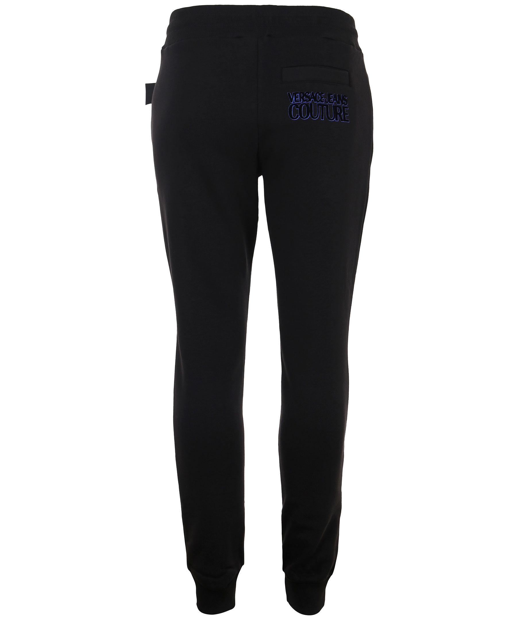 Svarta mjukisbyxor från Versace Jeans Couture. Elastiskt ribbstickat band i midjan men snörning, muddar vid benslut, två framfickor och en bakficka. Logotyp i kontrasttyg på bakfickan. Modellen är 186 cm lång och bär storlek s.