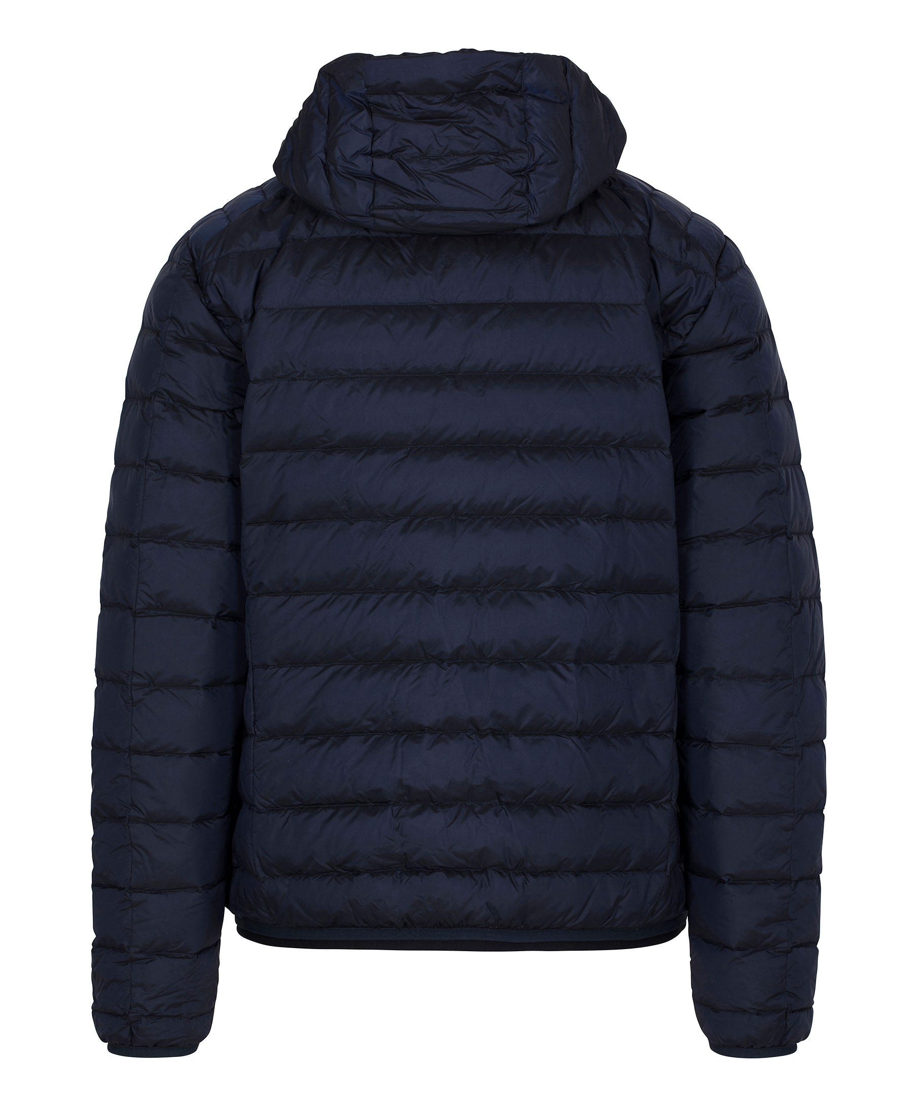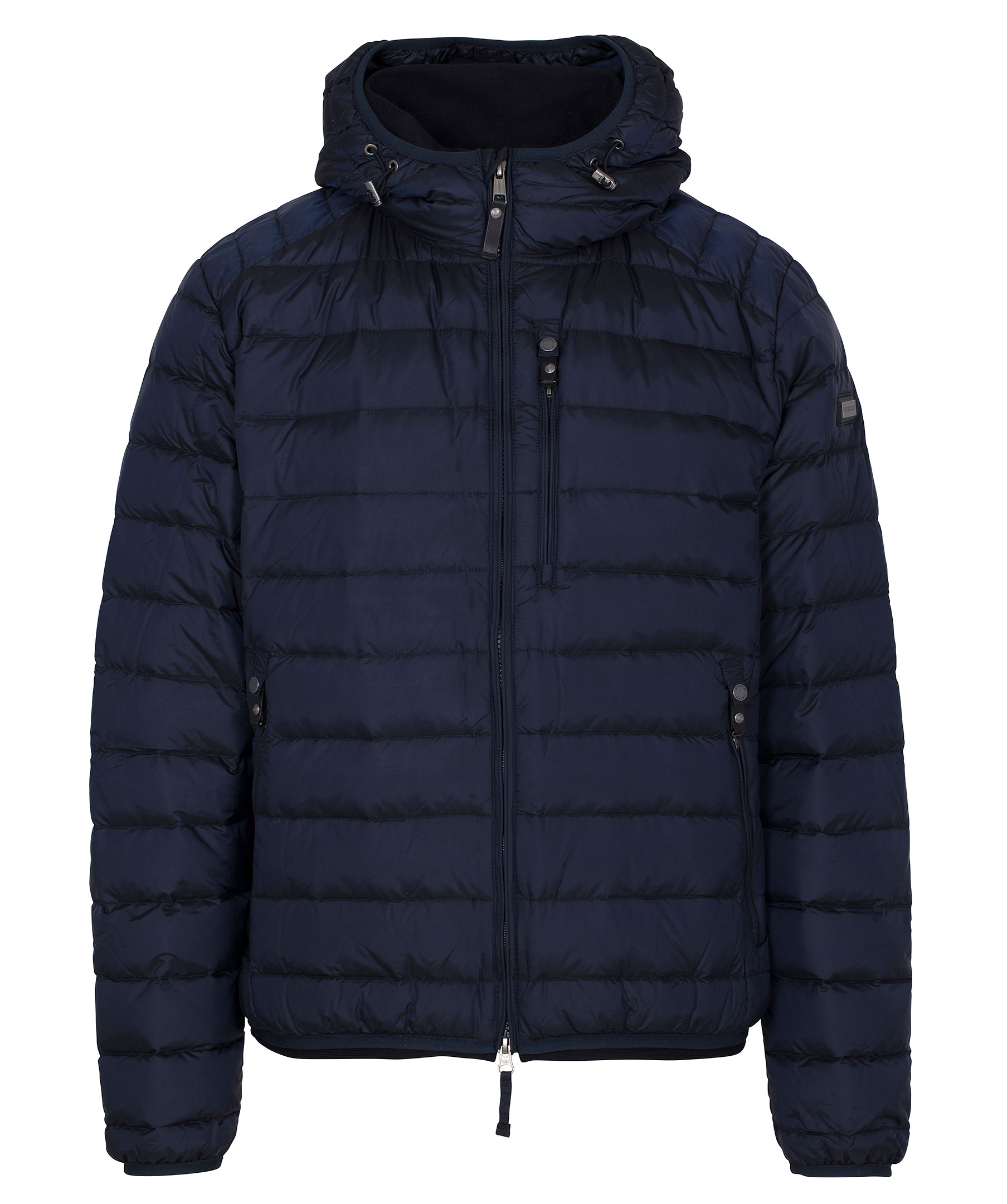 Marinblå lättviktsdunjacka från Cedrico. Tillverkad i nylon med fyllning av dun och fjäder. Jackan stängs med tvåvägsdragkedja och har en hög krage med luva som kan spännas åt med elastisk dragsko. Två framfickor och en bröstficka som stängs med dragkedja som har knapp ovanför som man kan knäppa fast dragflärpen i så att den håller sig på plats och inte åker ner. Tre innerfickor, en med dragkedja. Logga på vänster ärm samt liten mudd i ärmslut och plaggslut. Ventilationshål i armhålorna.