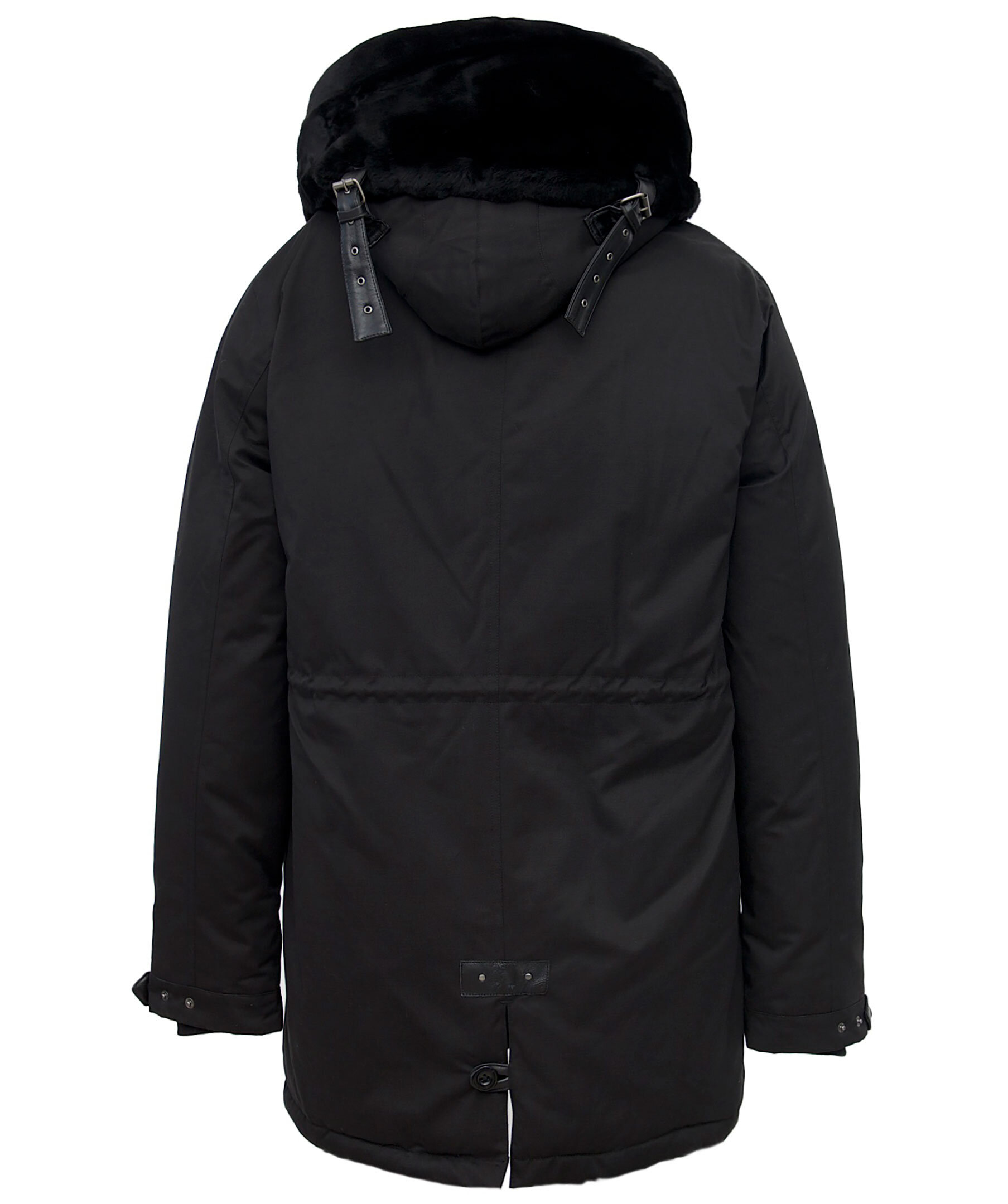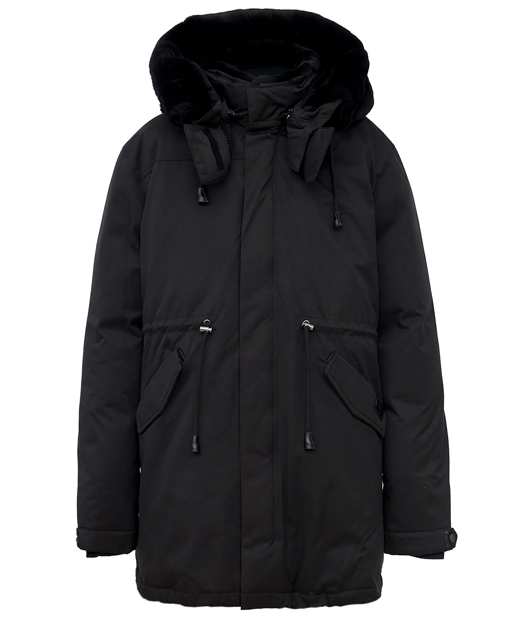 Svart dunparkas från Cedrico. Tillverkad i bomullsmix med fyllning av dun. Avtagbar luva med päls, ribbade muddar, lammskinnsdetaljer, fickor med lock och dragsko i midjan.