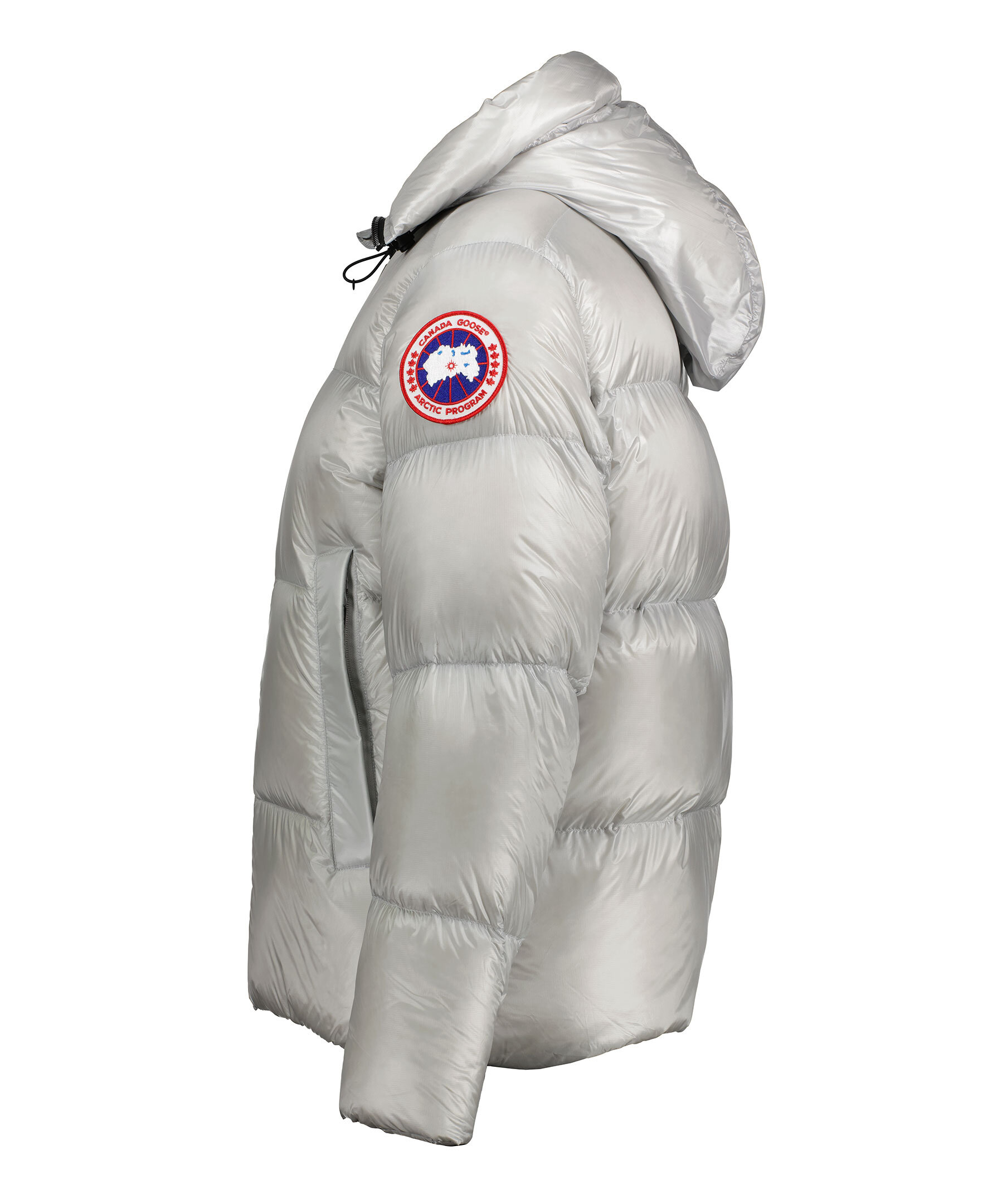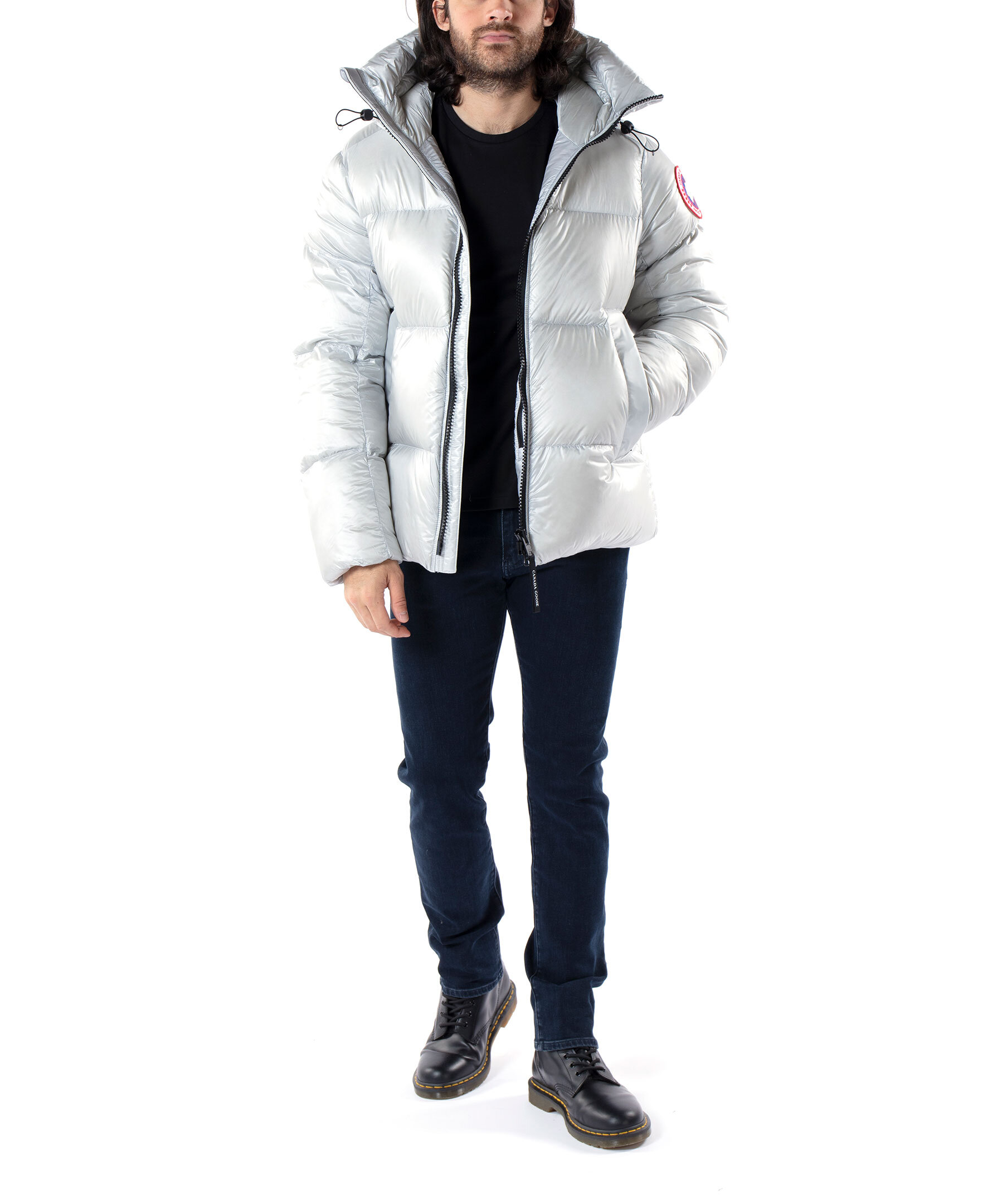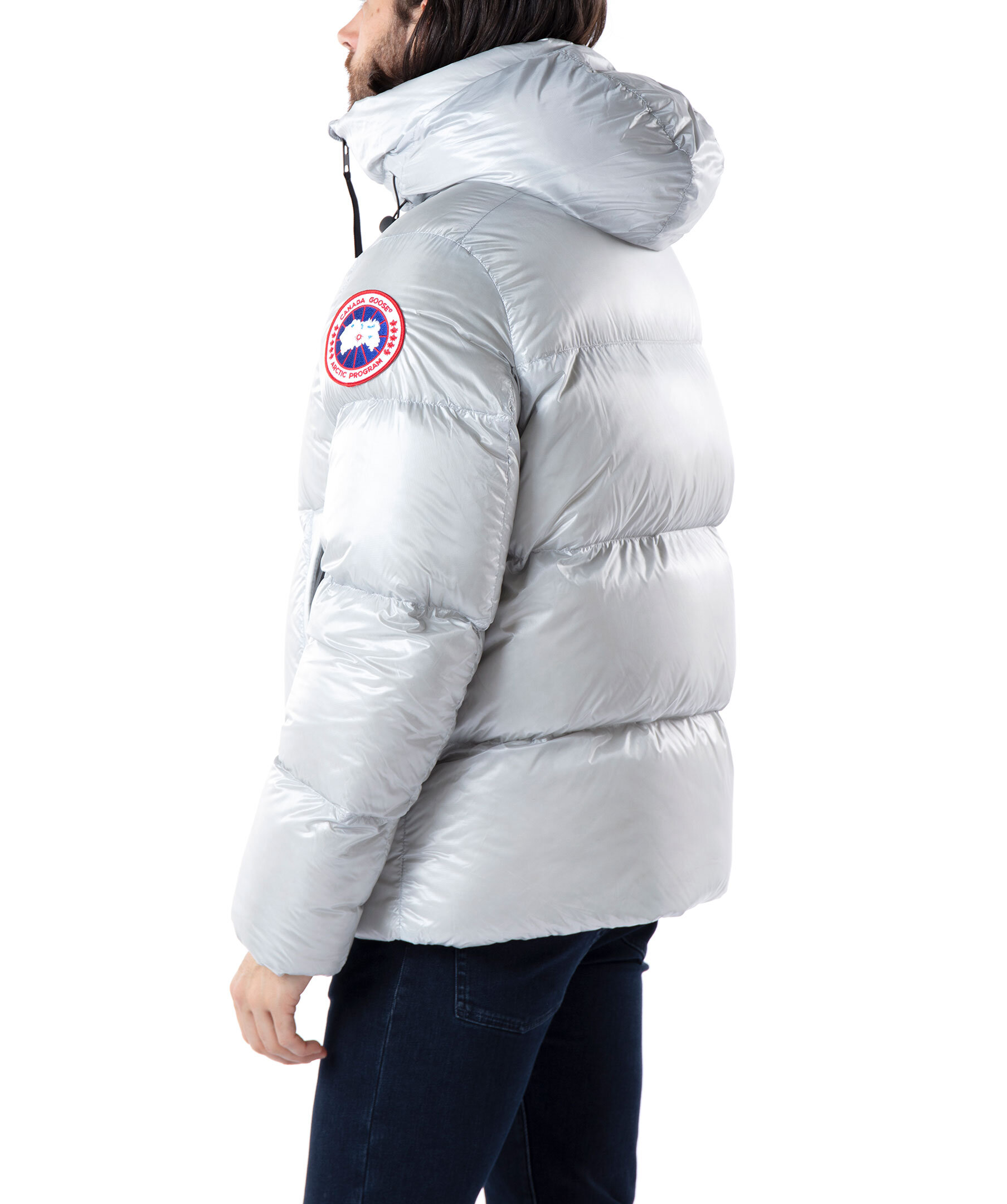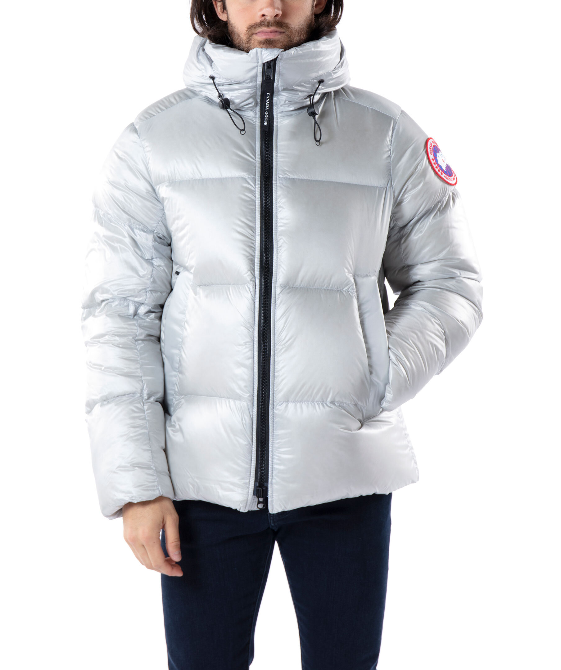 Silverfärgad dunpuffer från Canada Goose. Tre stora innerfickor. Hög krage och luva med dragsko. Jackan stängs med en tvåvägsdragkedja och har elastiska band på insidan som man kan sätta över axlarna och låta jackan hänga fritt om man vill ha den öppen. Klassisk Canada Goose logga på vänster ärm. Modellen är 185cm lång och har på sig storlek M.