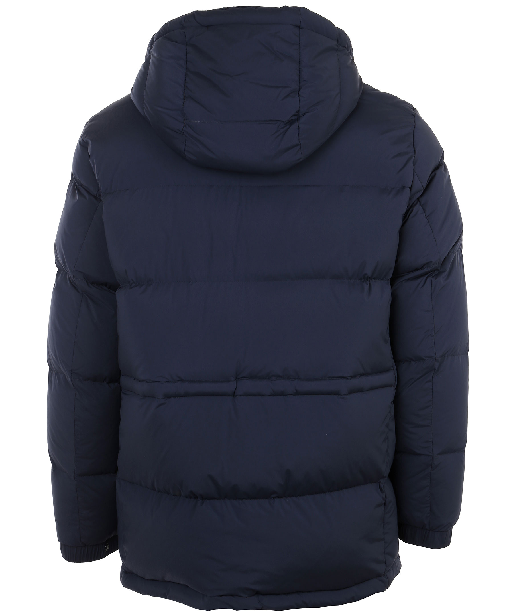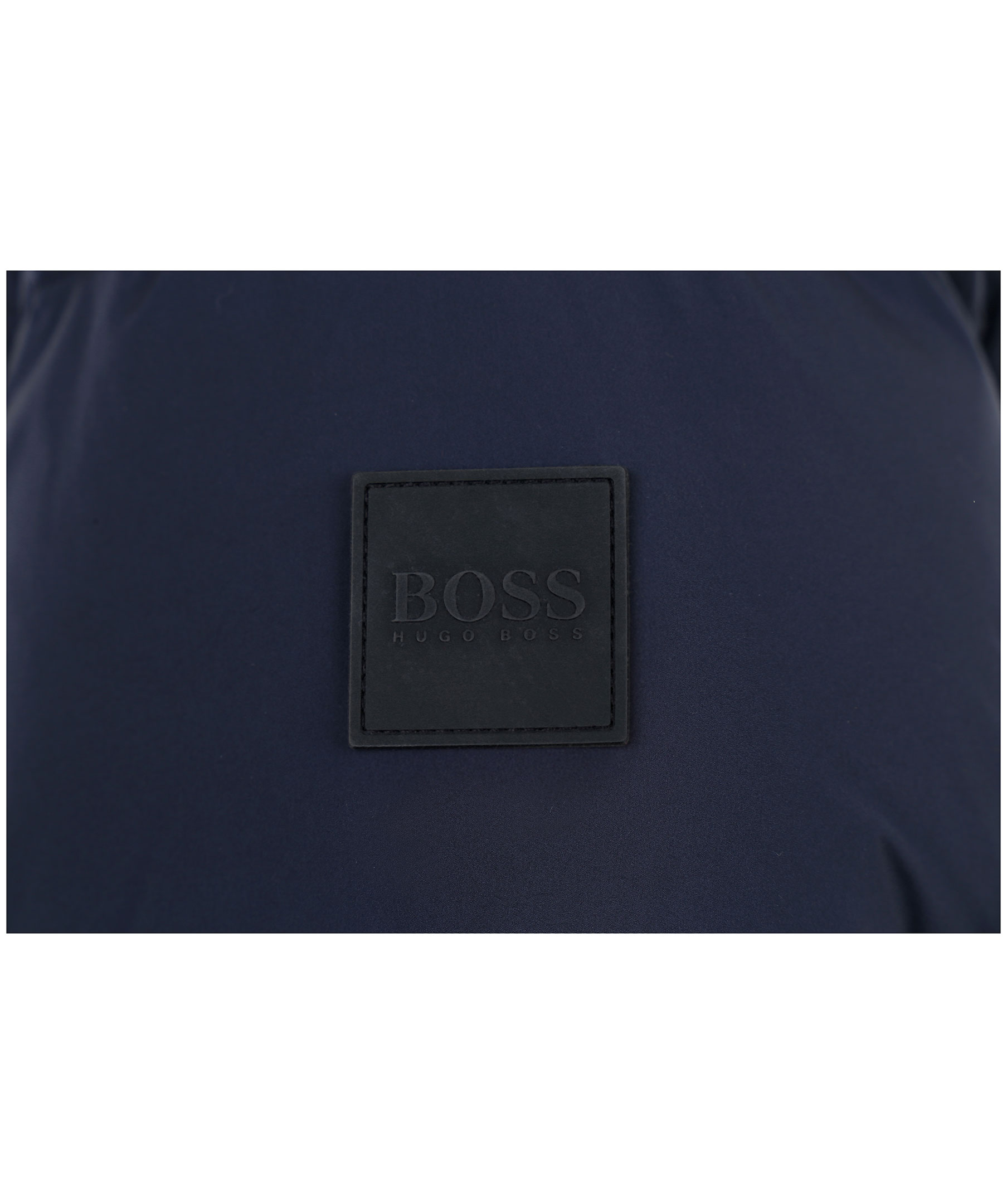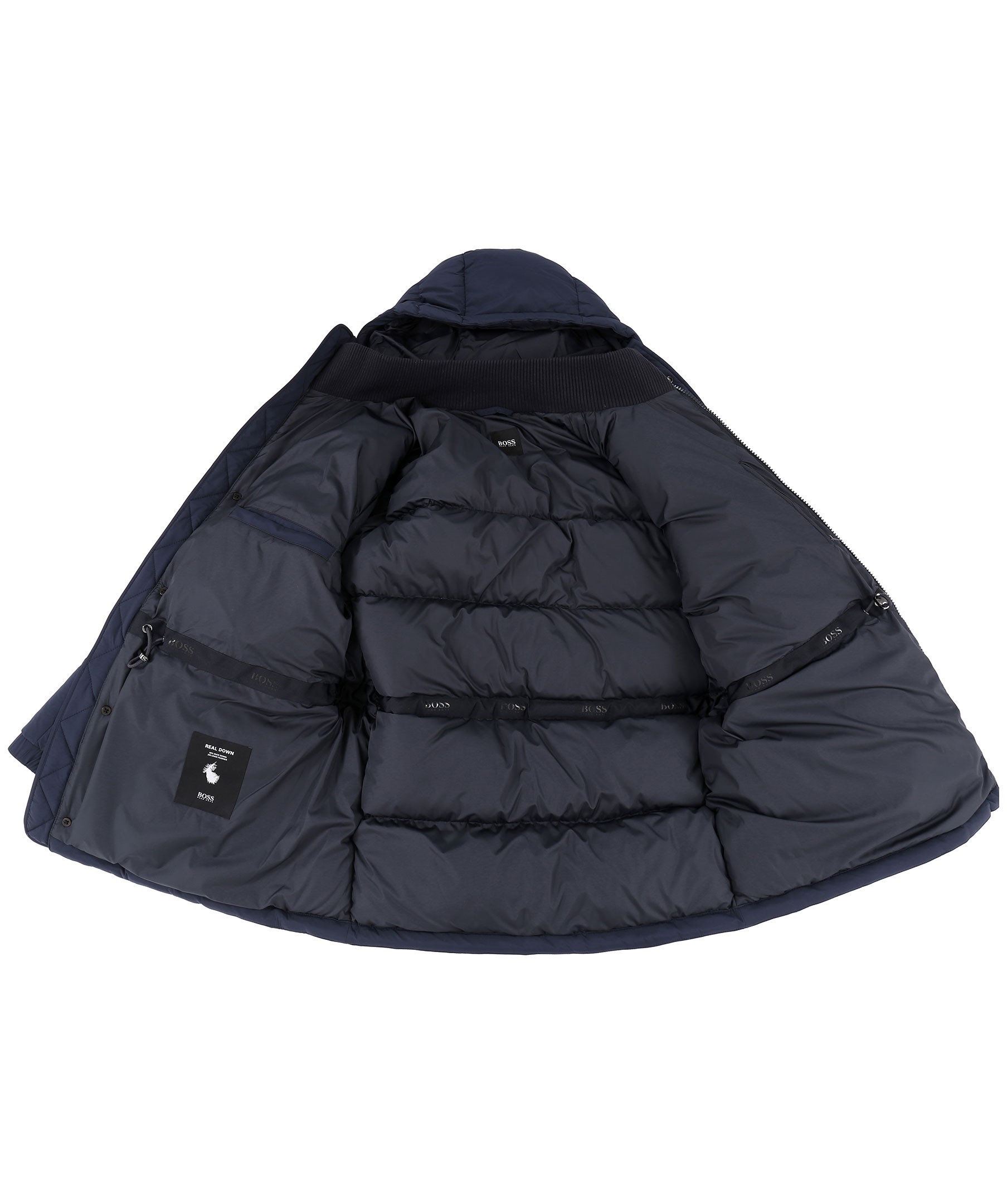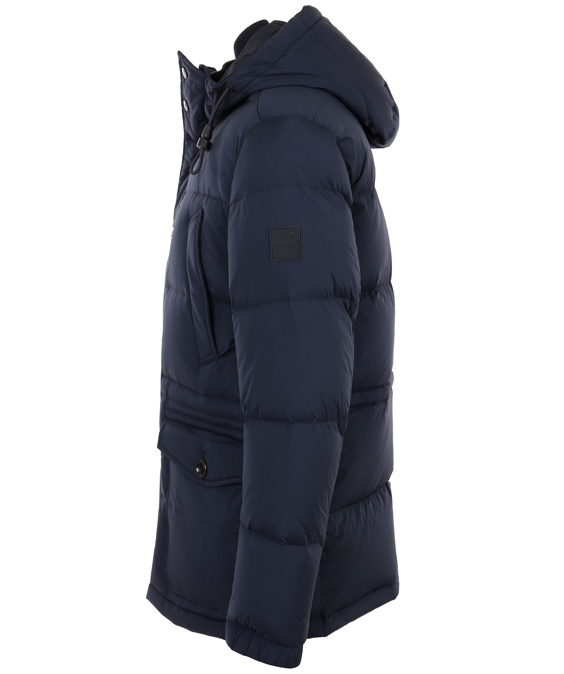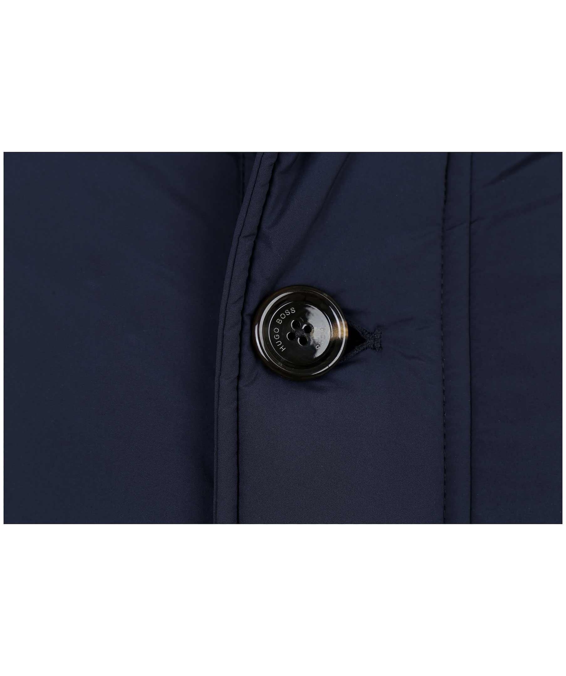 Blåsvart dunjacka i polyamid från Hugo Boss. Luva med dragsko och ribbad mudd som krage. Sex fickor framtill, fyra stängs med knapp eller tryckknapp och två innerfickor. Stängs med tvåvägsdragkedja och knappar. Logotyp i gummi på vänster ärm och reglerbara ärmslut med tryckknappar. Dragsko i midjan.