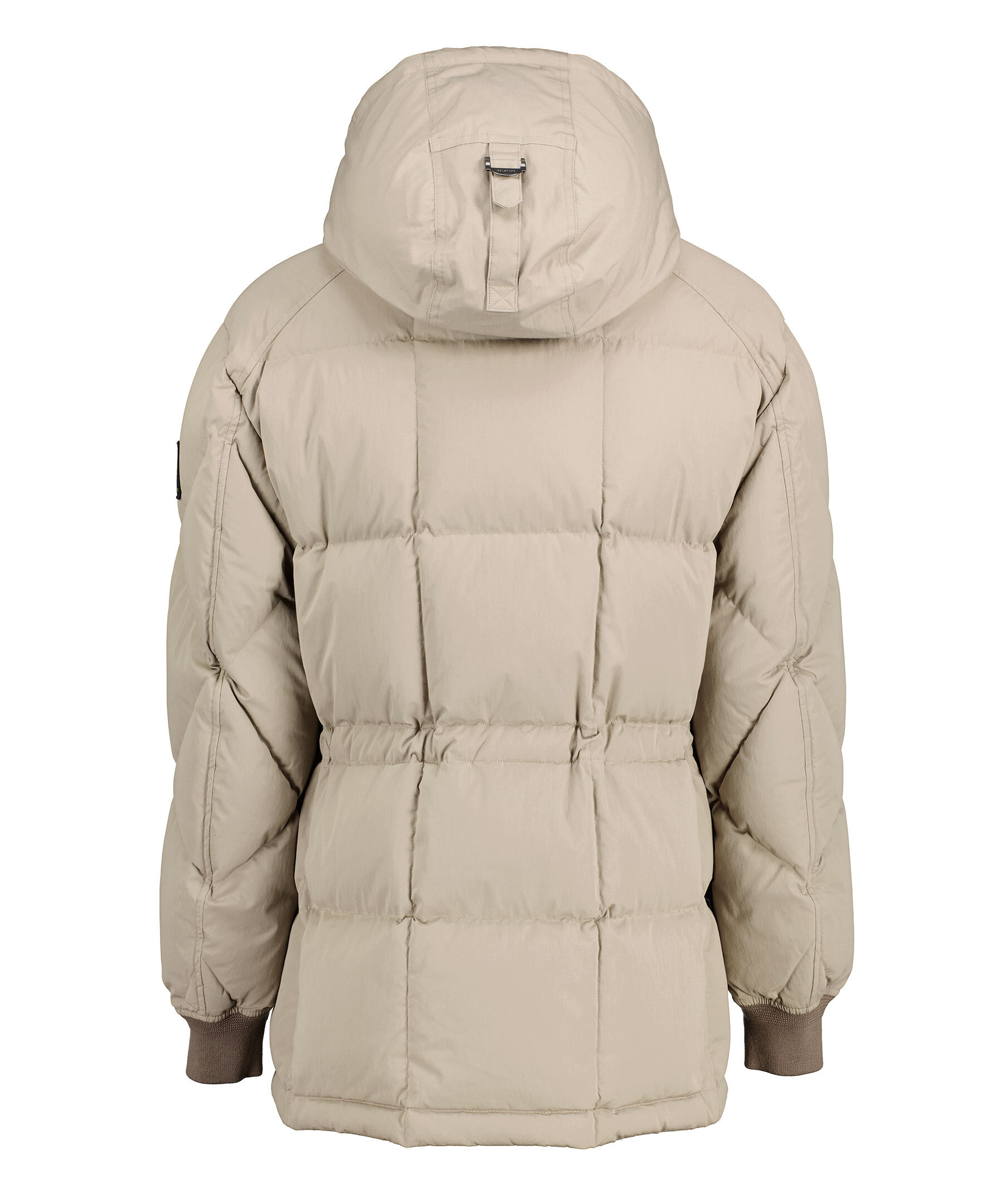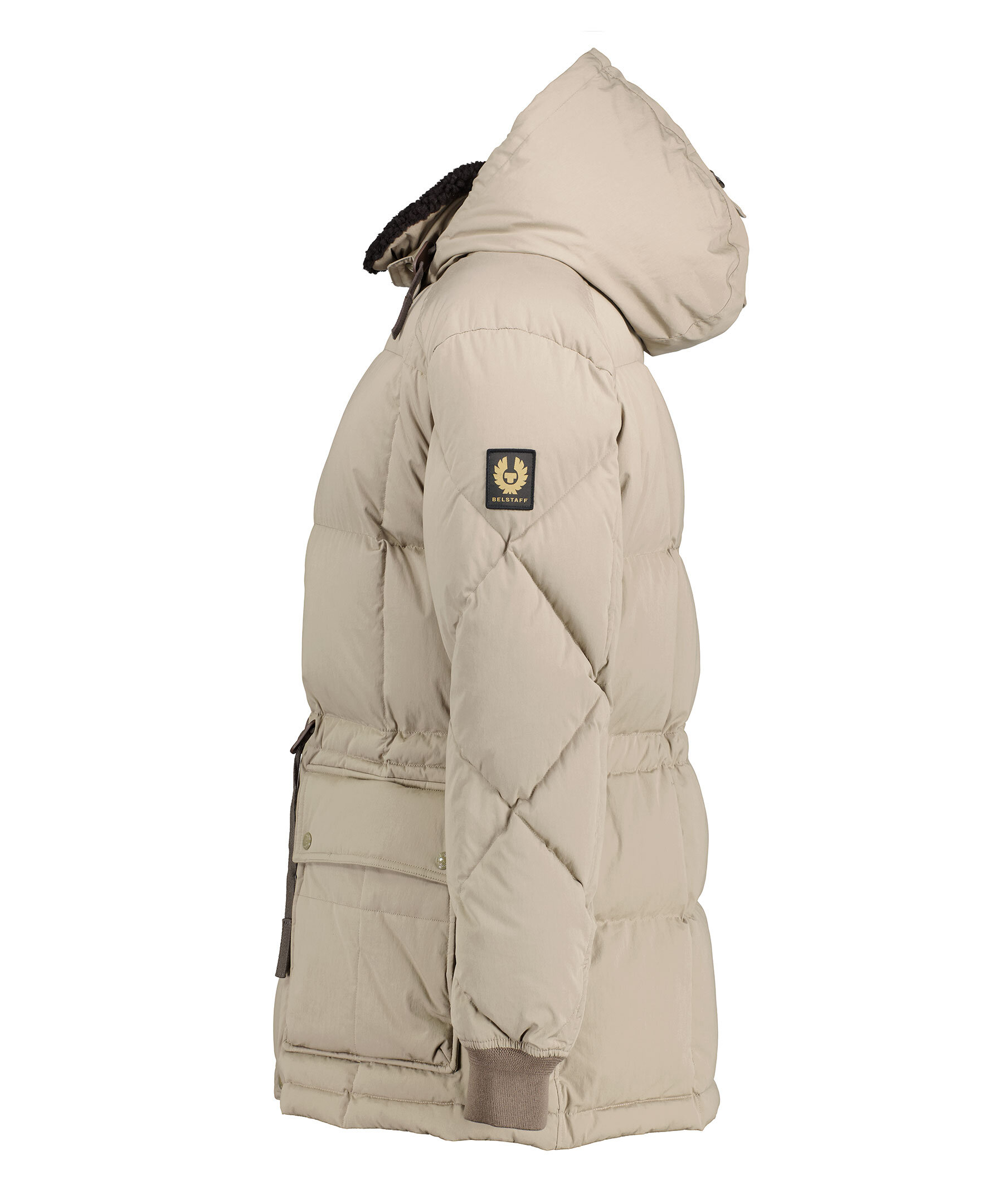 Beige quiltad dunjacka från Belstaff. Jackan stängs framtill med tvåvägsdragkedja och tryckknappar. Två fickor framtill som stängs med tryckknappar. Dragsko vid luvan och midjan. Luvan är fodrad i pile-material. Ribbstickade muddar vid ärmslut. Patch med logotyp på vänster ärm.