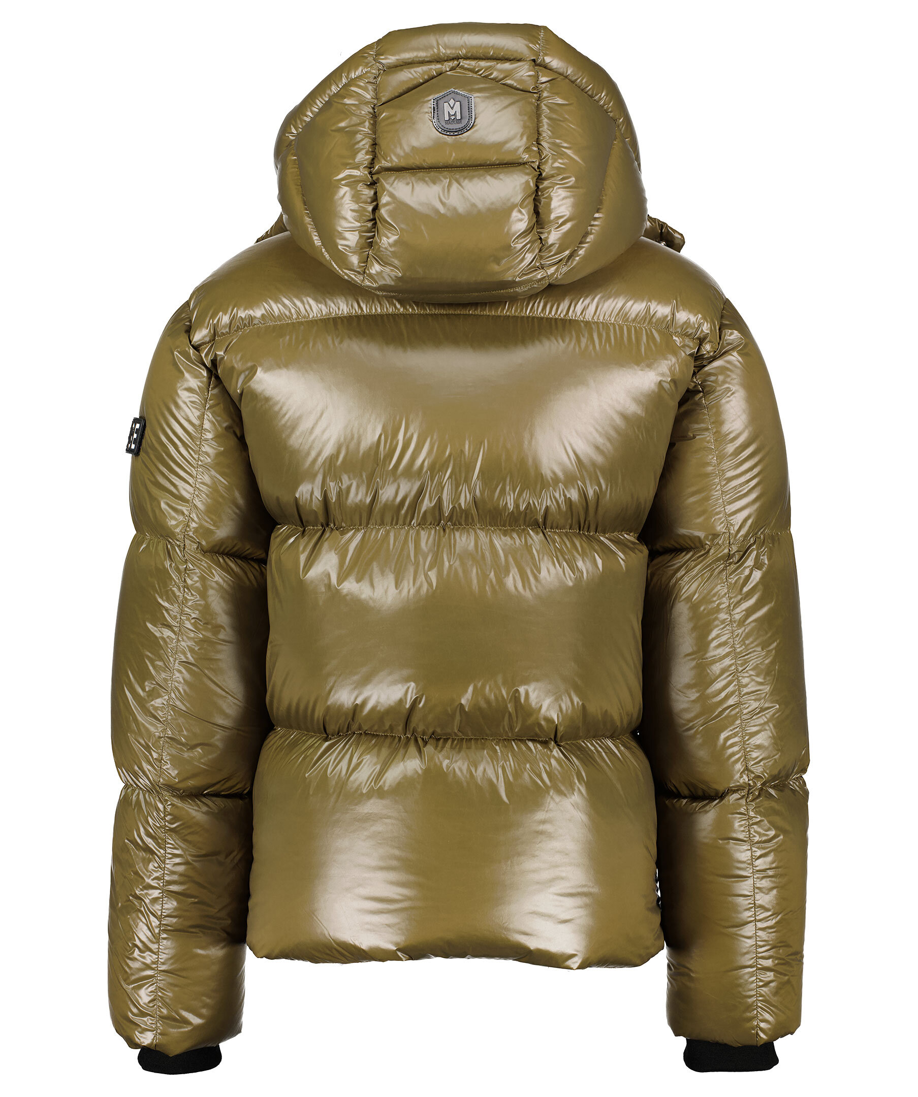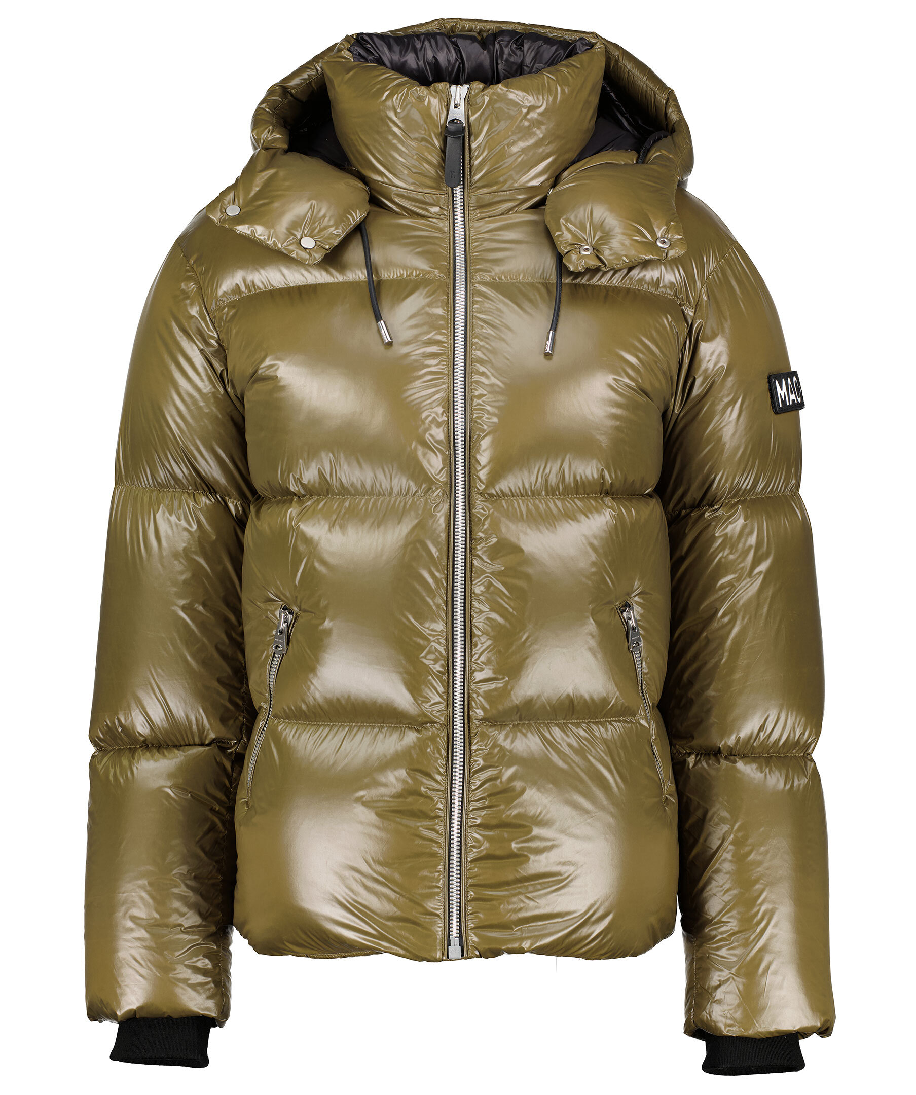 Militärgrön quiltad dunjacka från Mackage i glansigt nylontyg. Stängs med silverfärgad dragkedja framtill. Avtagbar luva med tryckknappar samt dragsko i svart läder. Två snedställda fickor fram som stängs med dragkedja och två innerfickor med dragkedja. Avtagbar patch i svart och vitt läder med logotyp på vänster ärm. Dragsko i plaggslut och svarta muddar ärmslut. Hög krage och tryckknappar på luvan som knäpps över kragen.