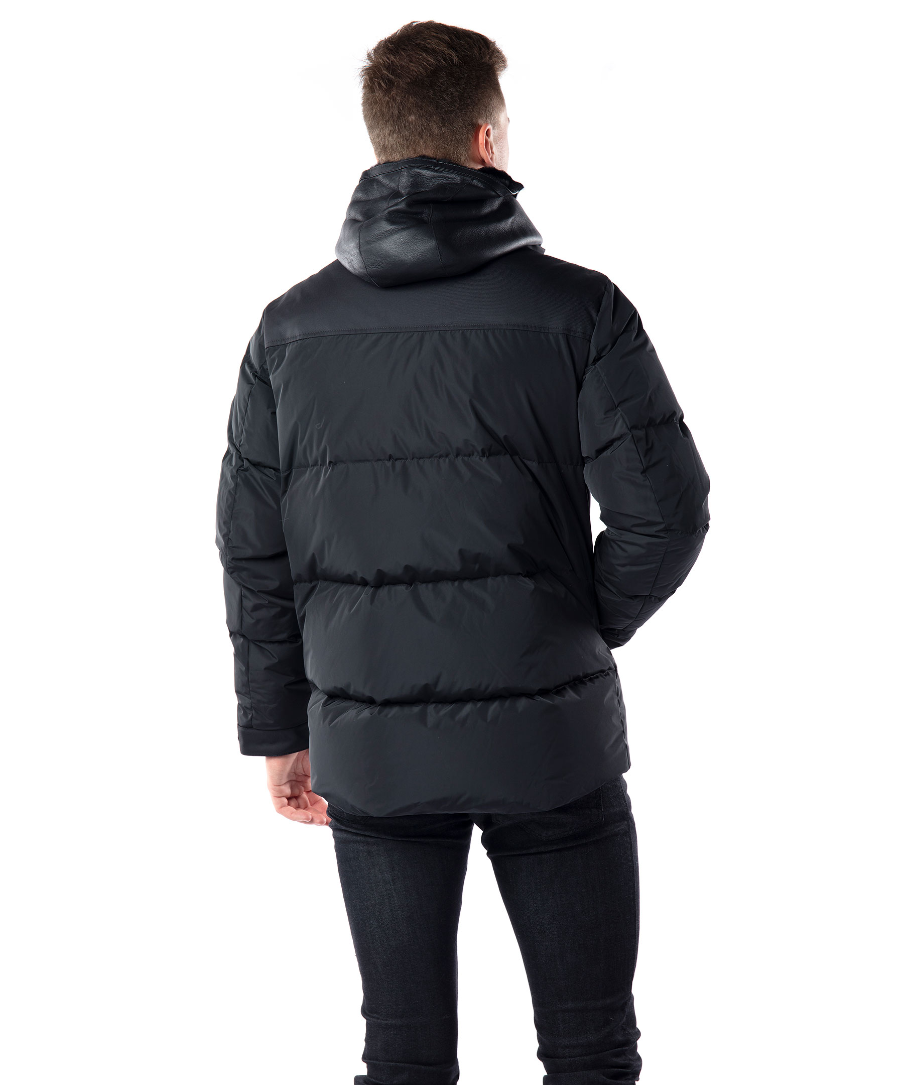 Svart dunjacka med avtagbar luva i läder från Mackage. Jackan har två olika strukturer på tyg som ger en snygg kontrast, ett diagonalt smårandigt tyg på axlar, krage och ficklock samt ett matt och slätt tyg på resterande jacka. Jackan har två framfickor med ficklock som stängs med tryckknapp och fickor med dragkedja under dessa och två innerfickor med dragkedja. Jackan stängs med tvåvägsdragkedja och dolda tryckknappar samt en till dragkedja som stängs under, den går att ta bort tillsammans med luvan så att jackan blir en jacka med krage. Dragsko nertill på jackan, muddar i ärmslut och svart logotyp i stål på vänstra ärmen. I ärmslutet finns ställbara spännen i läder med logotyp på som justeras med kardborre. Modellen är 190 cm lång och bär storlek M.