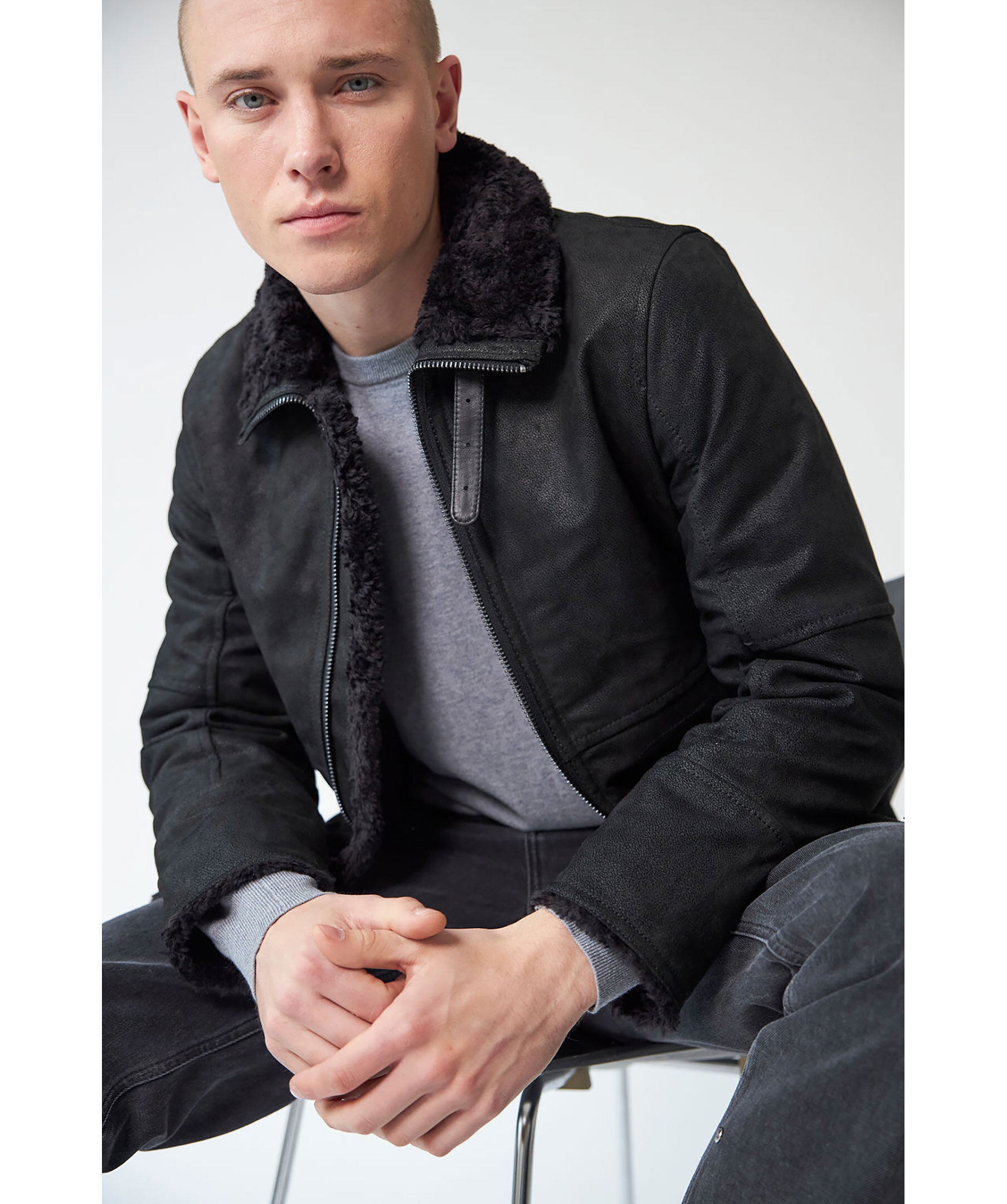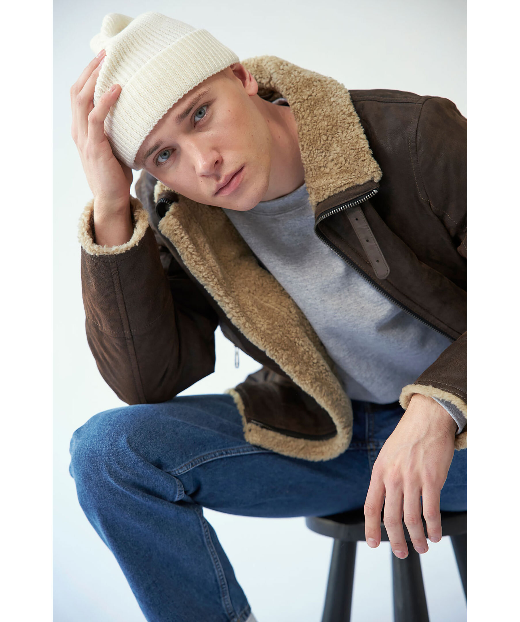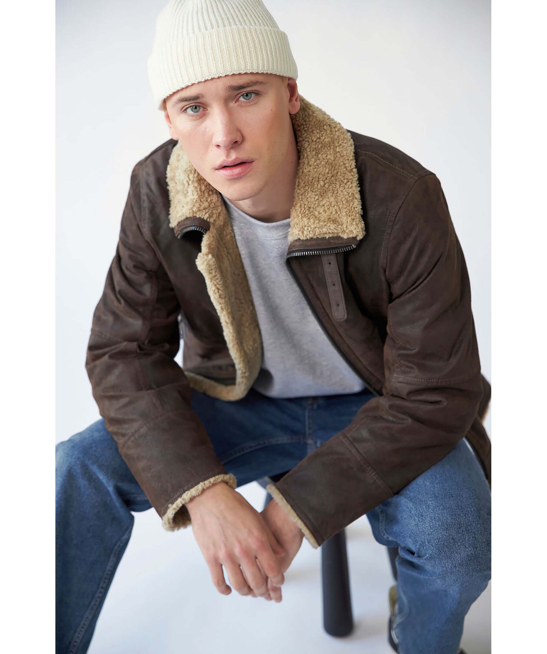 En tidlös shearlingjacka. Medan det bekväma sherpa-fodret ger värme, ger det blekta mockaskiktet och den karakteristiska finishen en häftig vintagekänsla.