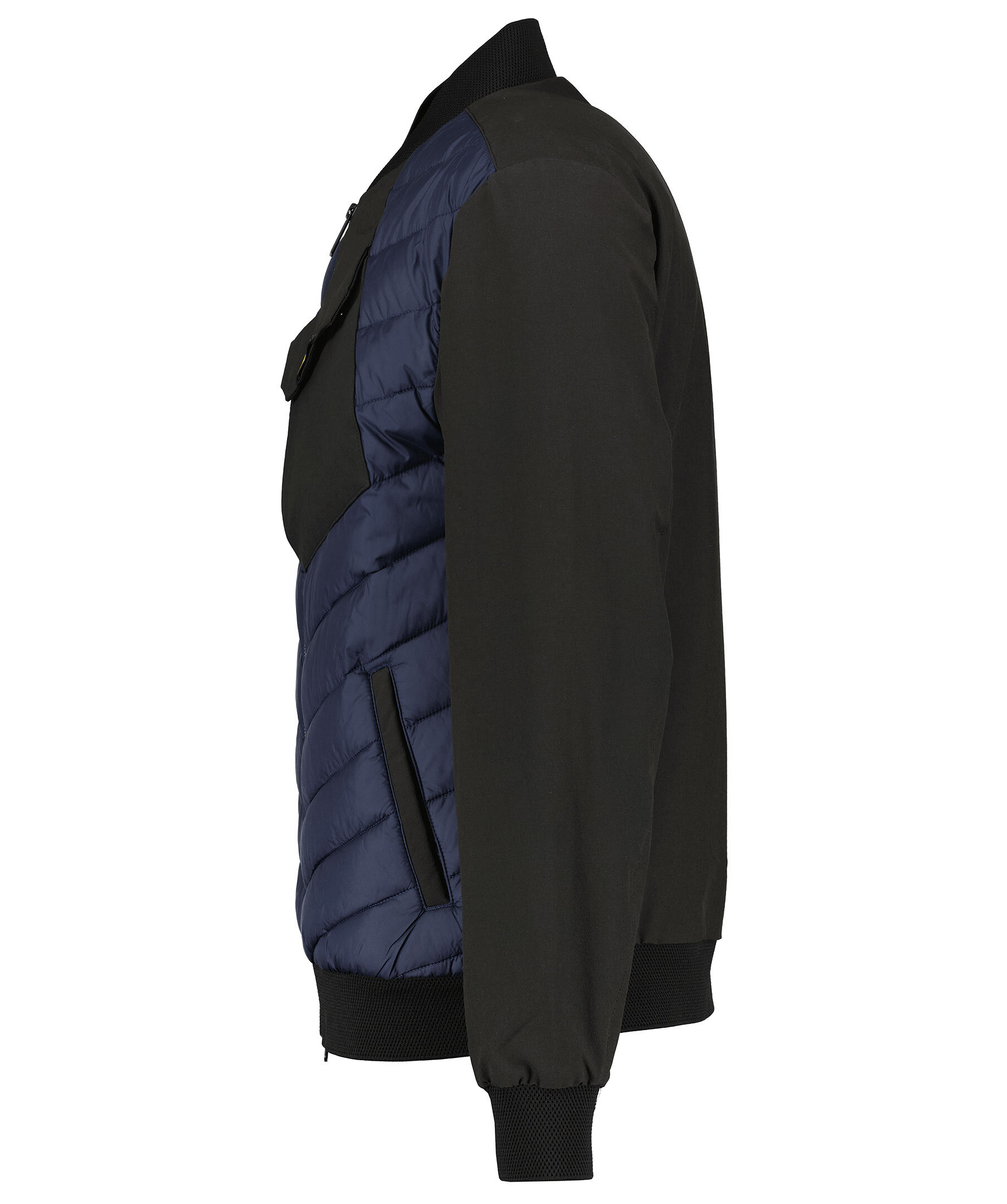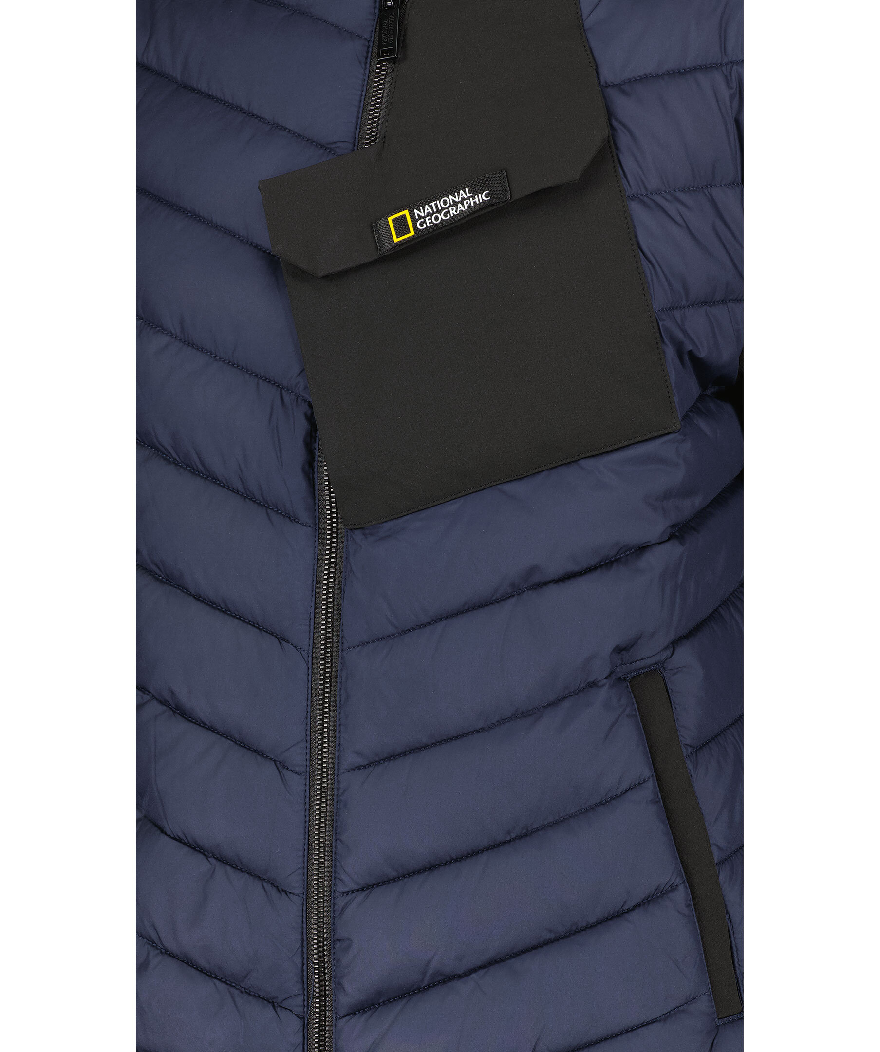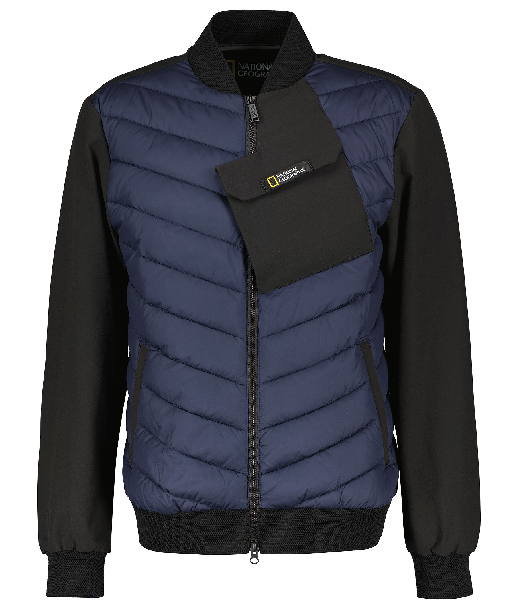 Svart och mörkblå hybridjacka från National Geographic. Stängs med tvåvägsdragkedja framtill. Vadderad panel på jackans framsida. Muddar och krage i stretchig resår. Bröstficka framtill som stängs med lock, logotyp och tryckknapp.