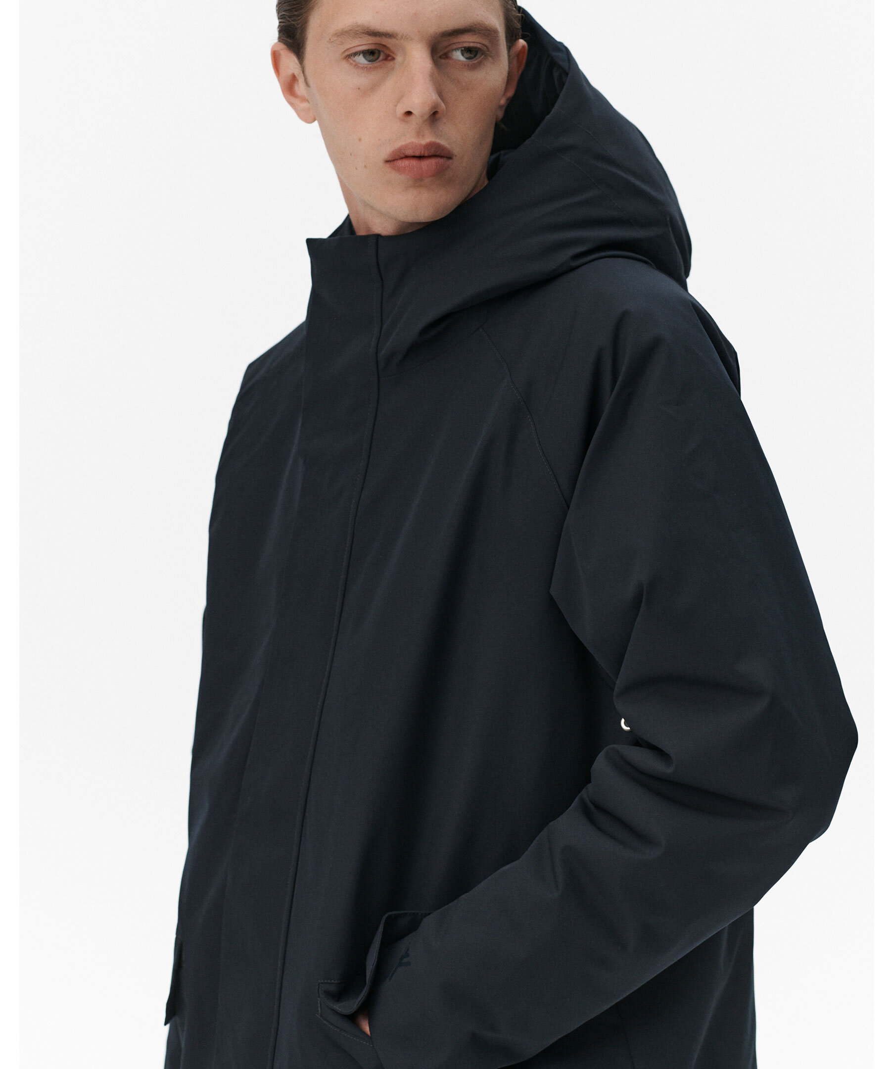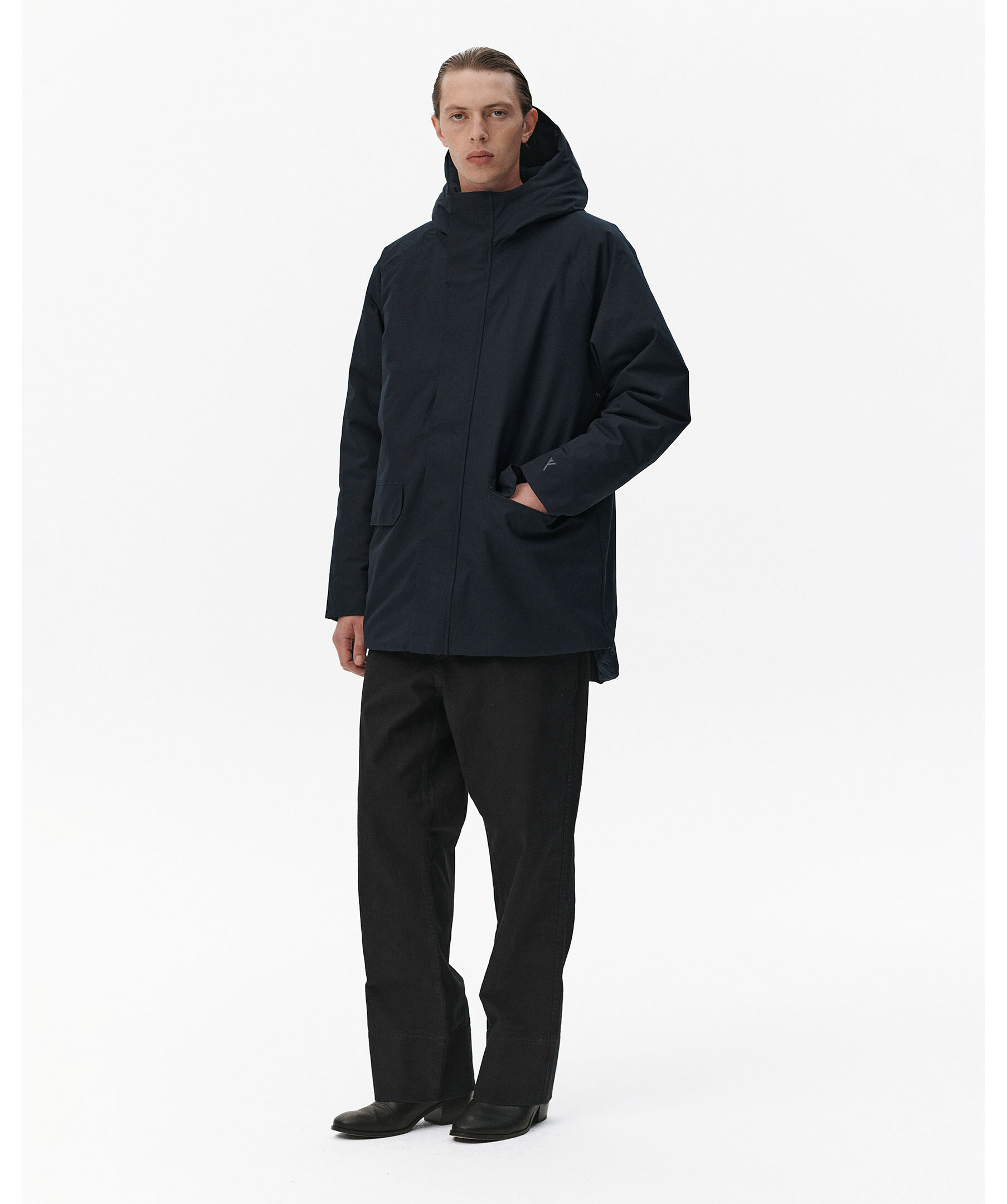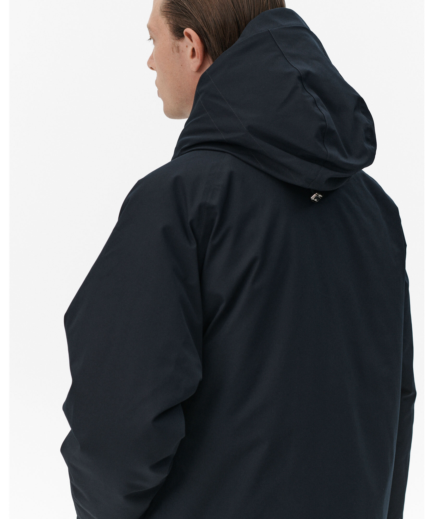 Marinblå, stilren och midilång parka med teknisk prägel från Welter Sherlter. Tillverkad i ett tvålagers polyesterkanvas med en mjuk, slät yta, erbjuder den både funktion och design. Jackan är vattentät (20K), vindtät och andas, vilket gör den idealisk för kalla och regniga dagar. Isoleringen i återvunnen polyester (150 g/m²) ger värme ner till cirka –10 °C. Den minimalistiska designen kompletteras med dolda sidofickor, en innerficka och en diskret Napoleonficka framtill. SAB:s patenterade dubbeldragkedja och PFC-fri DWR-behandling säkerställer både funktion och hållbarhet.