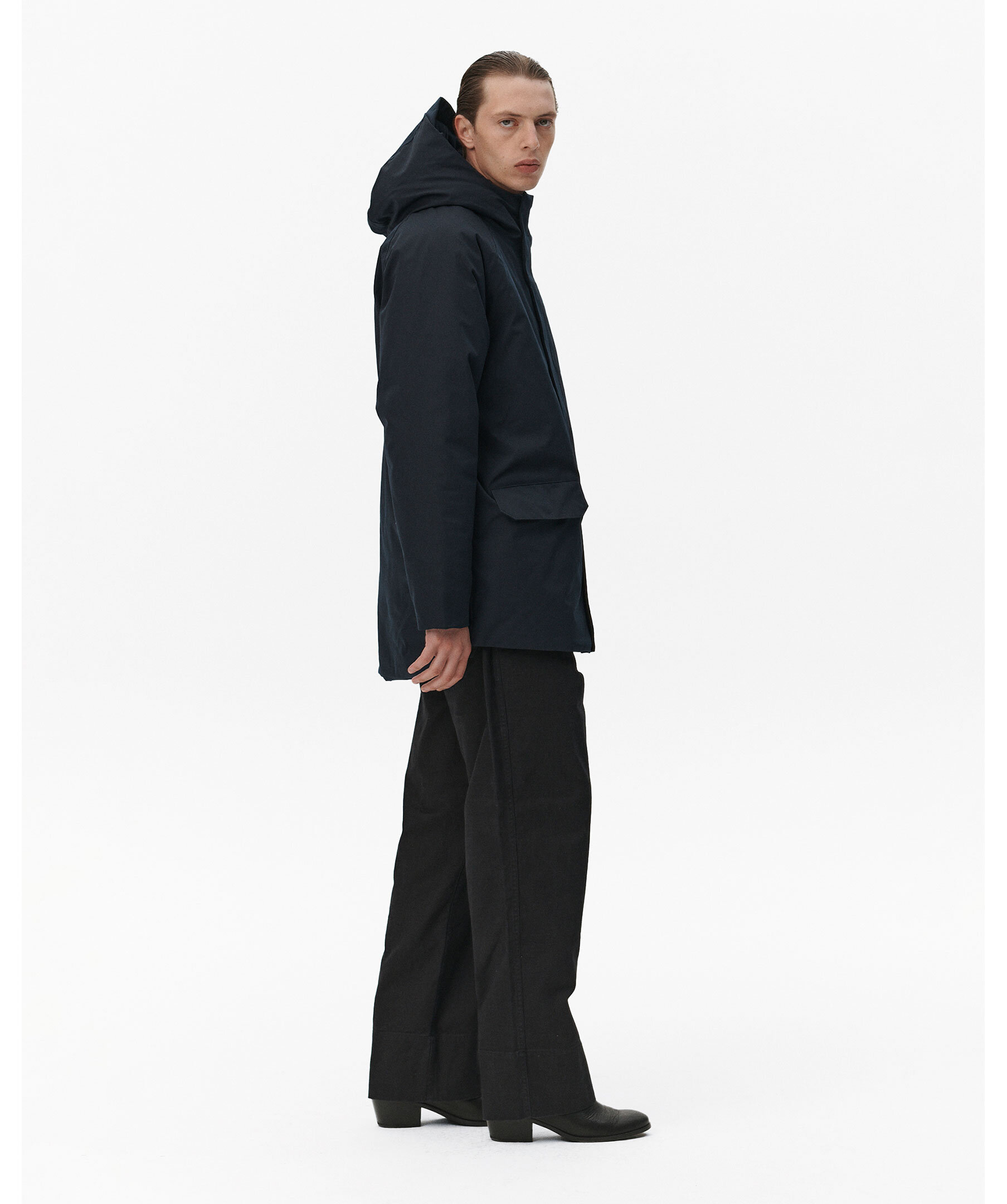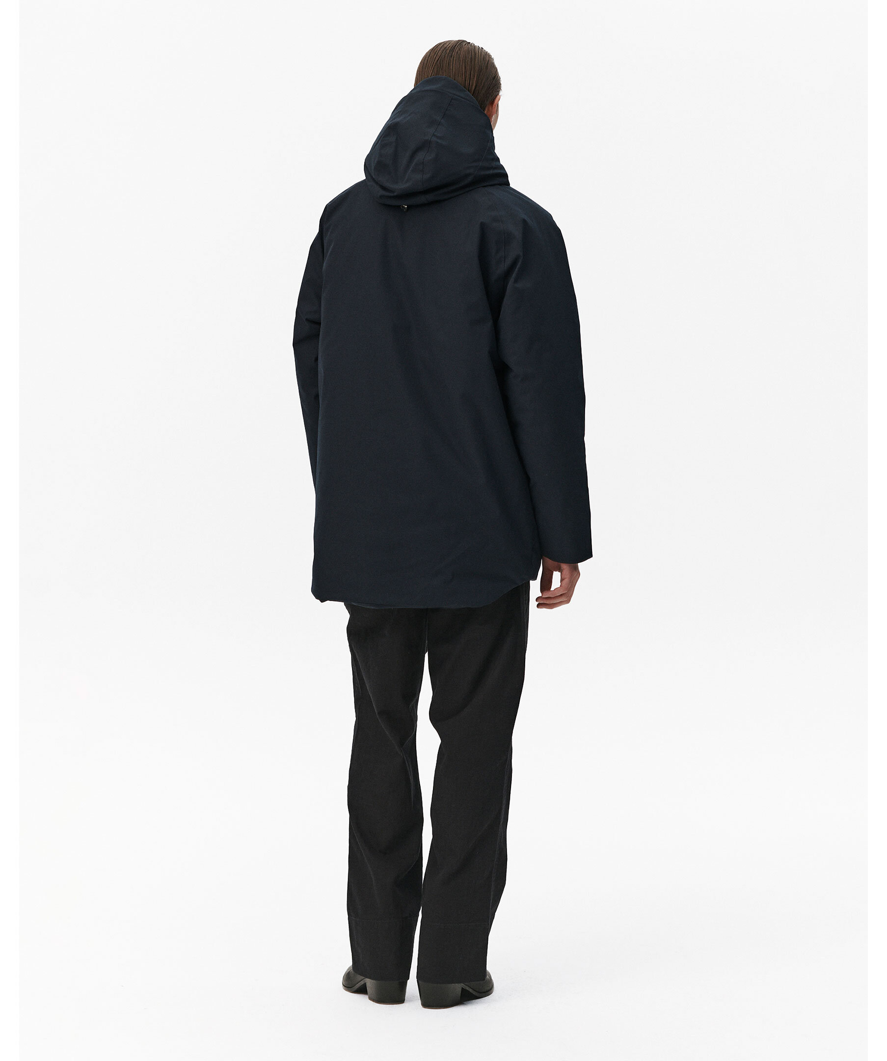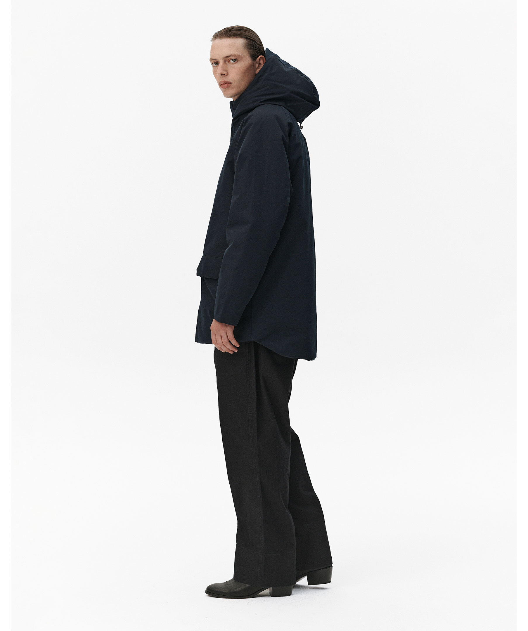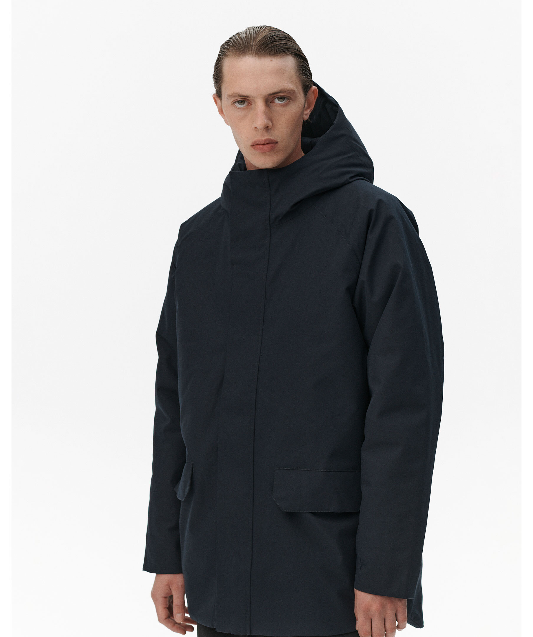 Marinblå, stilren och midilång parka med teknisk prägel från Welter Sherlter. Tillverkad i ett tvålagers polyesterkanvas med en mjuk, slät yta, erbjuder den både funktion och design. Jackan är vattentät (20K), vindtät och andas, vilket gör den idealisk för kalla och regniga dagar. Isoleringen i återvunnen polyester (150 g/m²) ger värme ner till cirka –10 °C. Den minimalistiska designen kompletteras med dolda sidofickor, en innerficka och en diskret Napoleonficka framtill. SAB:s patenterade dubbeldragkedja och PFC-fri DWR-behandling säkerställer både funktion och hållbarhet.