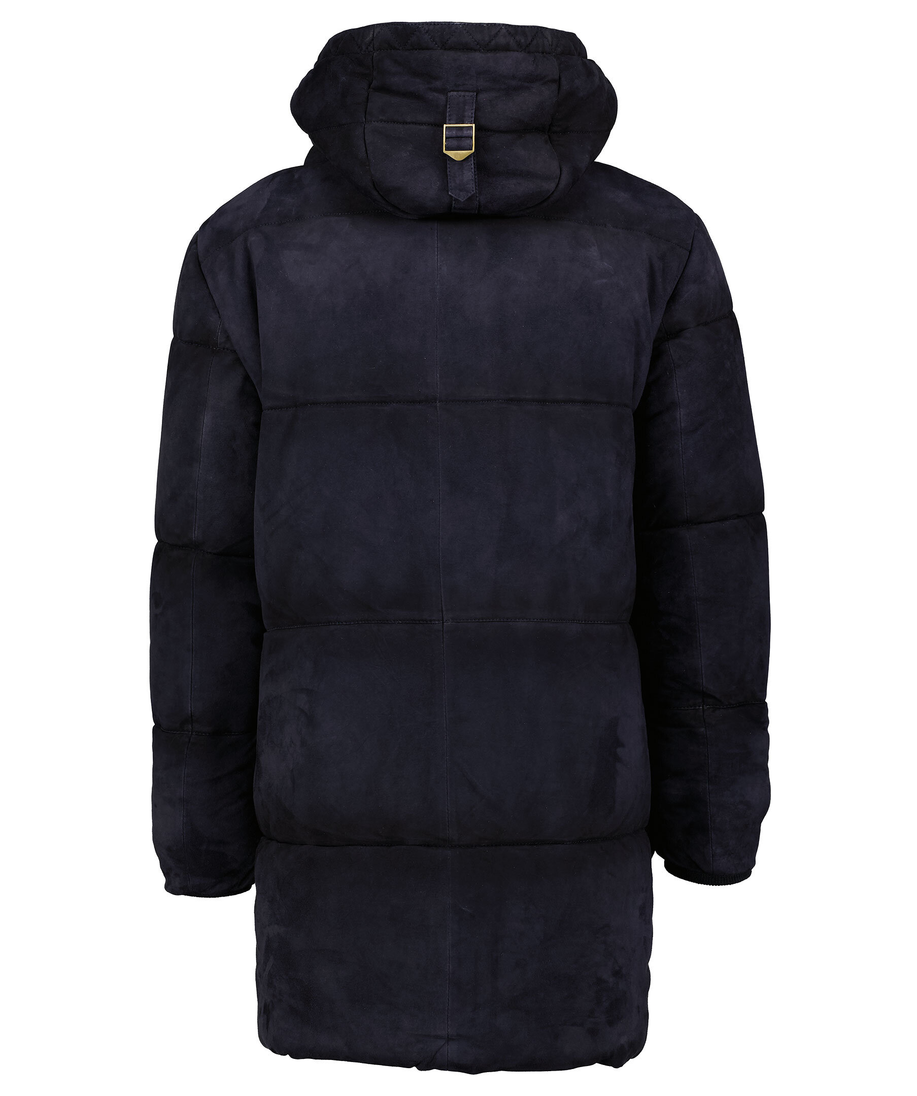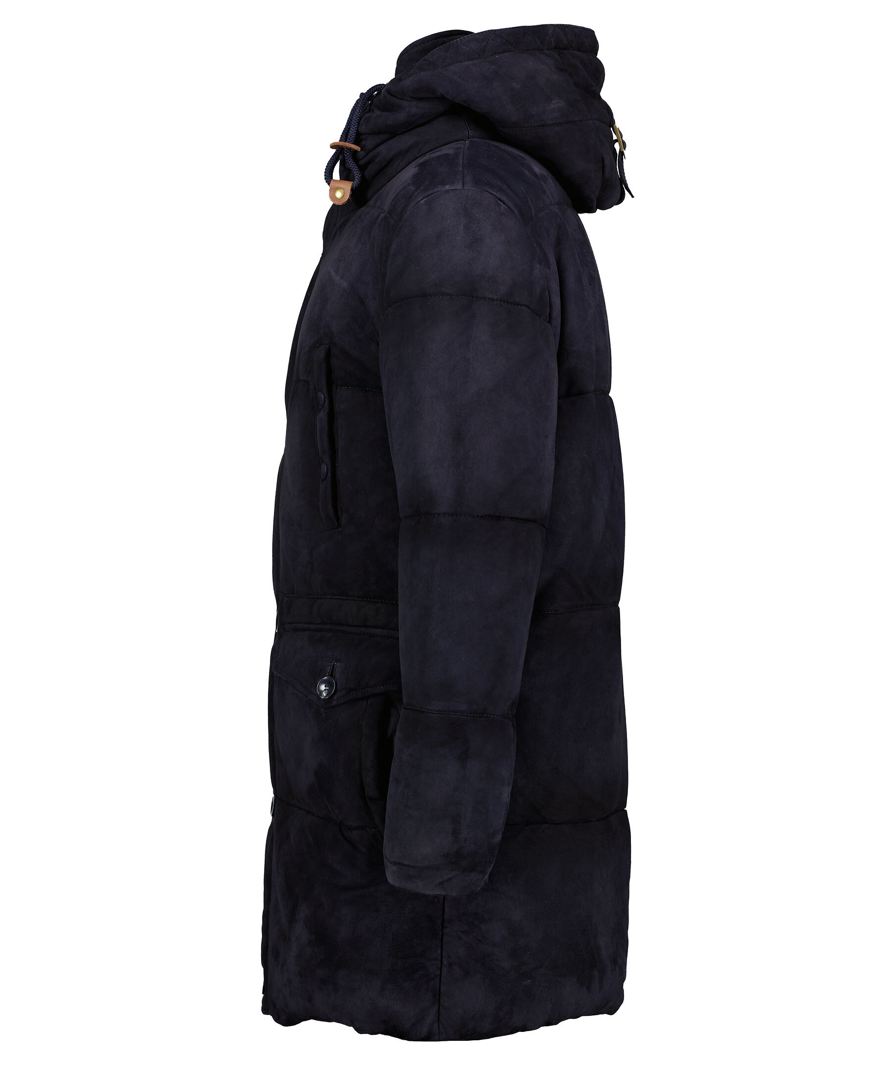 Mörkblå quiltad parkas i Mocka från Coloniaire. Mockan är lätt vaxad. Stängs framtill med tvåvägsdragkedja och knappar. Luva med dragsko med bruna läder detaljer. Snedställda bröstfickor som stängs med tryckknappar. Stora fickor ned till med ficklock som stängs med knappar och har en öppen ficka i sidan. Broderad logotyp på luvan. Innerjackan har ullfoder med fiskbensmönster, 3 innerfickor samt muddar i Merinoull.
