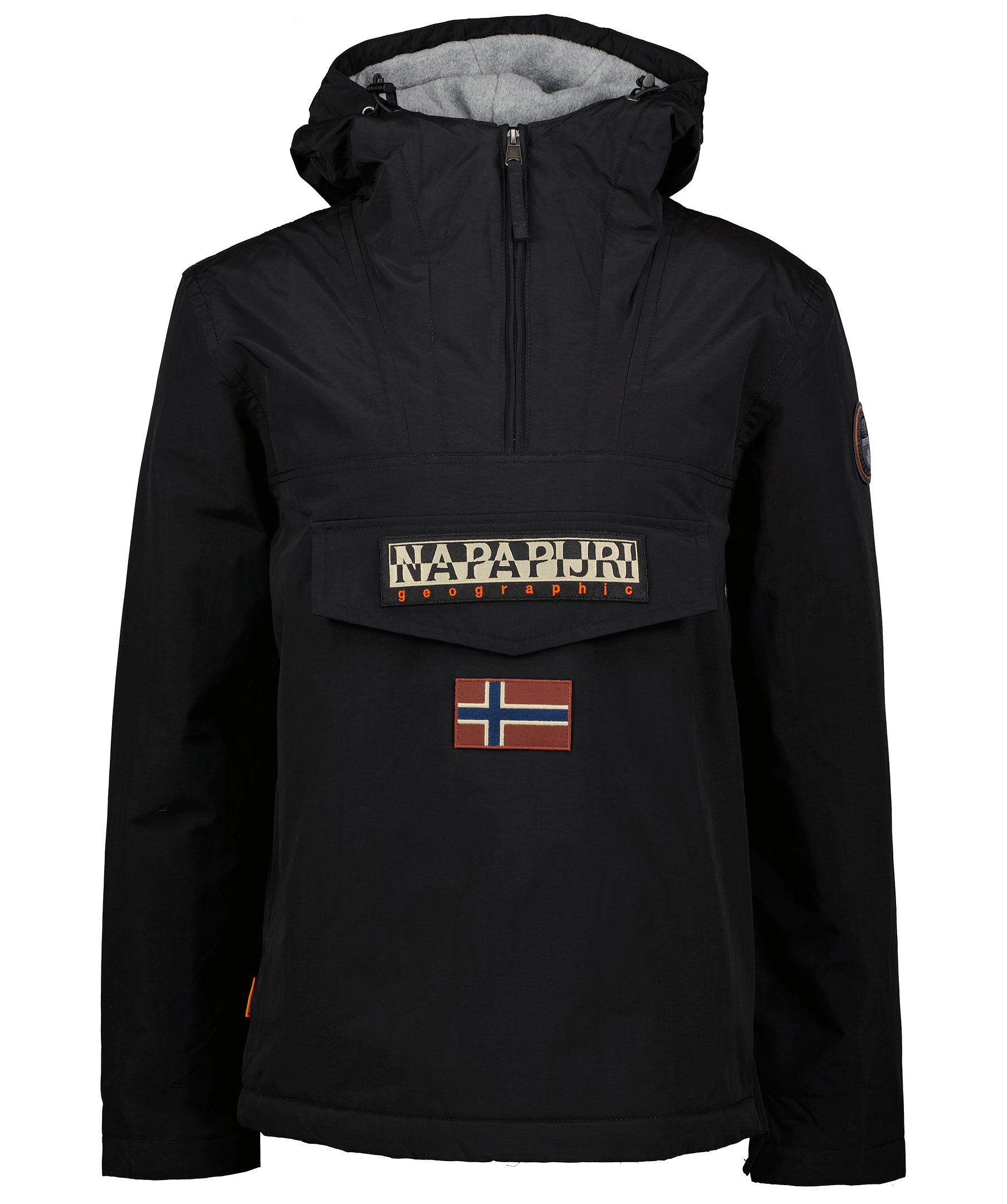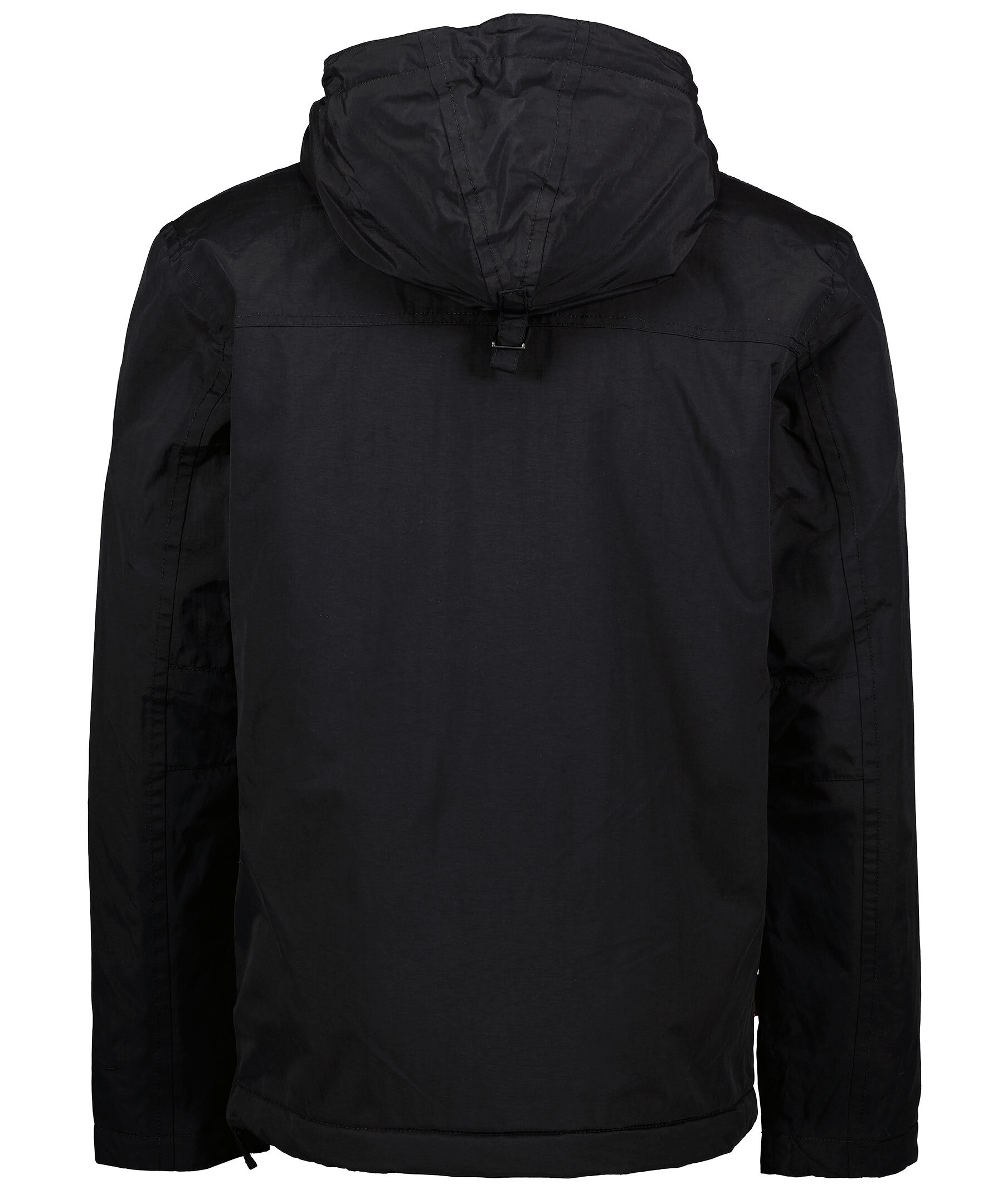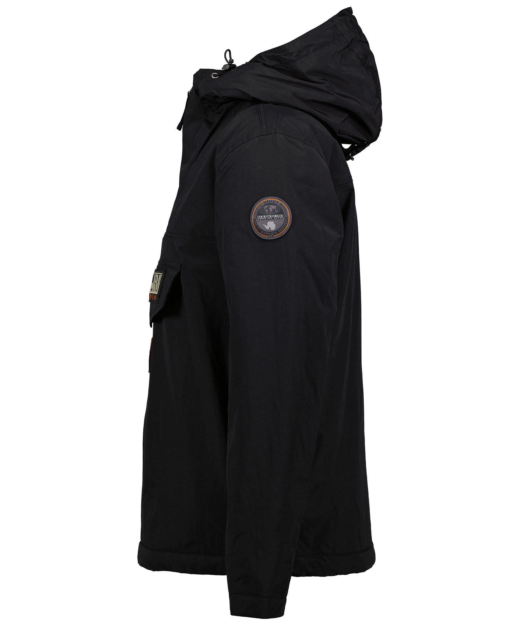 Vattentålig, svart jacka med luva i anorakmodell från Napapijri. Yttertyg i 100% polyamid, innertyget är grått, mjukt polyester. Dragsko i luva och vid plaggslut, muddar i ärmarna. Jackan kan delvis öppnas med dragkedja i sidan. Stor ficka med logotyp mitt på bröstet som stängs med dragkedja och kardborreband. Under knäppningen ett märke med norska flaggan, och runt märke på vänster ärm. Ventilationshål under ärmarna.