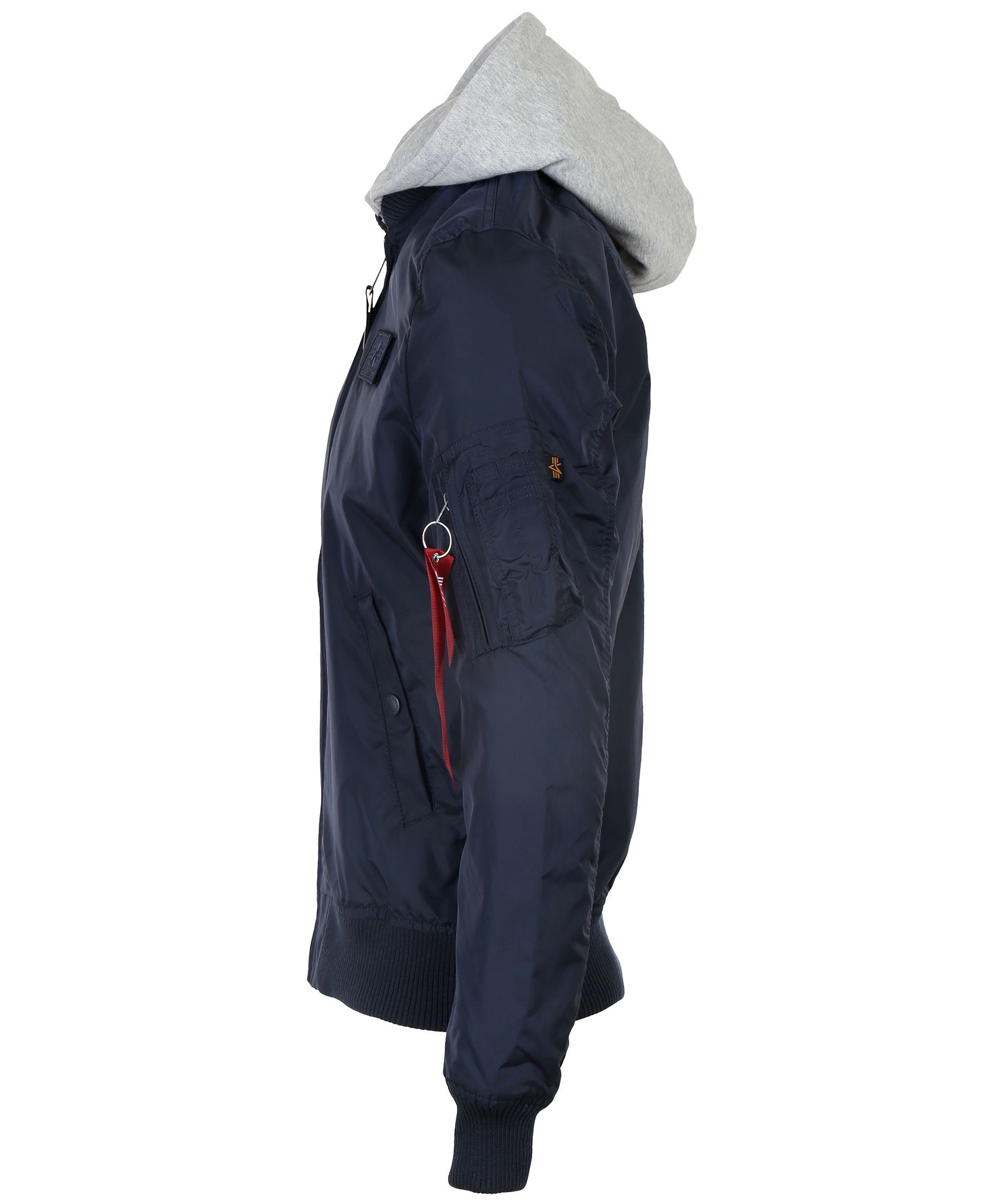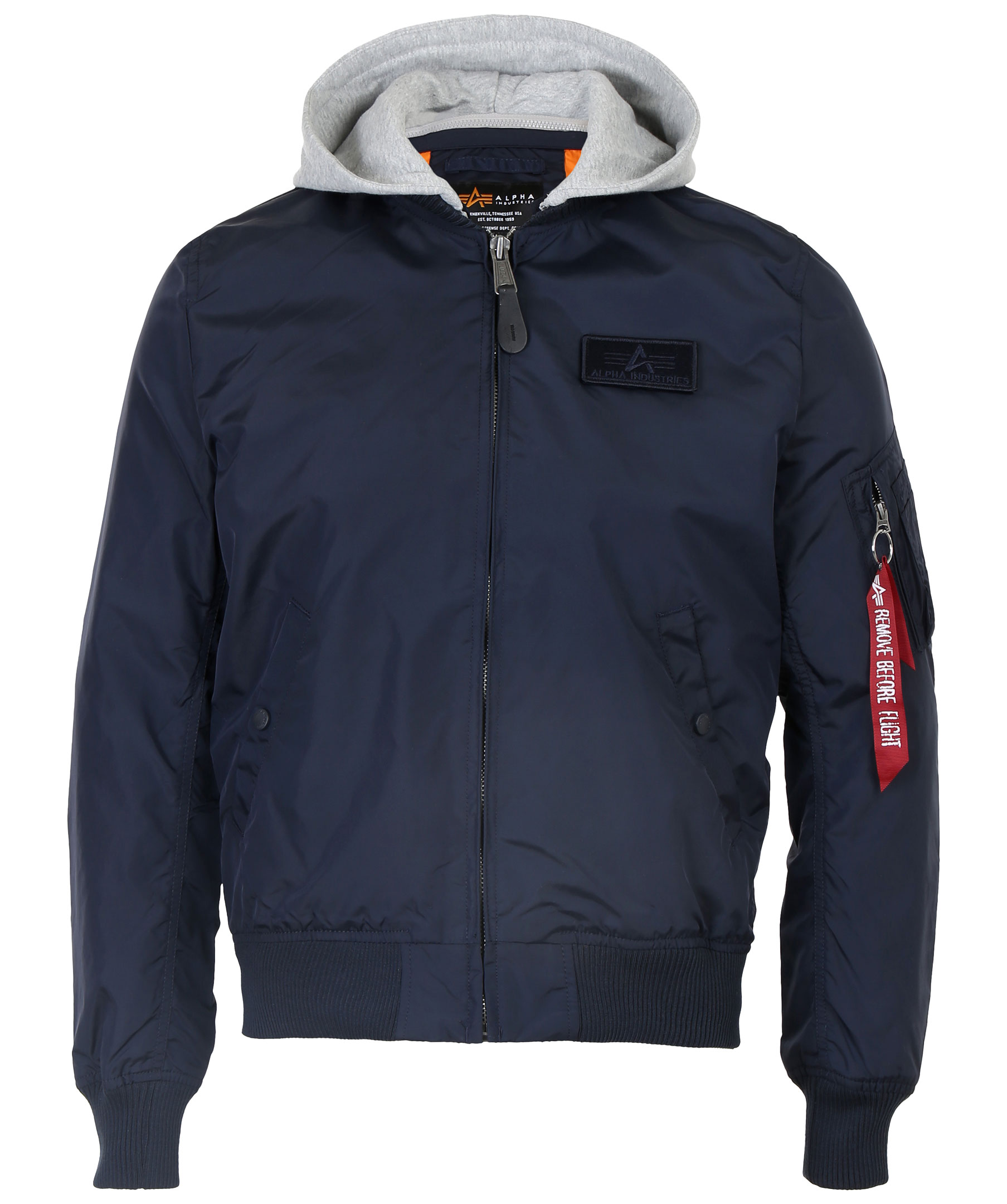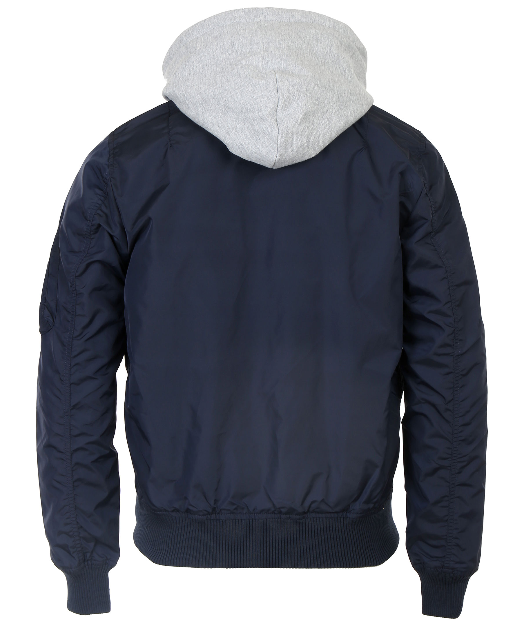 Mörkblå bomberjacka från Alpha Industries med avtagbar huva i sweatshirt tyg. Två snedställda framfickor med tryckknapp, dubbla innerfickor. Ribbade muddar i ärm- och plaggslut samt liten ficka på vänster ärm med ikonisk röd tag. Avtagbar patch på vänster bröst.