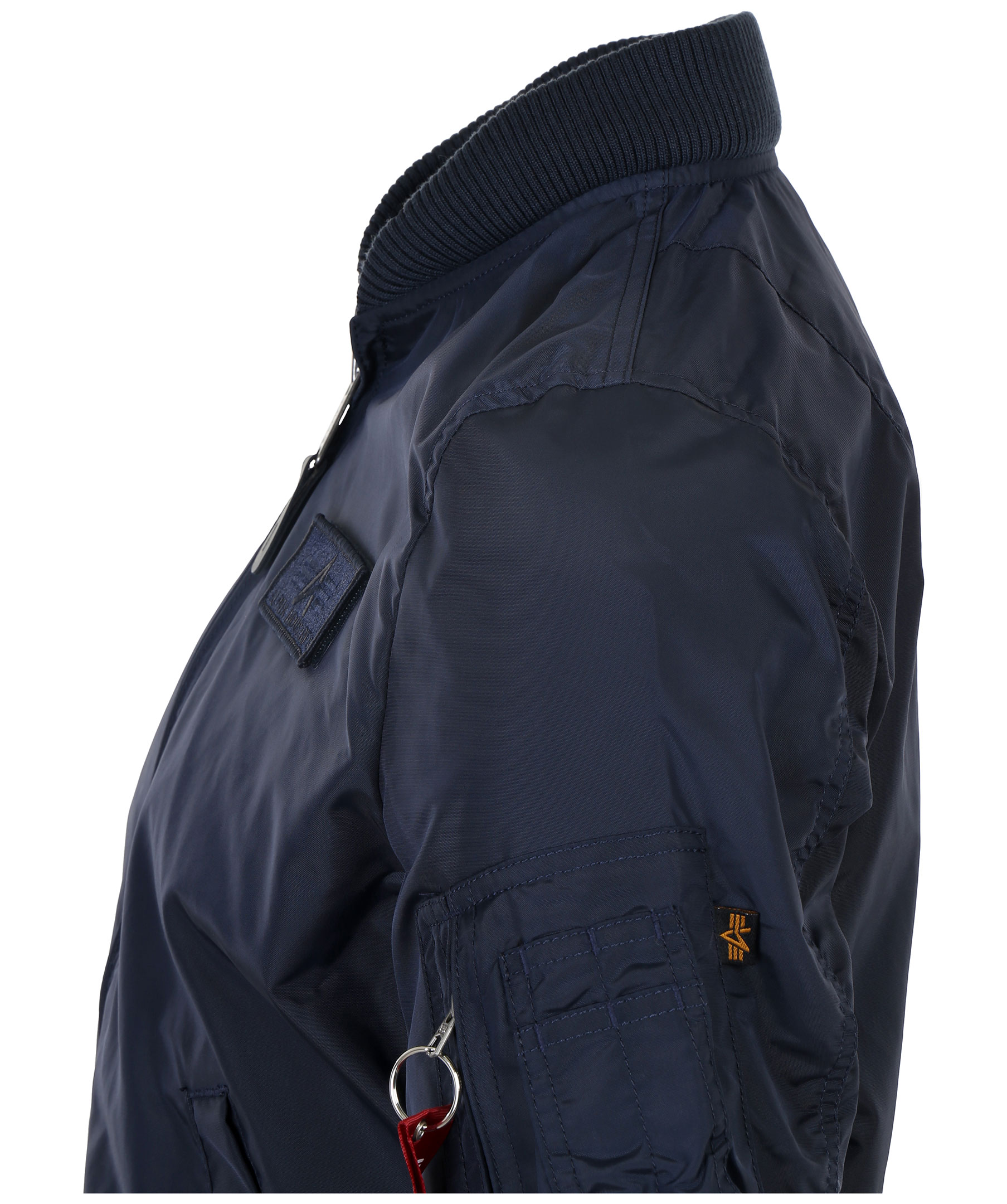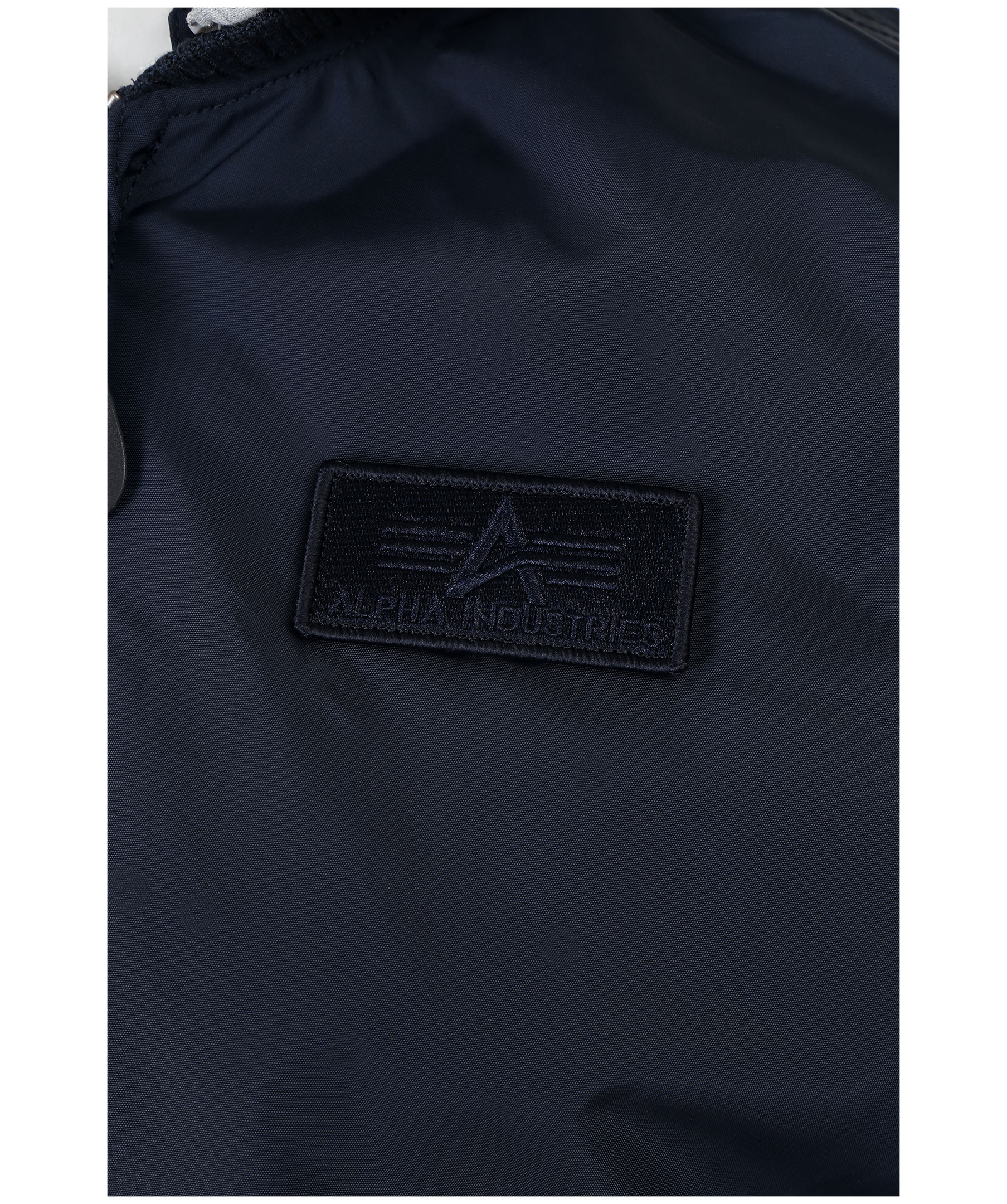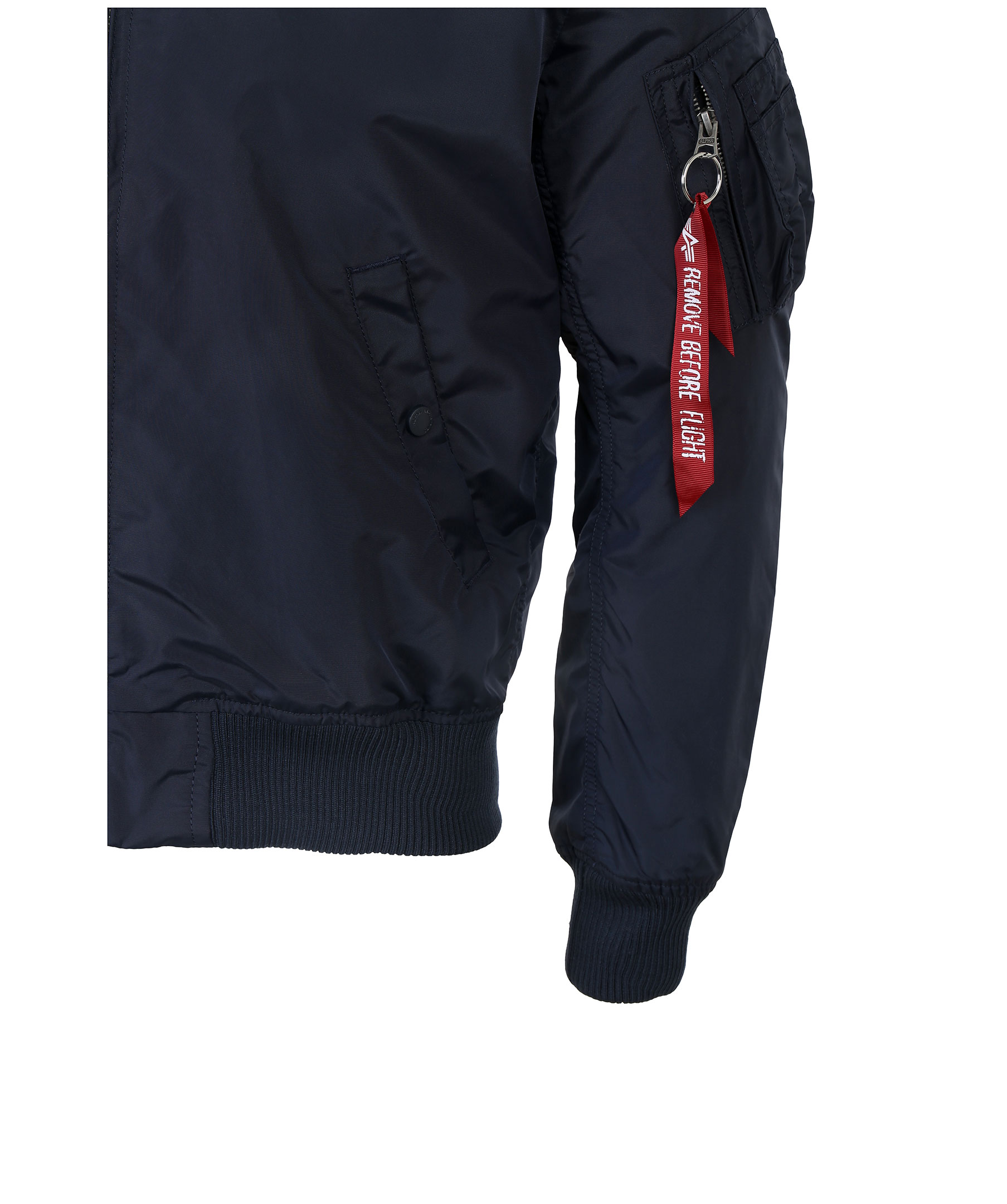 Mörkblå bomberjacka från Alpha Industries med avtagbar huva i sweatshirt tyg. Två snedställda framfickor med tryckknapp, dubbla innerfickor. Ribbade muddar i ärm- och plaggslut samt liten ficka på vänster ärm med ikonisk röd tag. Avtagbar patch på vänster bröst.