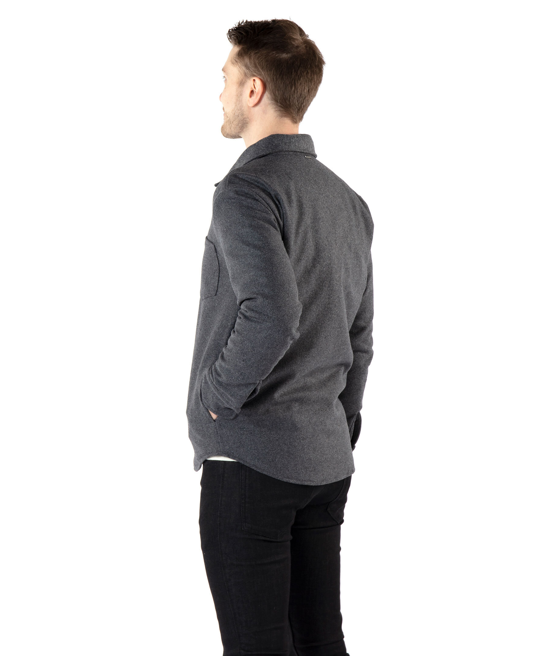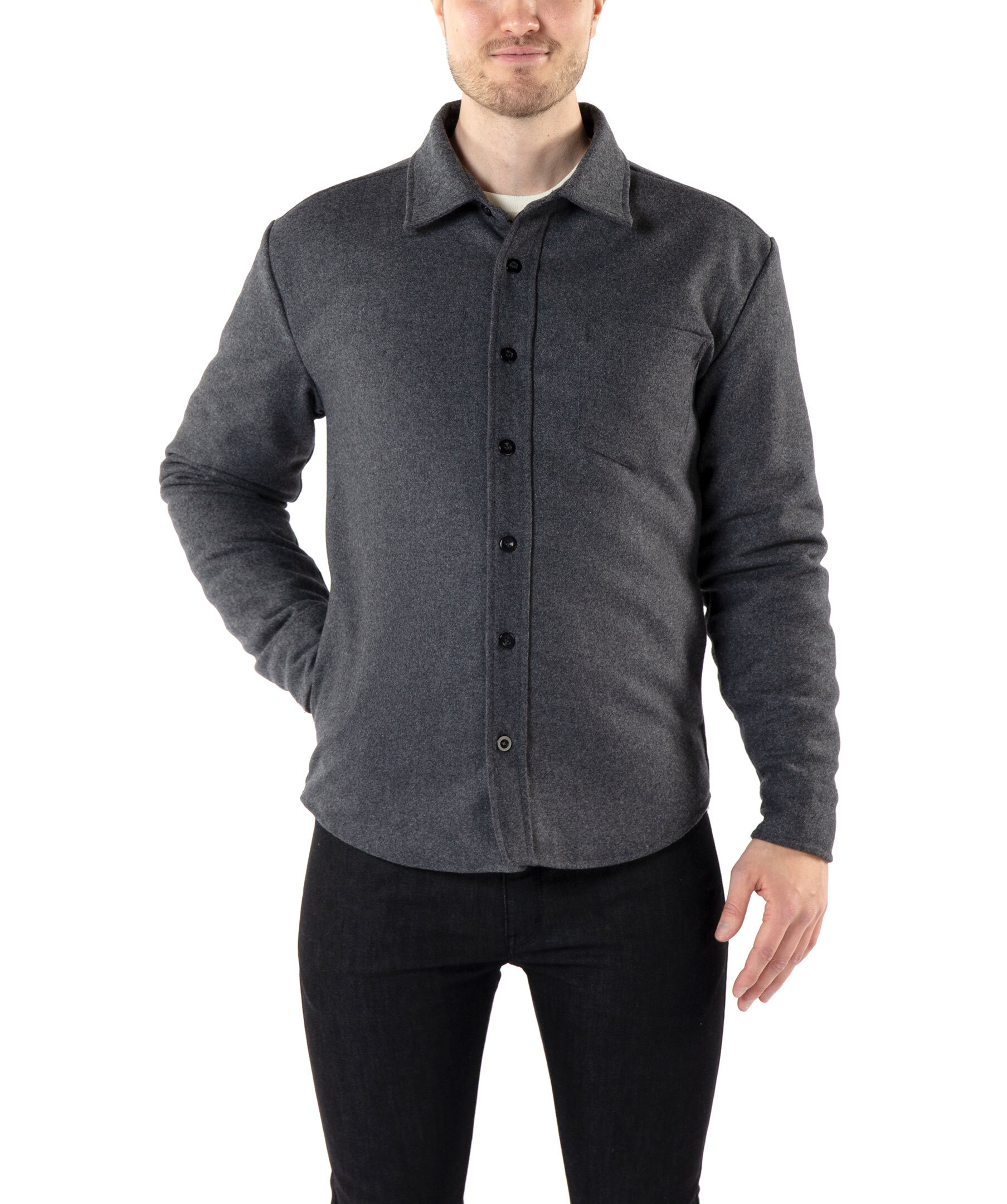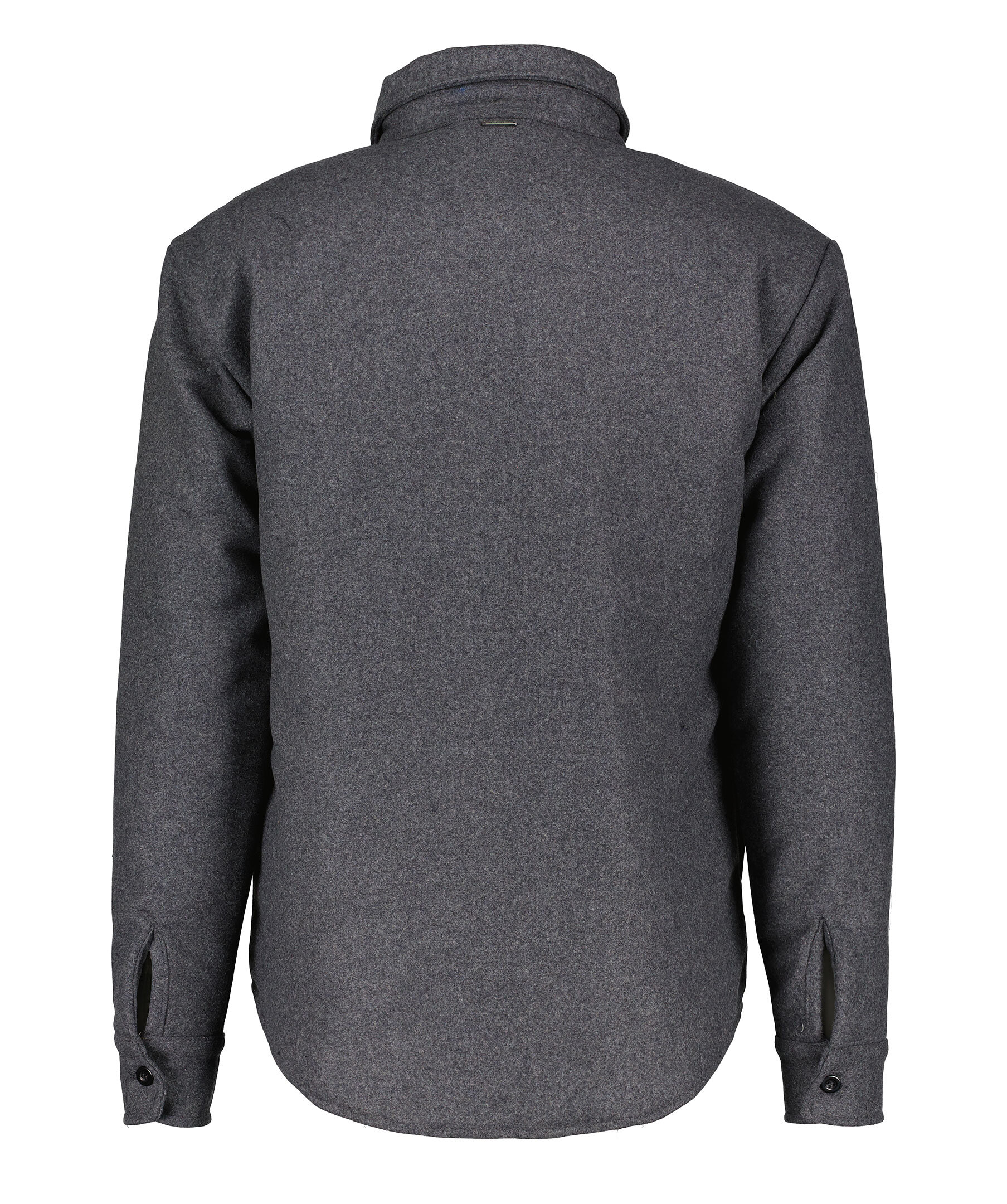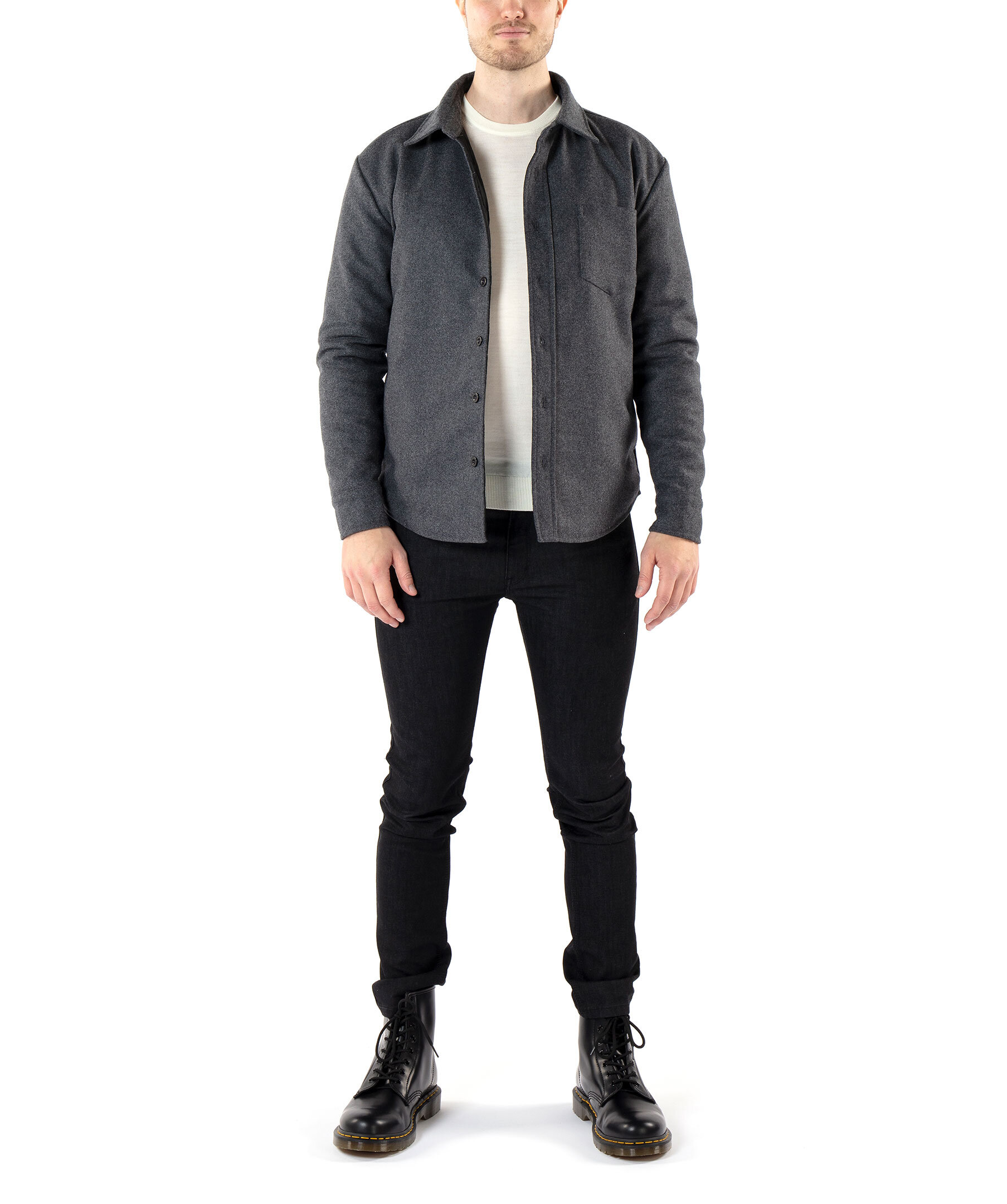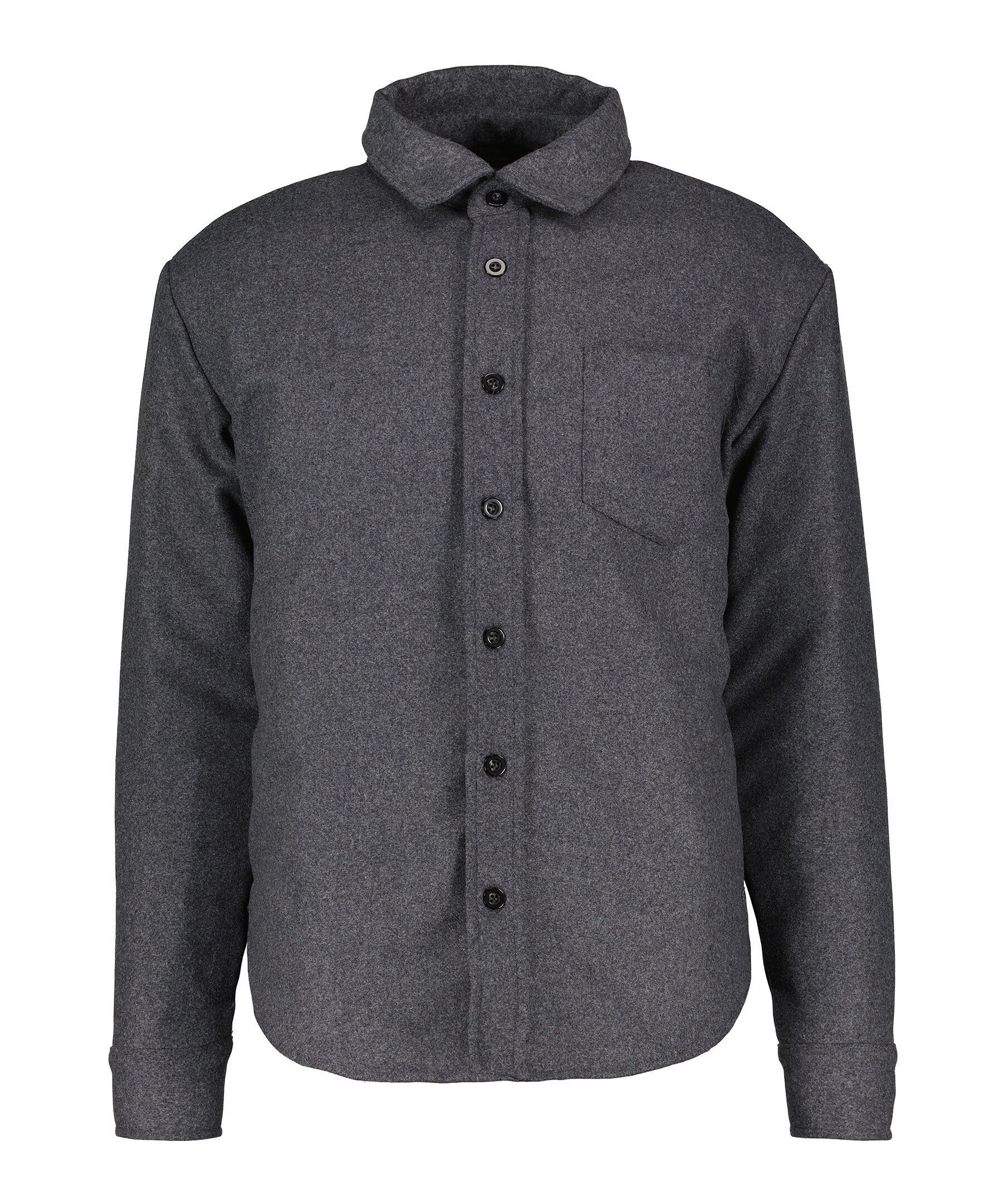 Gråmelerad, vadderad overshirt från Monel. Tillverkad i ullblandning. Stängs framtill med knappar. Bröstficka på vänster sida. Öppna fickor i sidan. Enkla manschetter. Modellen är 188cm lång och har på sig storlek M.