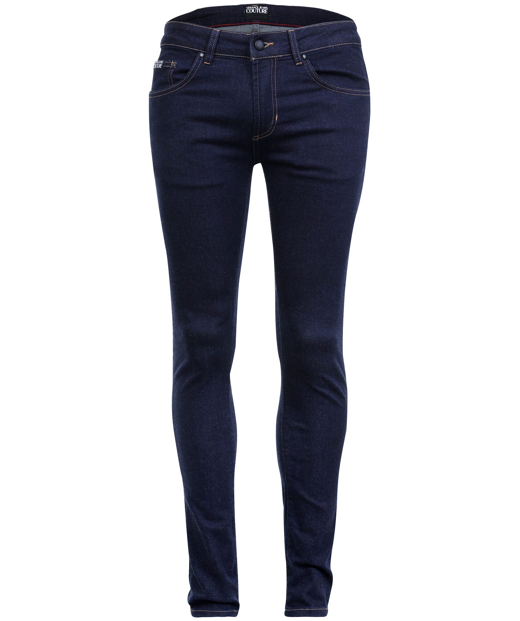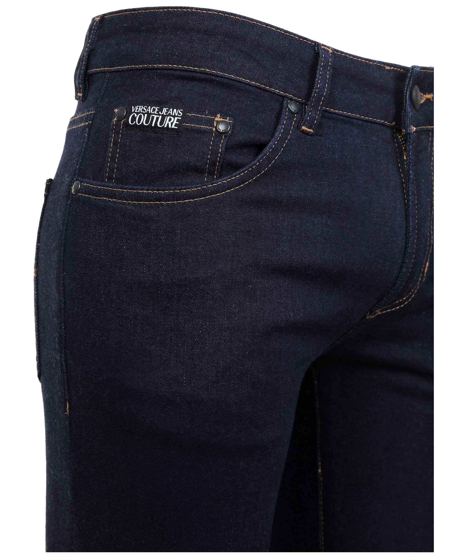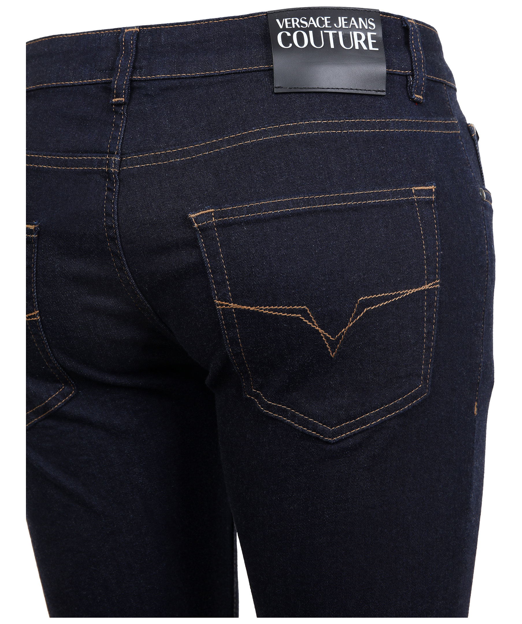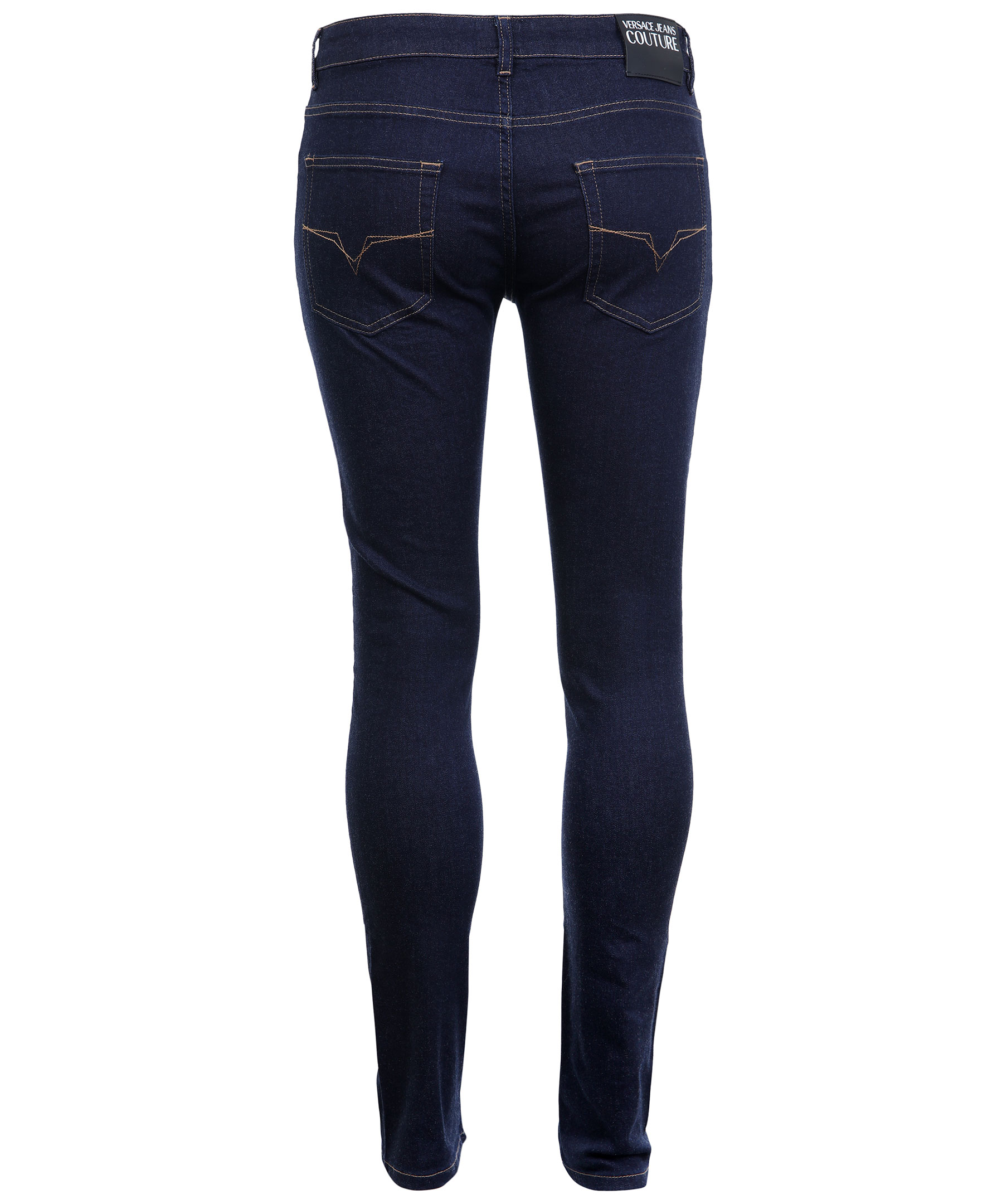Mörkblå jeans i slim fit modell från Versace Jeans Couture. En klassisk femficksmodell och broderad, läderlapp med logotyp på baksidan. Svarta, matta nitar som fäster fickorna. Gylf med dragkedja och matt, svart knapp.