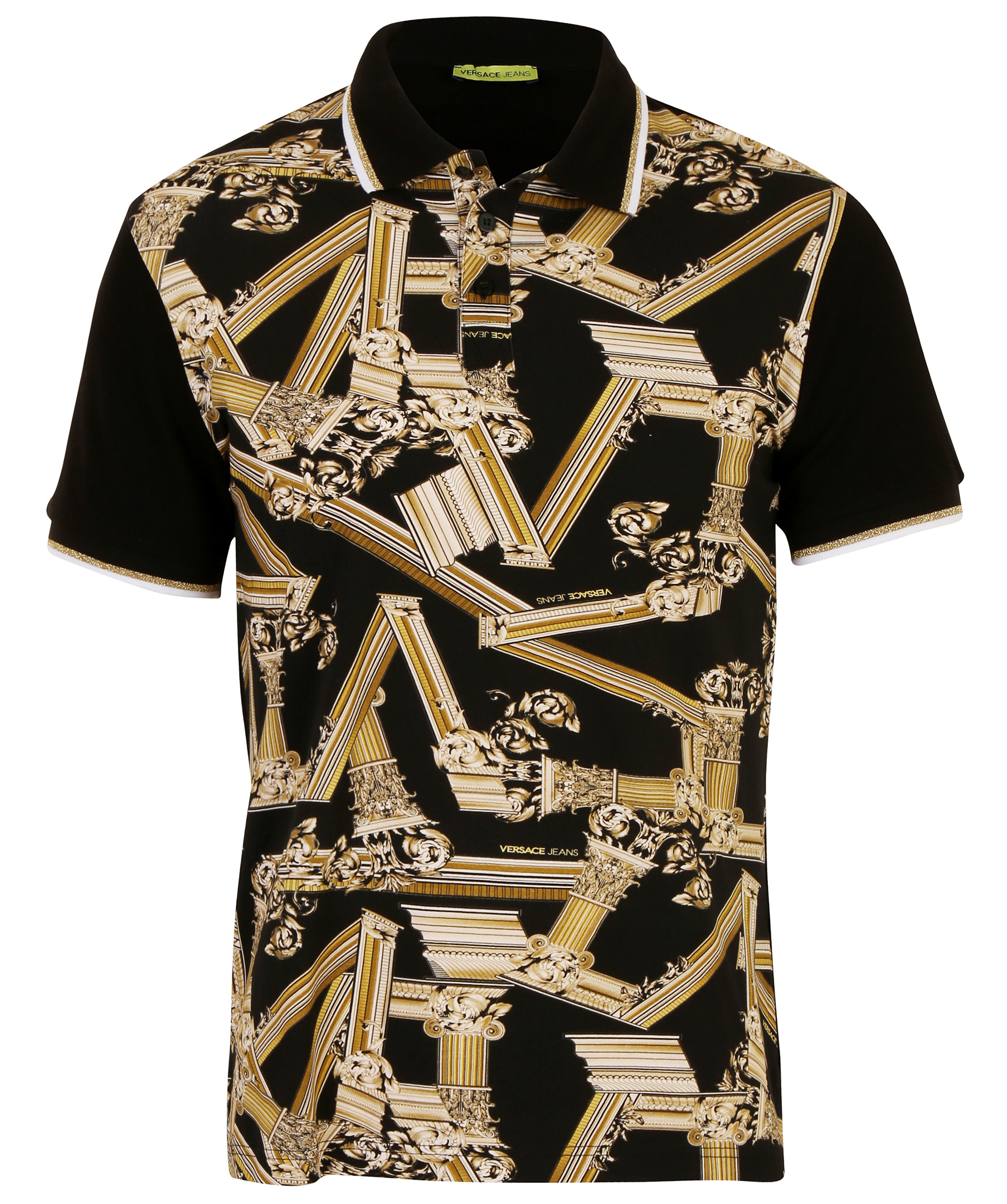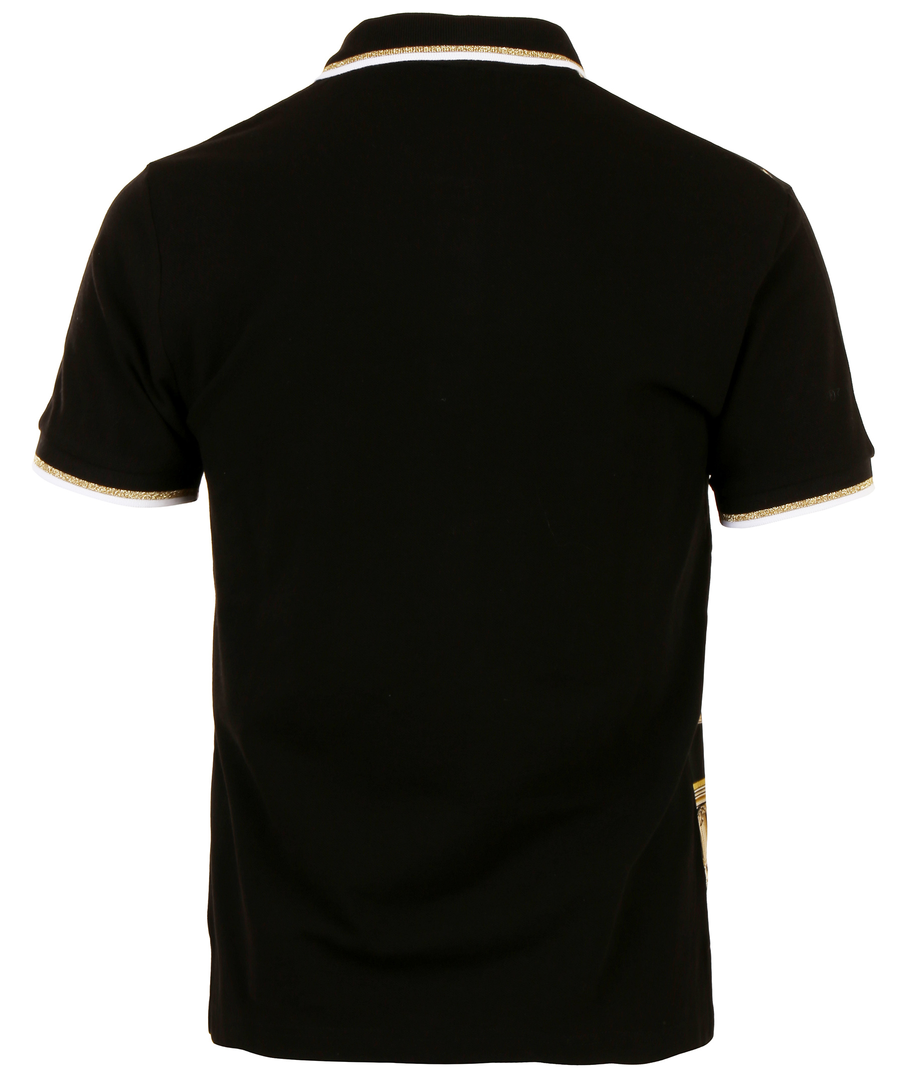 Svart pikétröja från Versace Jeans. Klassisk krage med kontrastfärgad rand och knappslå med tre knappar. Korta ärmar med kontrastfärgad rand. Guldfärgat tryck på bröstet.