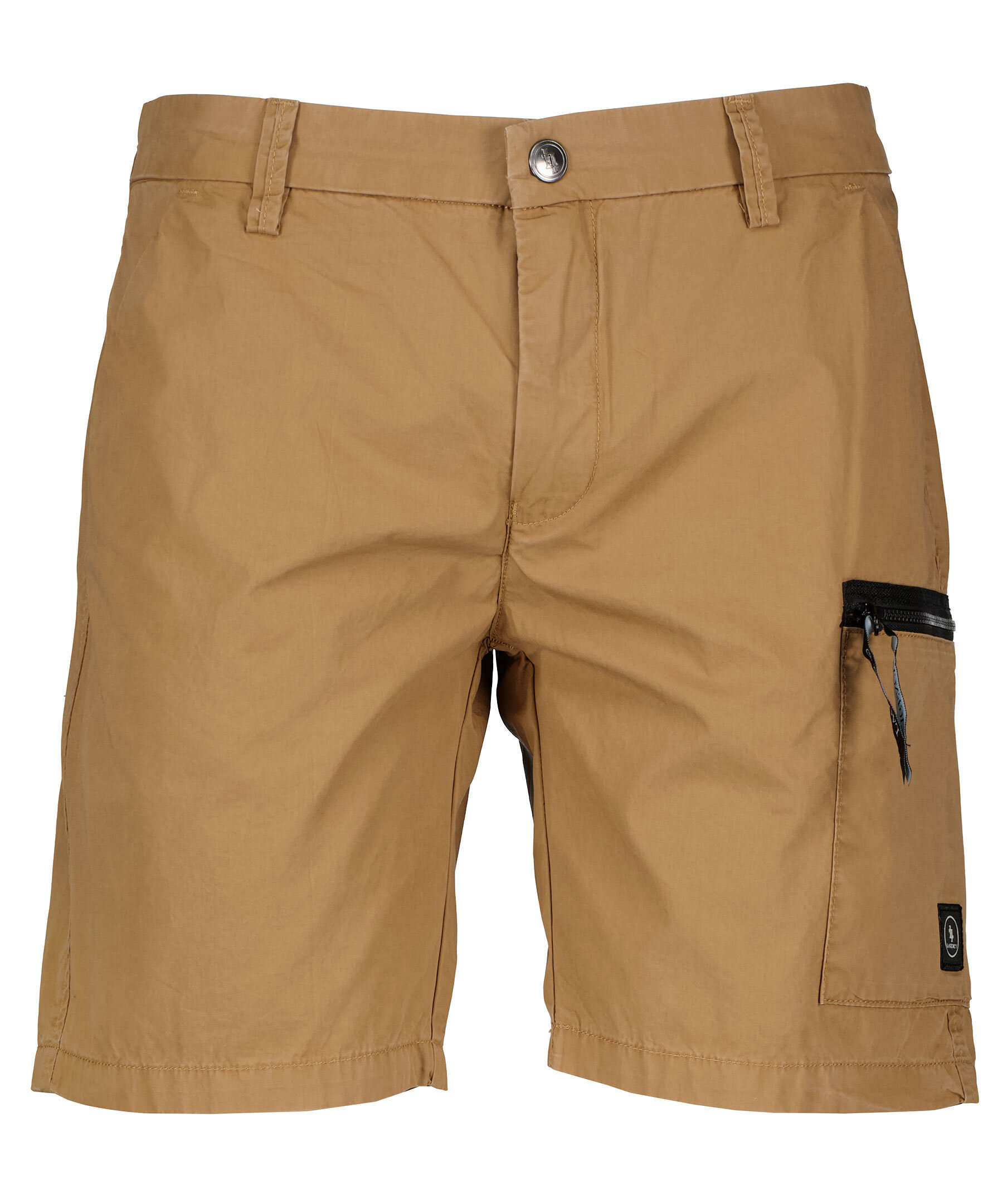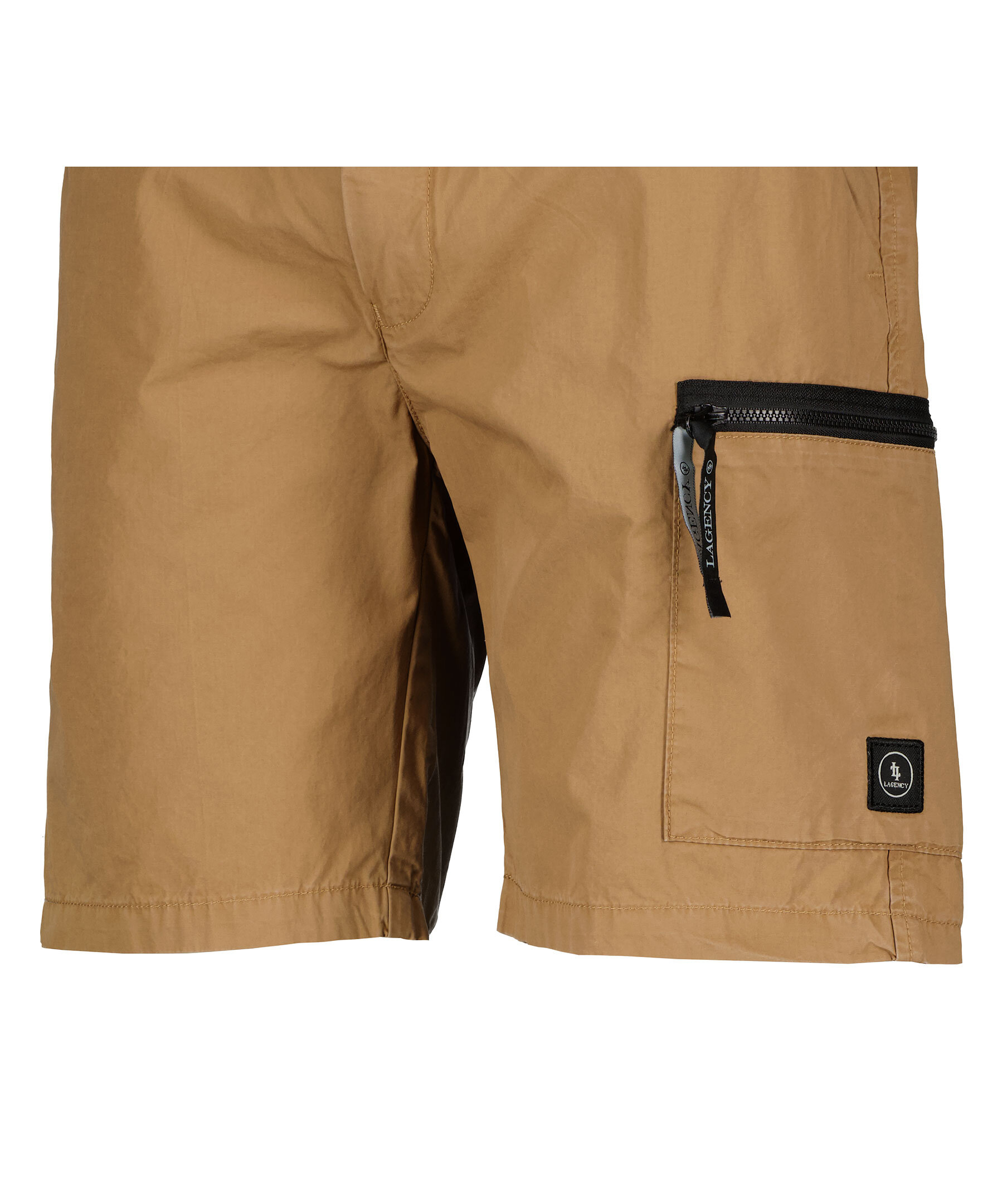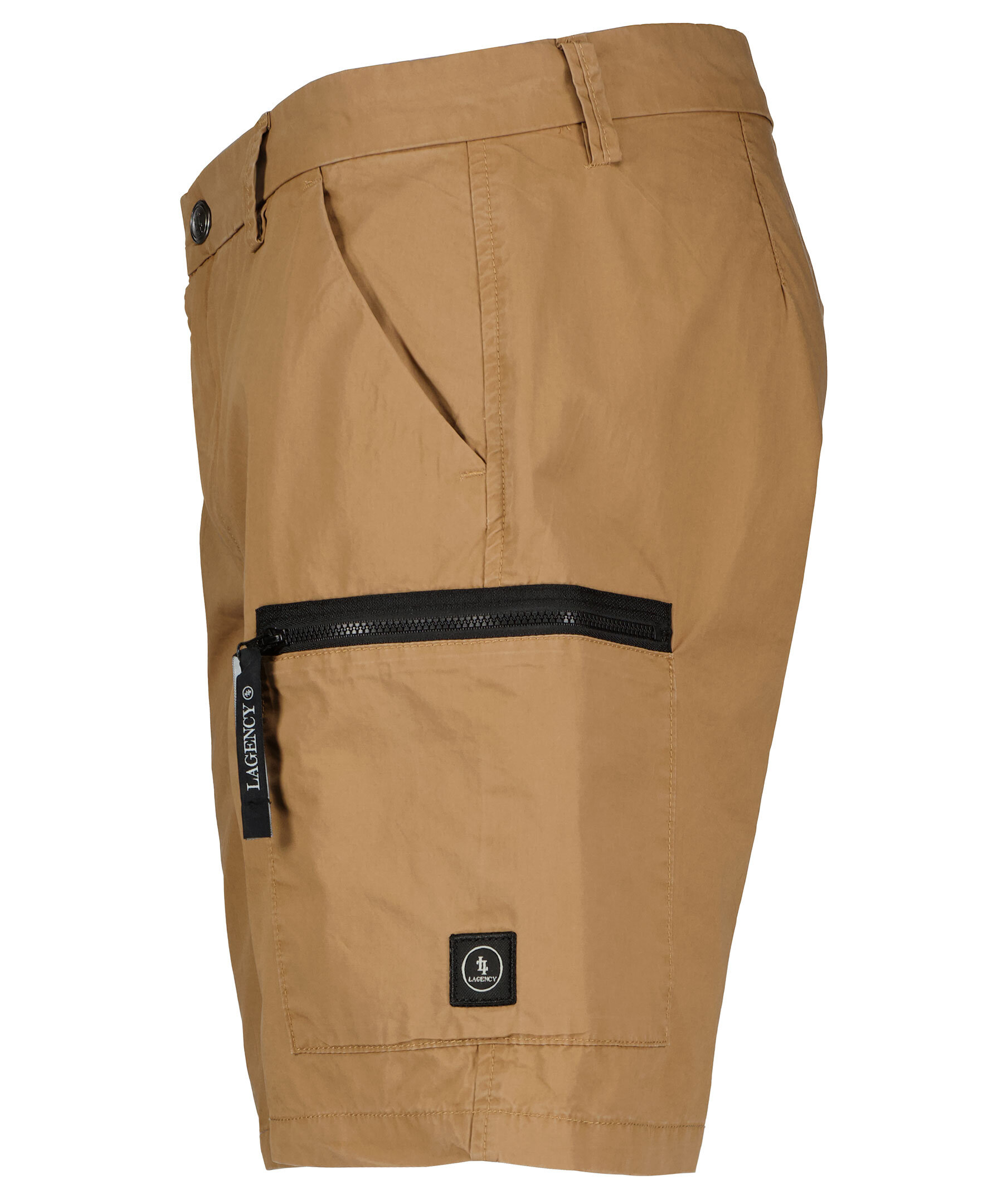 Bruna shorts från Lagency. Två fickor fram. Ficka som stängs med dragkedja på vänster ben. En ficka baktill. Hällor för skärp. Gylf med dragkedja och tryckknapp. Patch med logotyp på vänster ben.