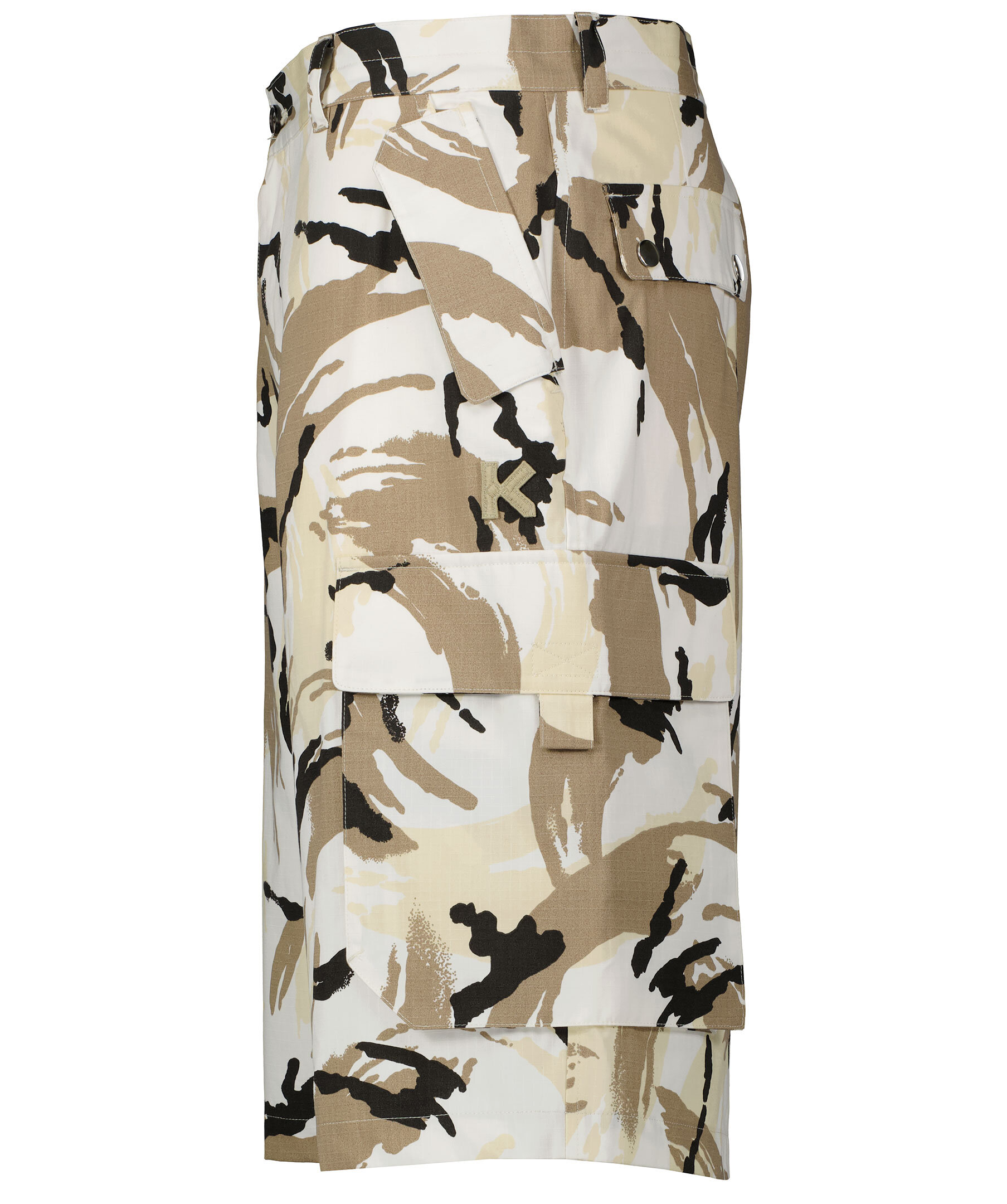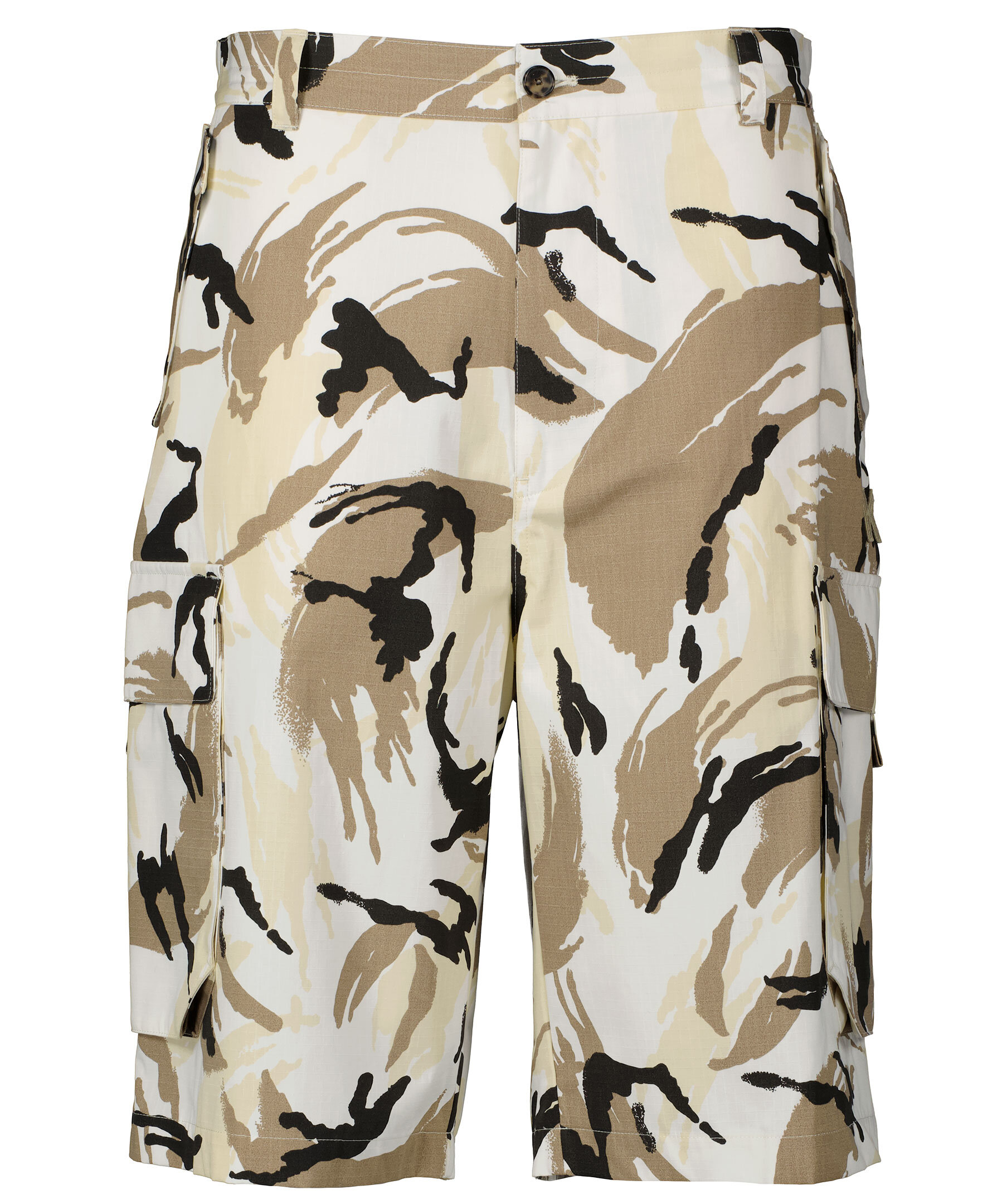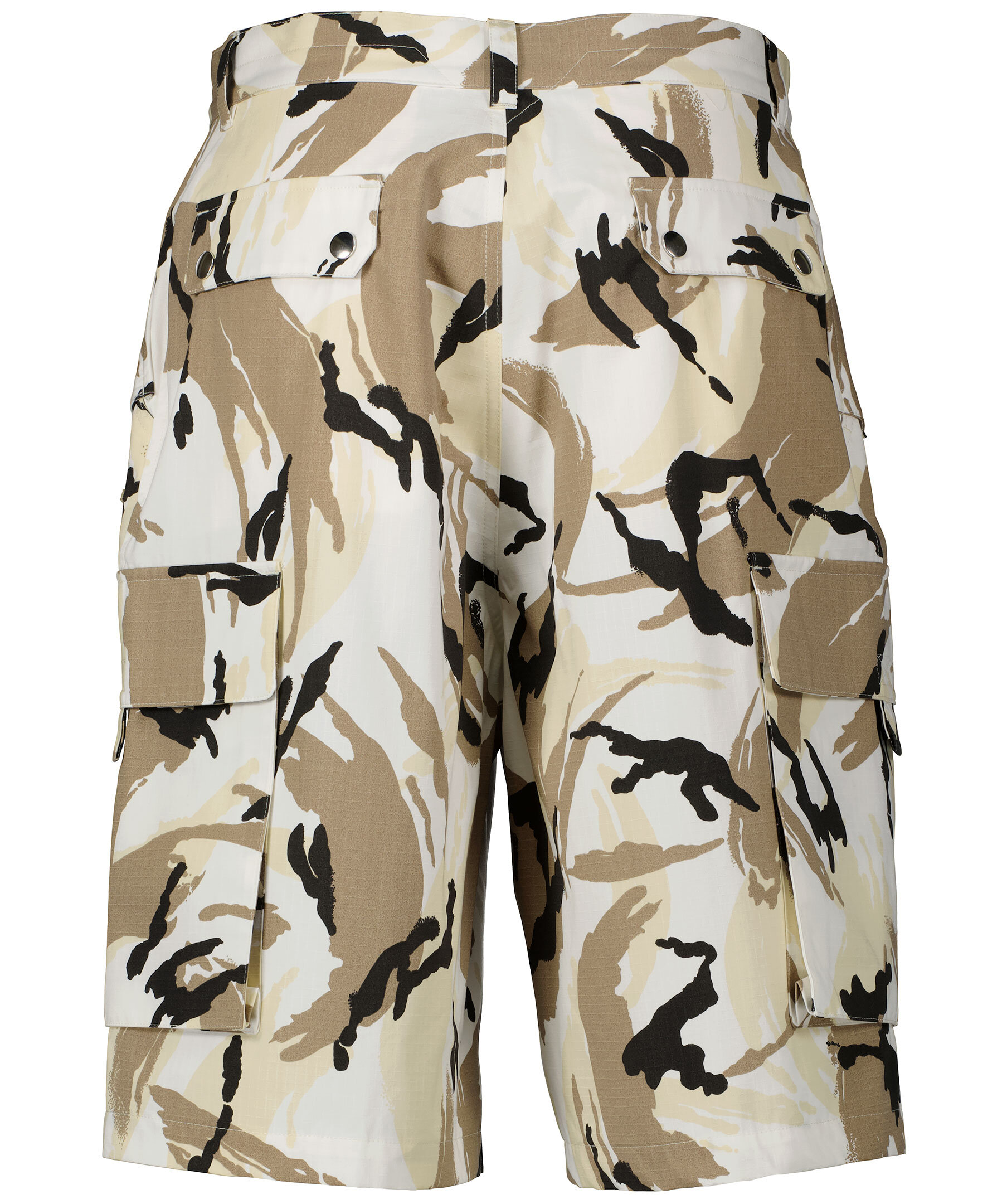 Kamouflerade cargoshorts i vitt, beige, brunt och svart från Kenzo. vid modell, fickor i sidorna med ficklock som stängs med tryckknappar, bakfickor med ficklock och tryckknappar samt fickor på sidorna av benen med ficklock. Hällor för skärp och gylf med dragkedja och knapp. Tillverkade i 100% bomull.