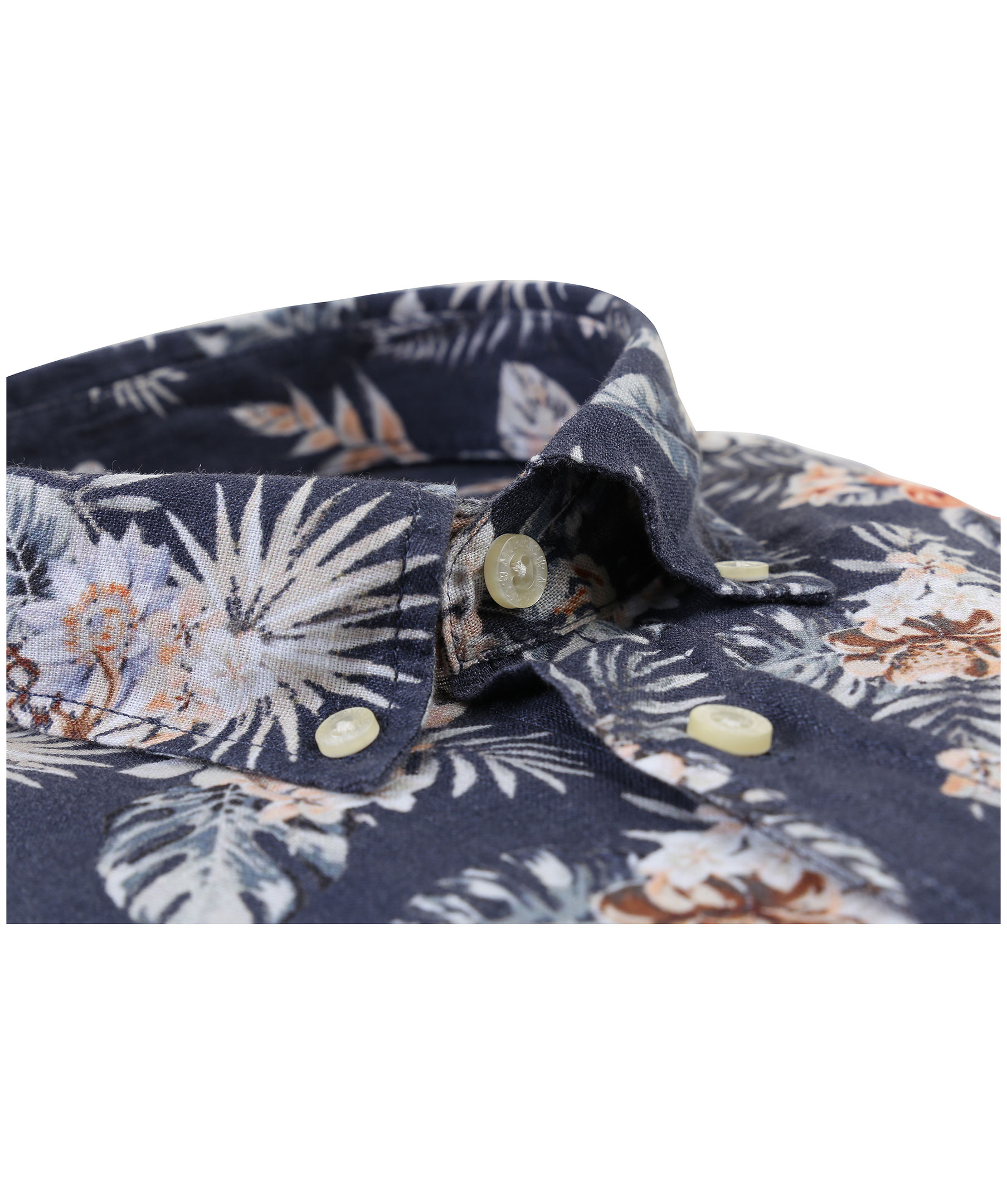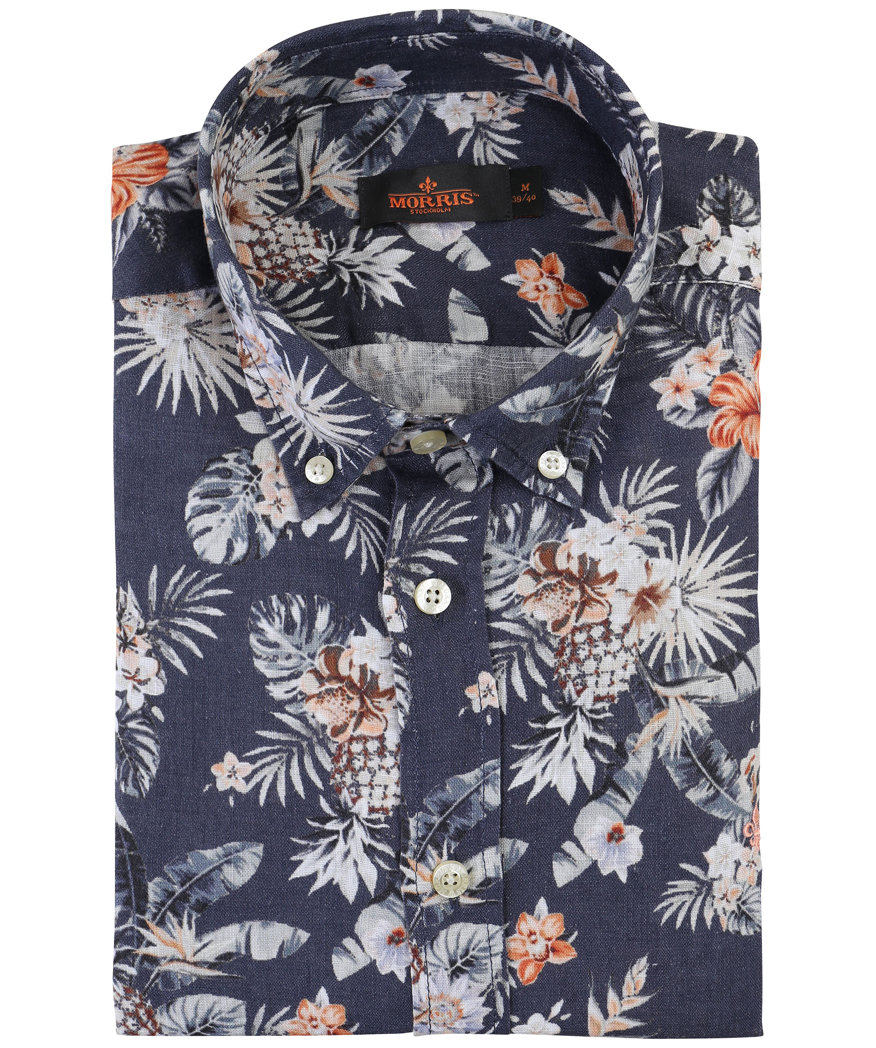 Blå, mönstrad linneskjorta från Morris. Normal passform, långa ärmar och button down krage. Broderad logotyp på vänster bröst.