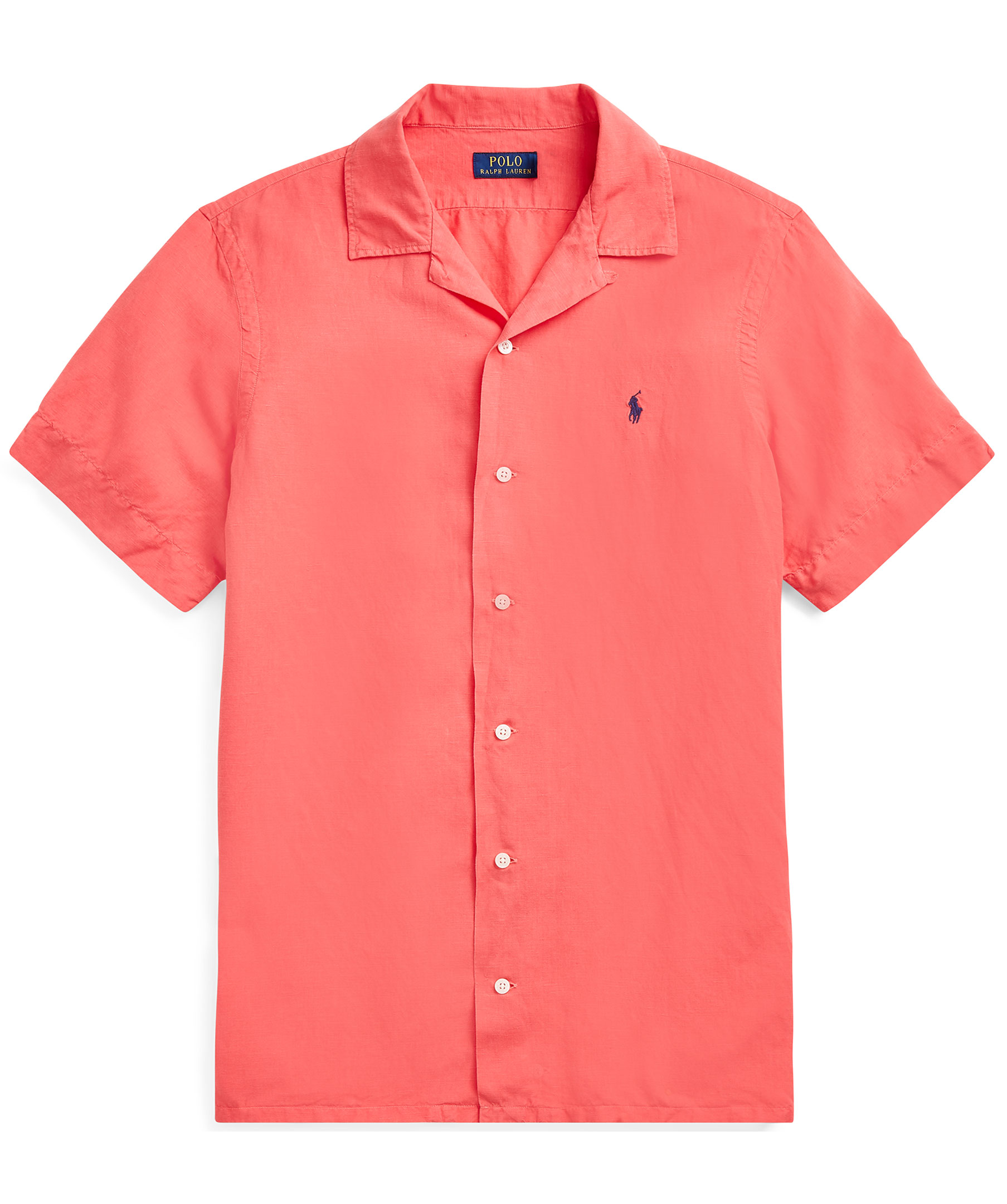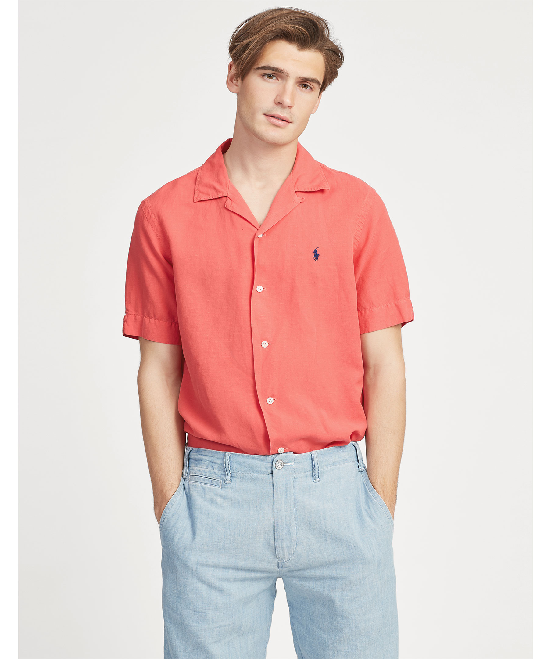Ljusröd linneskjorta från Polo Ralph Lauren med korta ärmar. Broderad logotyp på bröstet, ljusa knappar.