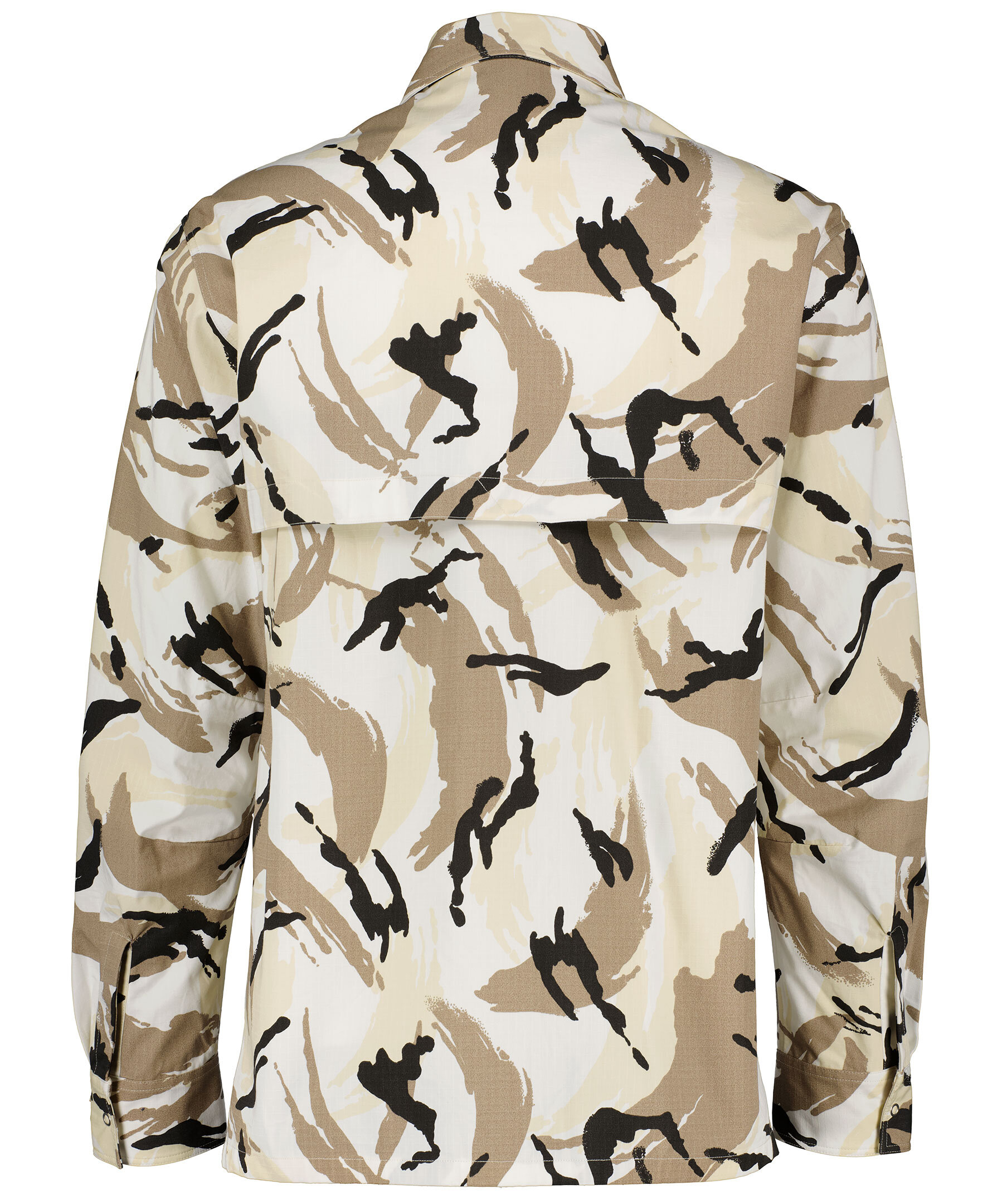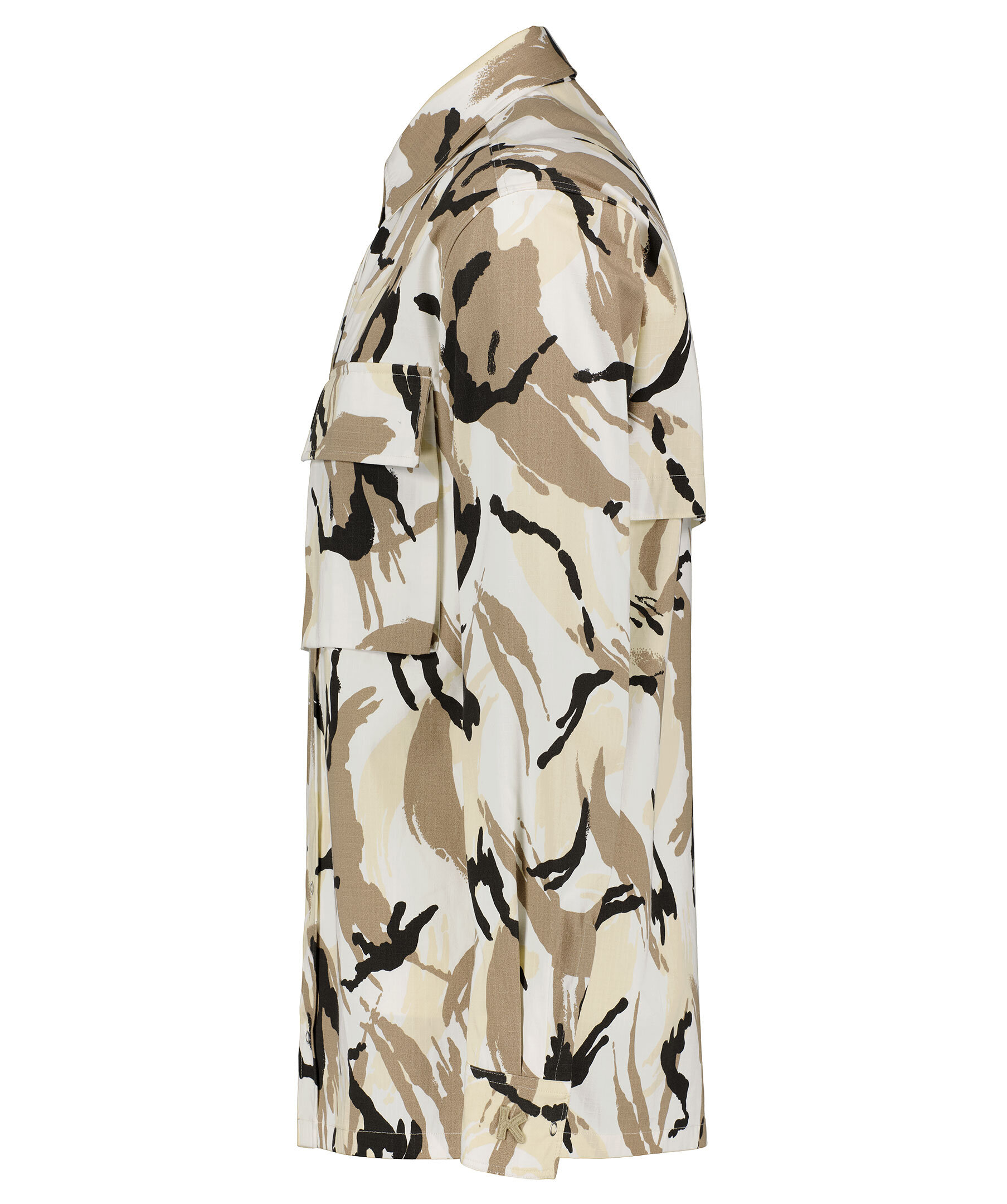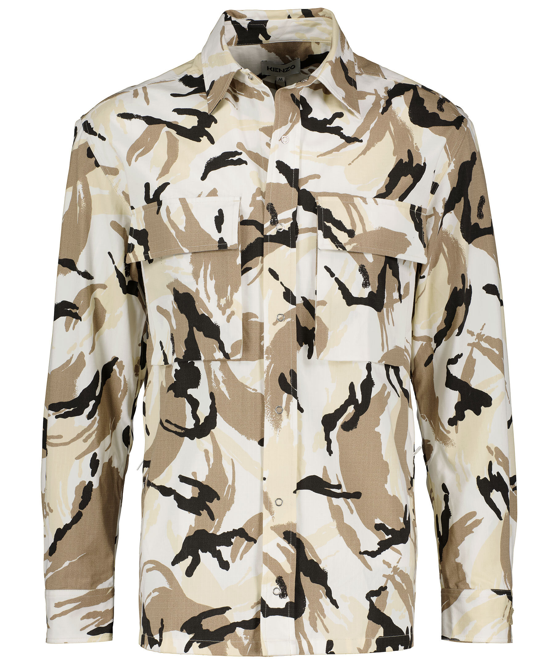 Beige, kamouflagemönstrad overshirt i oversizemodell från Kenzo. Broderad logga på ärmslutet på vänster ärm. Tryckknappar, två bröstfickor med ficklock som stängs med kardborre. Dragkedjor i sidorna som kan öppnas med tunt meshtyg under för att få in luft. Tillverkad i kraftigt bomullstyg. *Overshirt *Tryckknappar *Dubbla bröstfickor