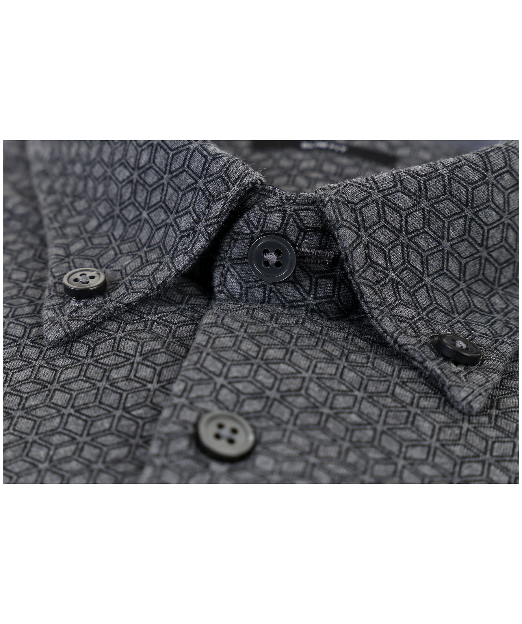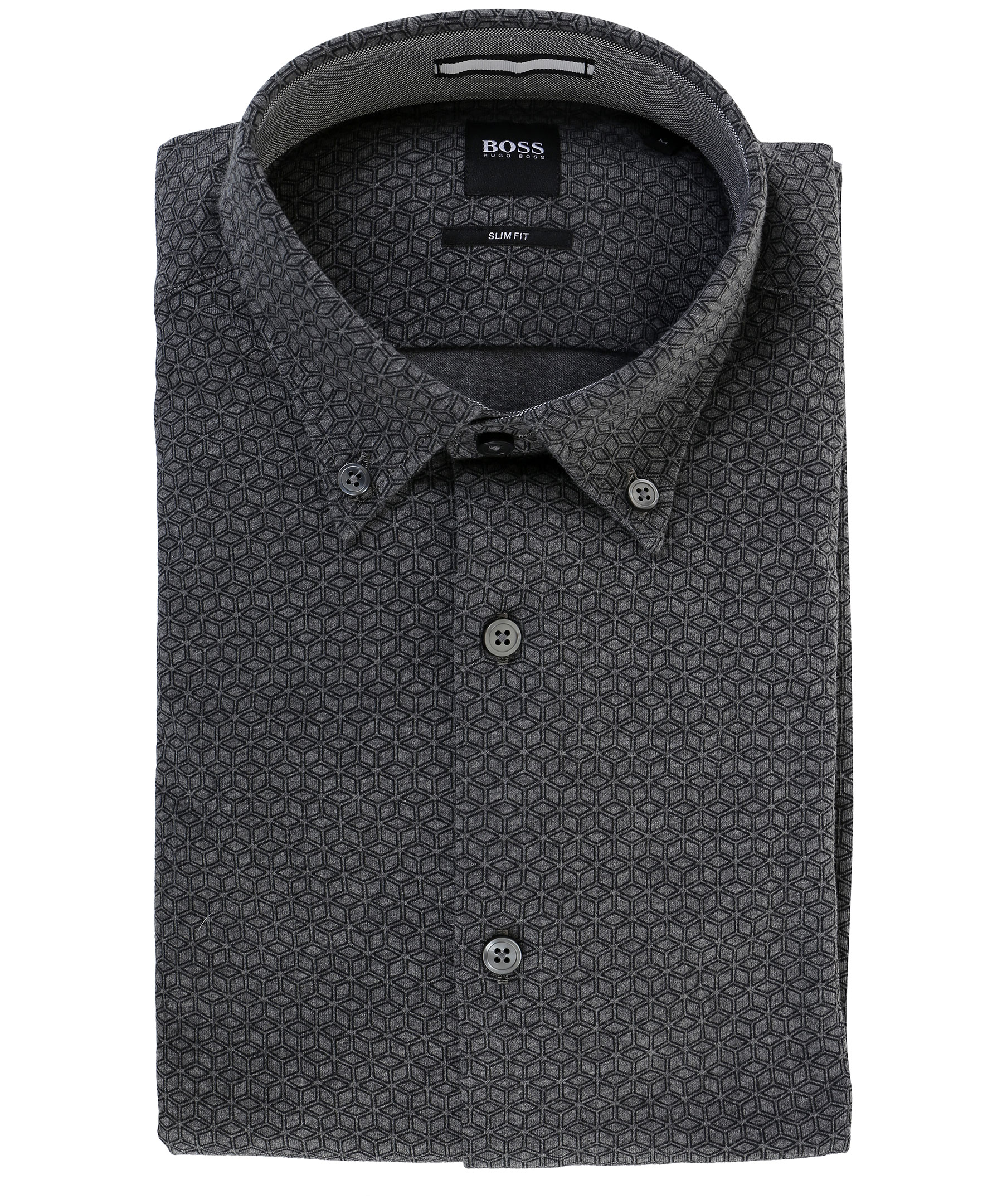 Grå skjorta i slim fit modell från Hugo Boss. Tillverkad i mjukt jerseytyg som är gjort i bomull. Skjortan har ett geometriskt mönster och en klassisk button down krage.