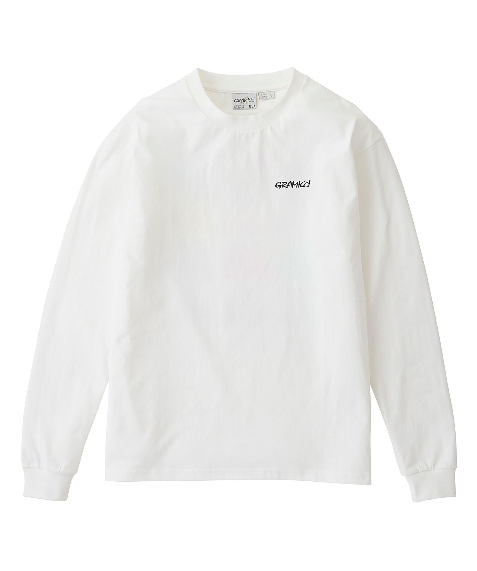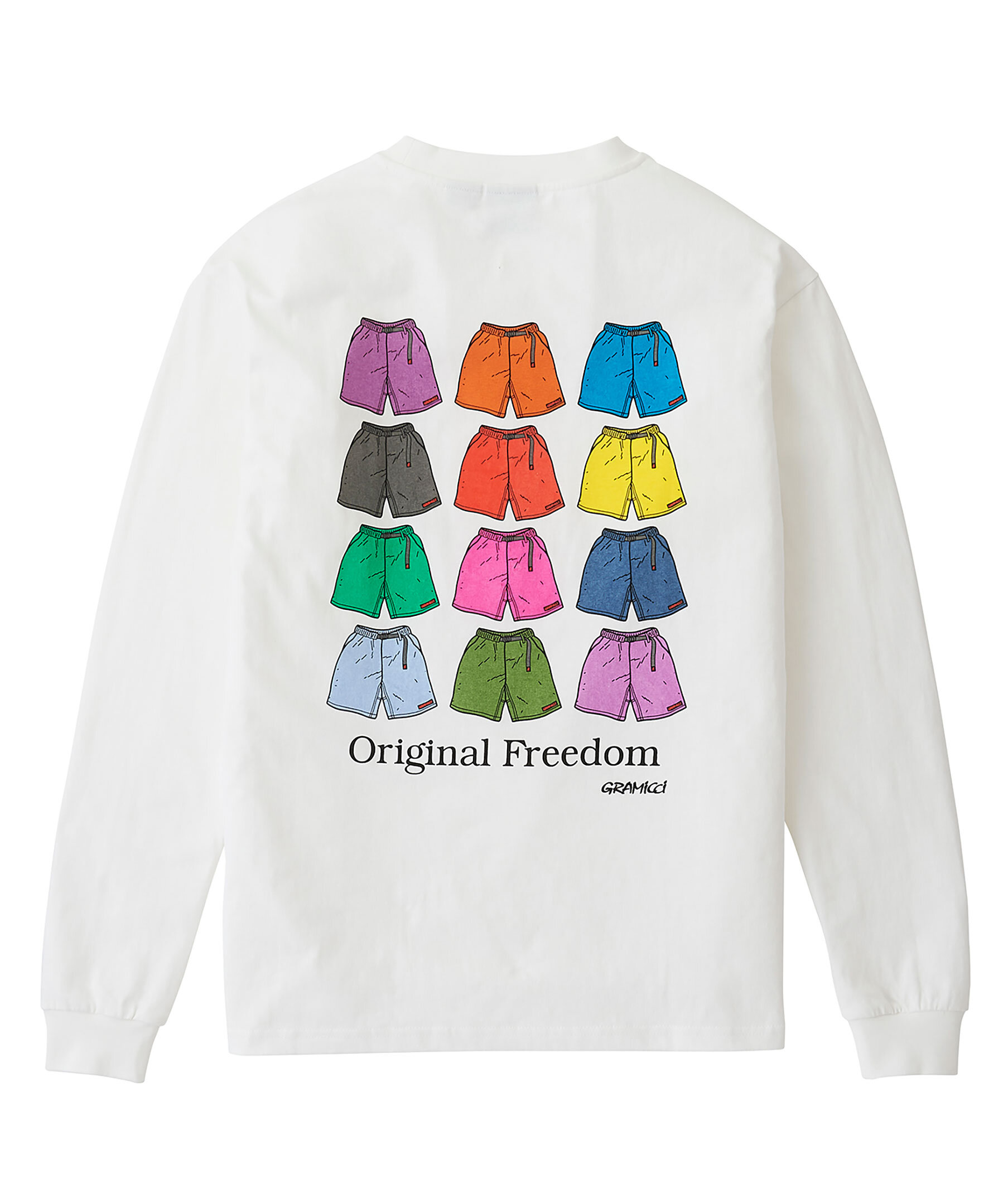 Vit långärmad t-shirt från Gramicci. Gjord i 100% bomull, crew neck, ribbade muddar vid halsring och ärmslut. Liten svart logotyp tryckt på bröstet samt ett stort tryck längst hela ryggen föreställande shorts i olika färger och texten "original freedom" under.