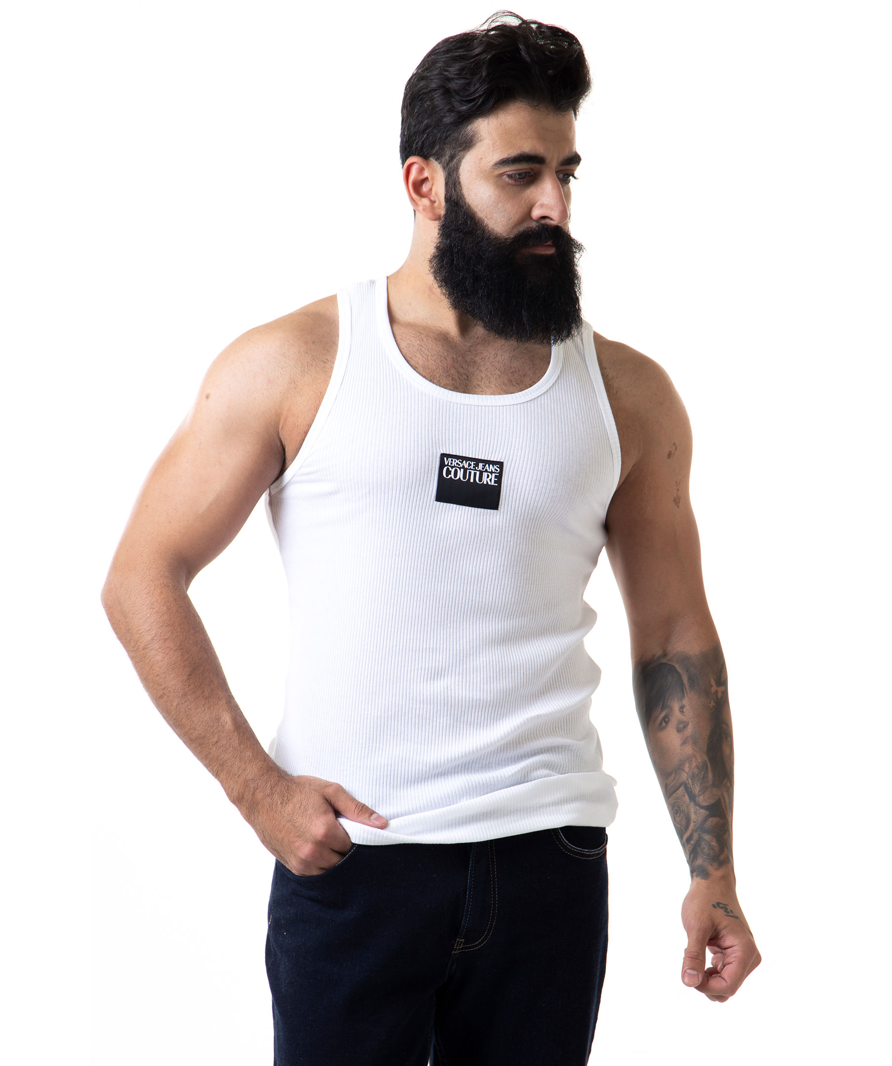 Vitt linne från Versace Jeans Couture. Tillverkad helt i bomull. Logotyp framtill. Modellen är 177 cm lång och bär storlek M.