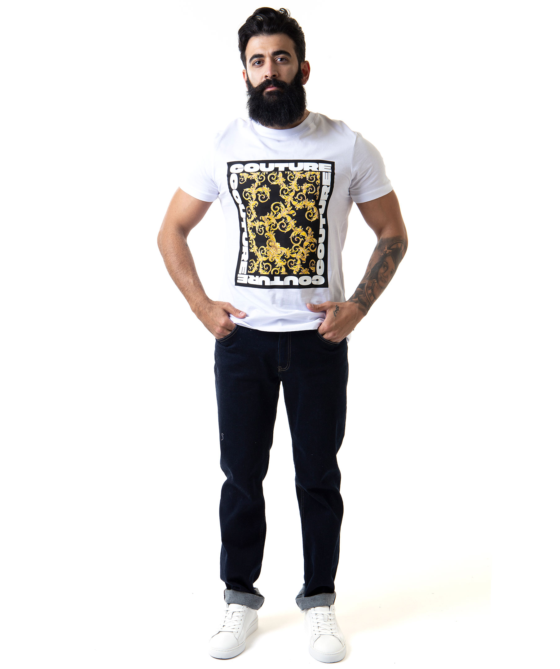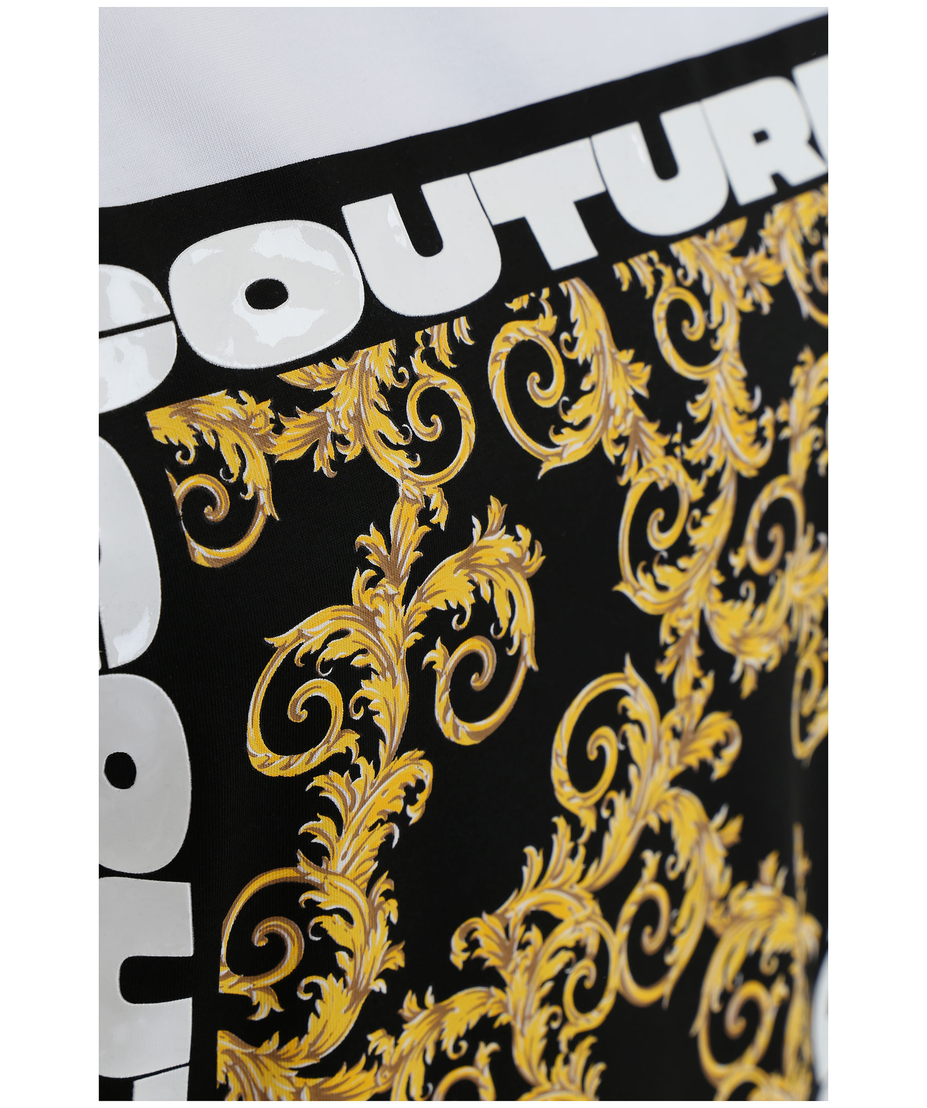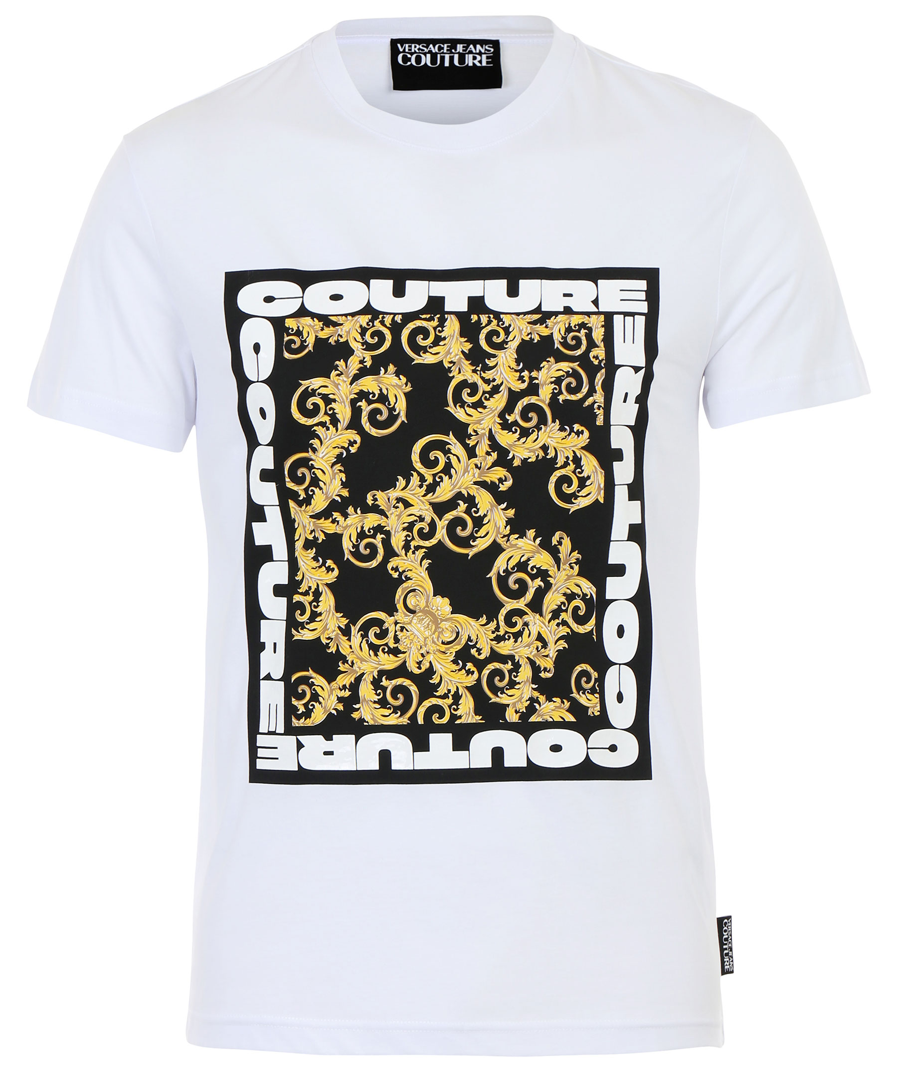 Vit t-shirt från Versace Jeans Couture. T-shirten är gjord i skön bomull, har ett stort mönstrad tryck på bröstet med gummerad logotyp i vitt runt omkring. Modellen är 177 cm lång och bär storlek M.
