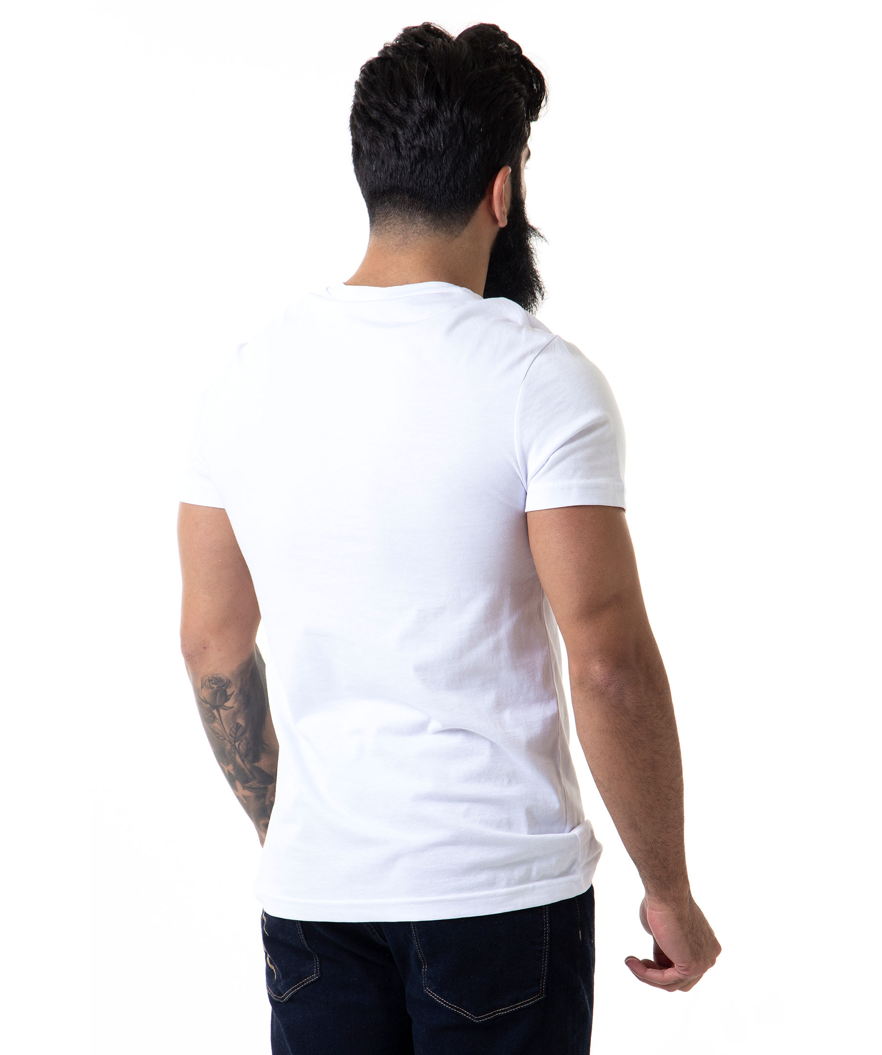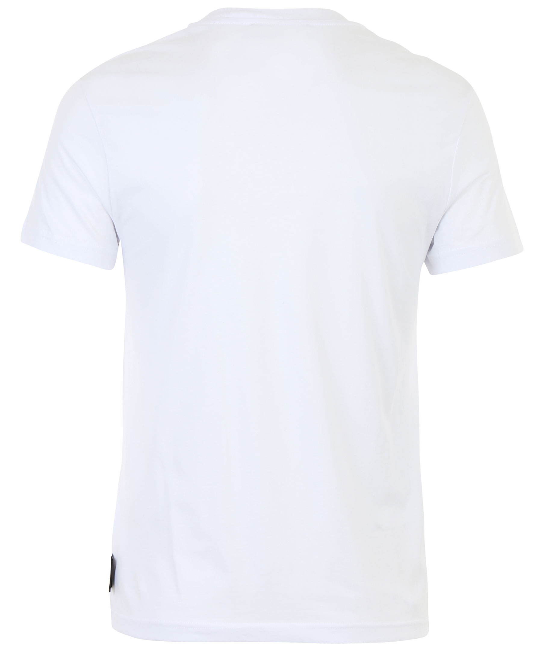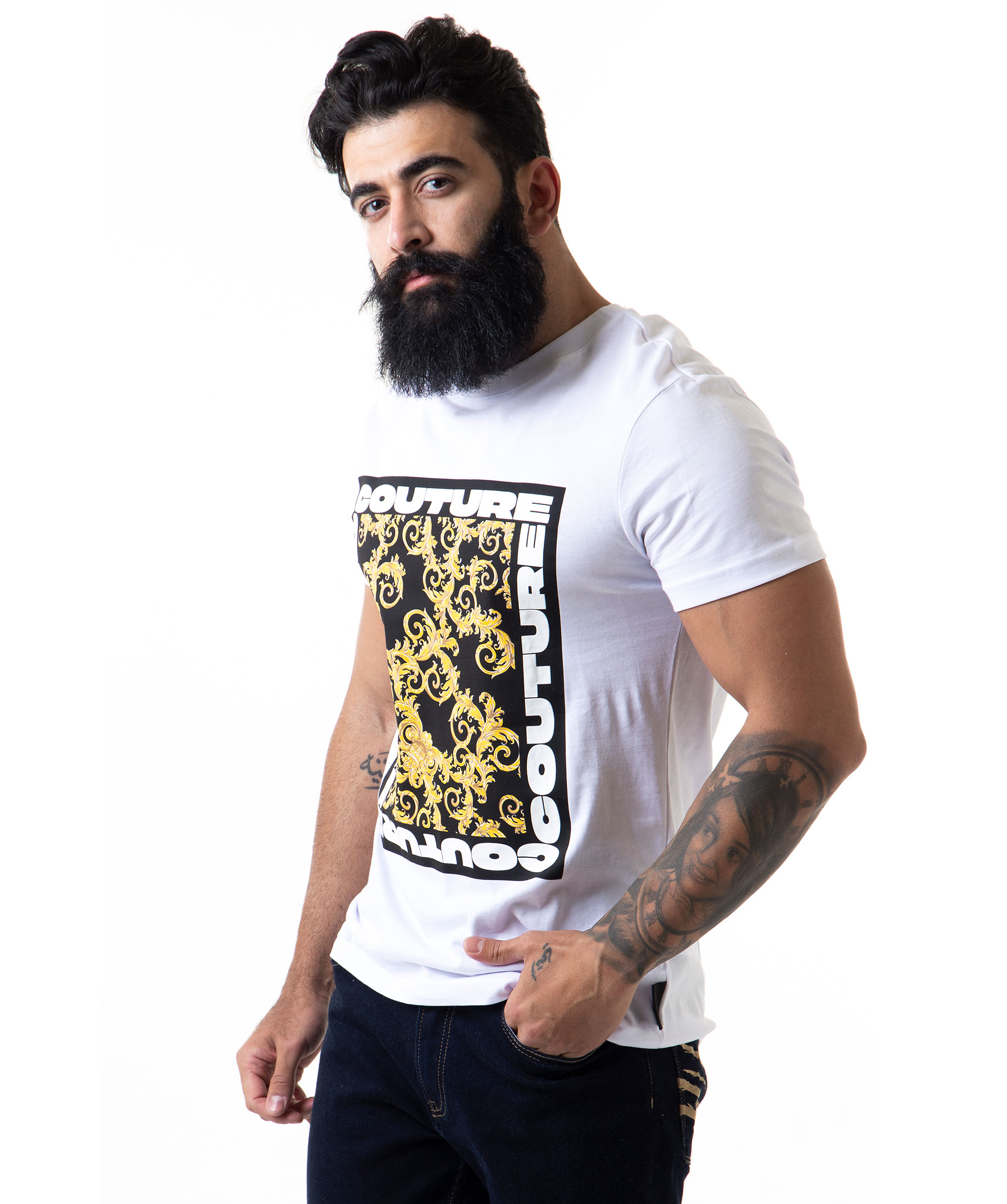 Vit t-shirt från Versace Jeans Couture. T-shirten är gjord i skön bomull, har ett stort mönstrad tryck på bröstet med gummerad logotyp i vitt runt omkring. Modellen är 177 cm lång och bär storlek M.