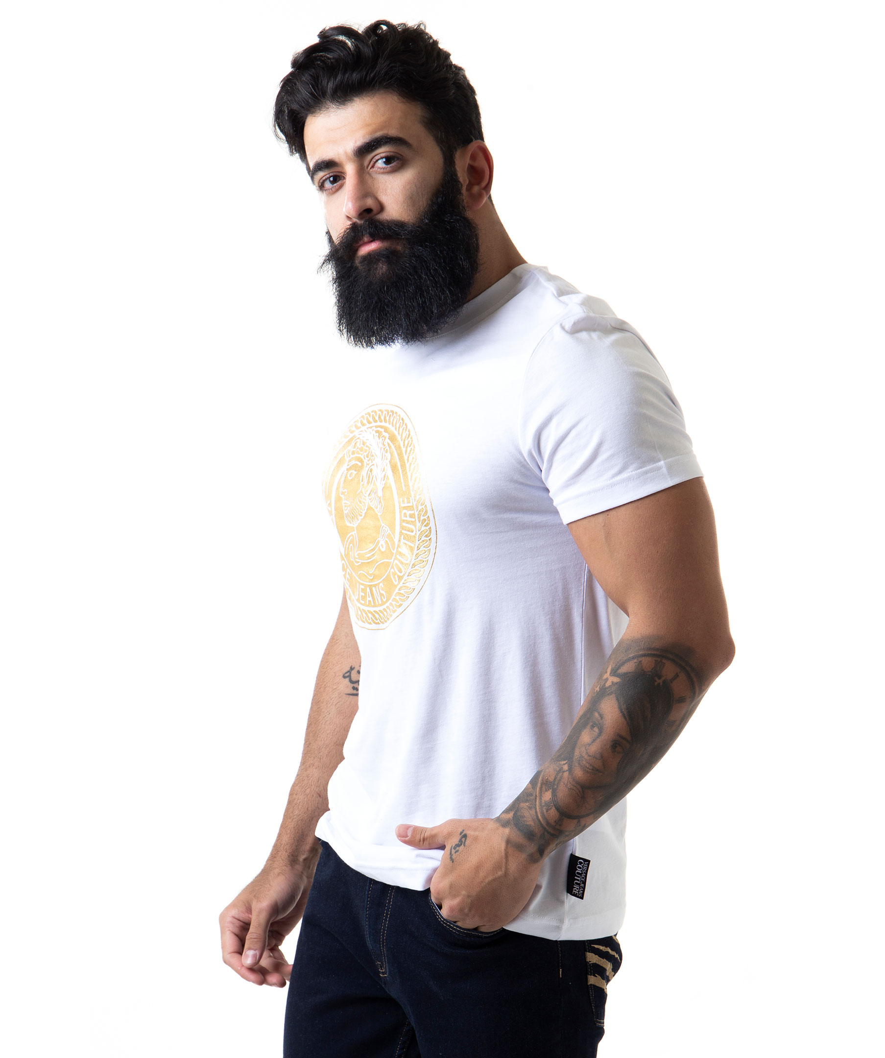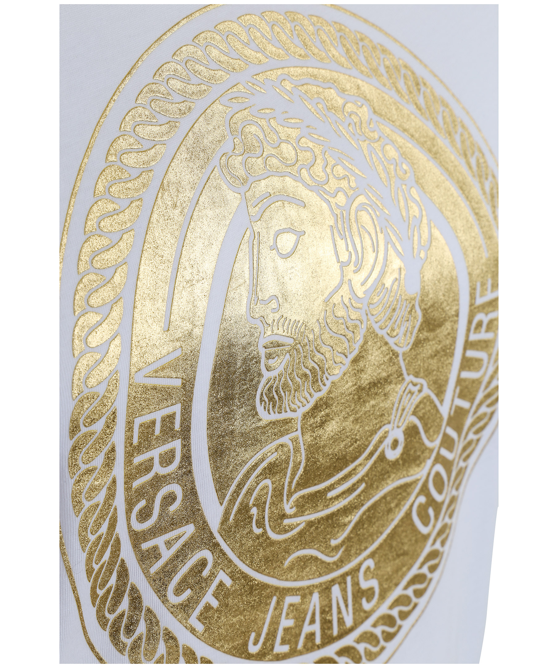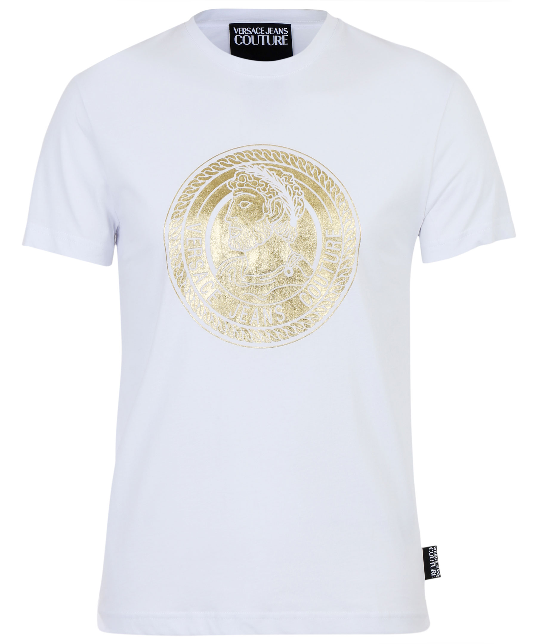 Vit t-shirt från Versace Jeans Couture med gummerat guldfärgat tryck på bröstet. Modellen är 177 cm lång och bär storlek M.
