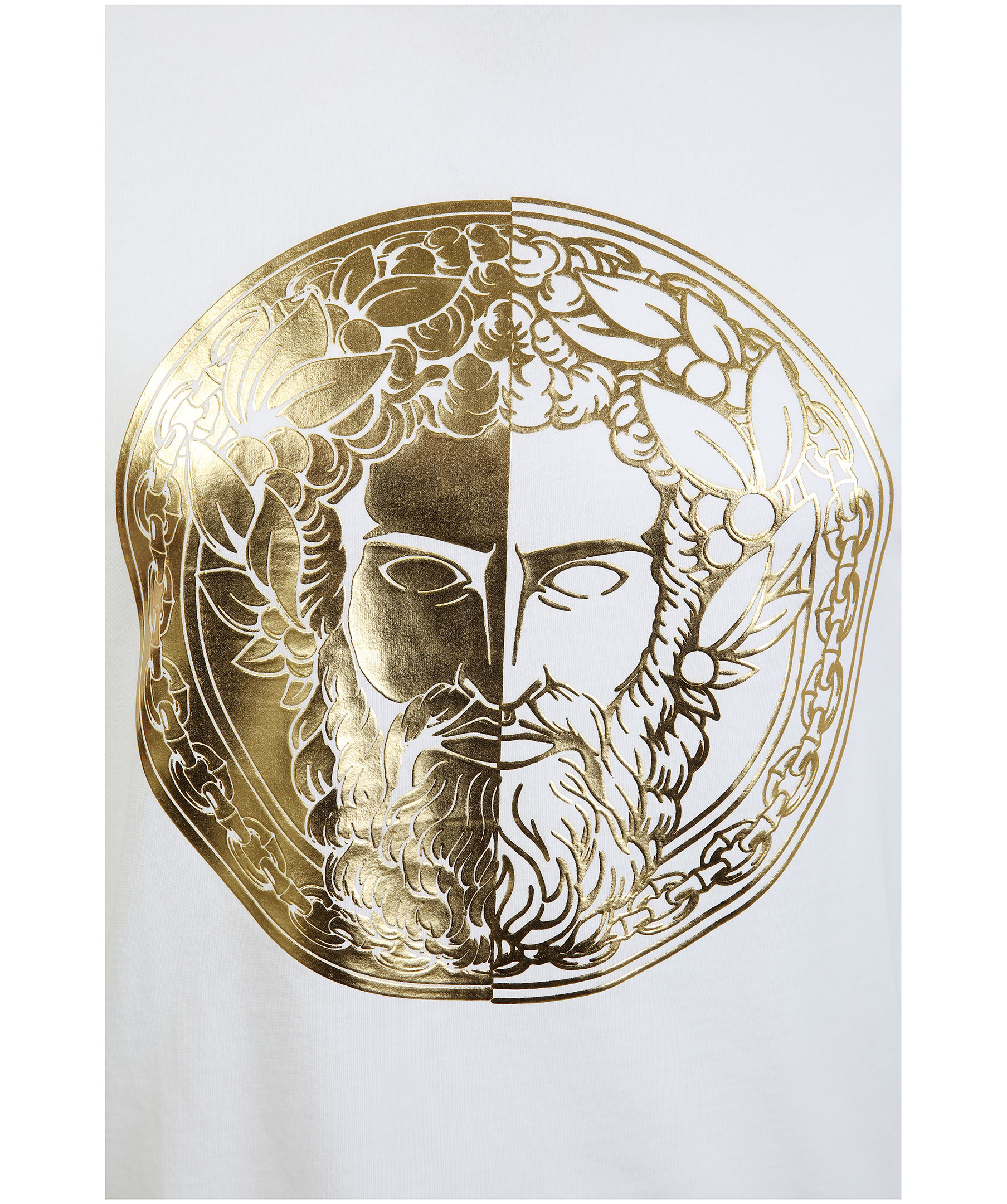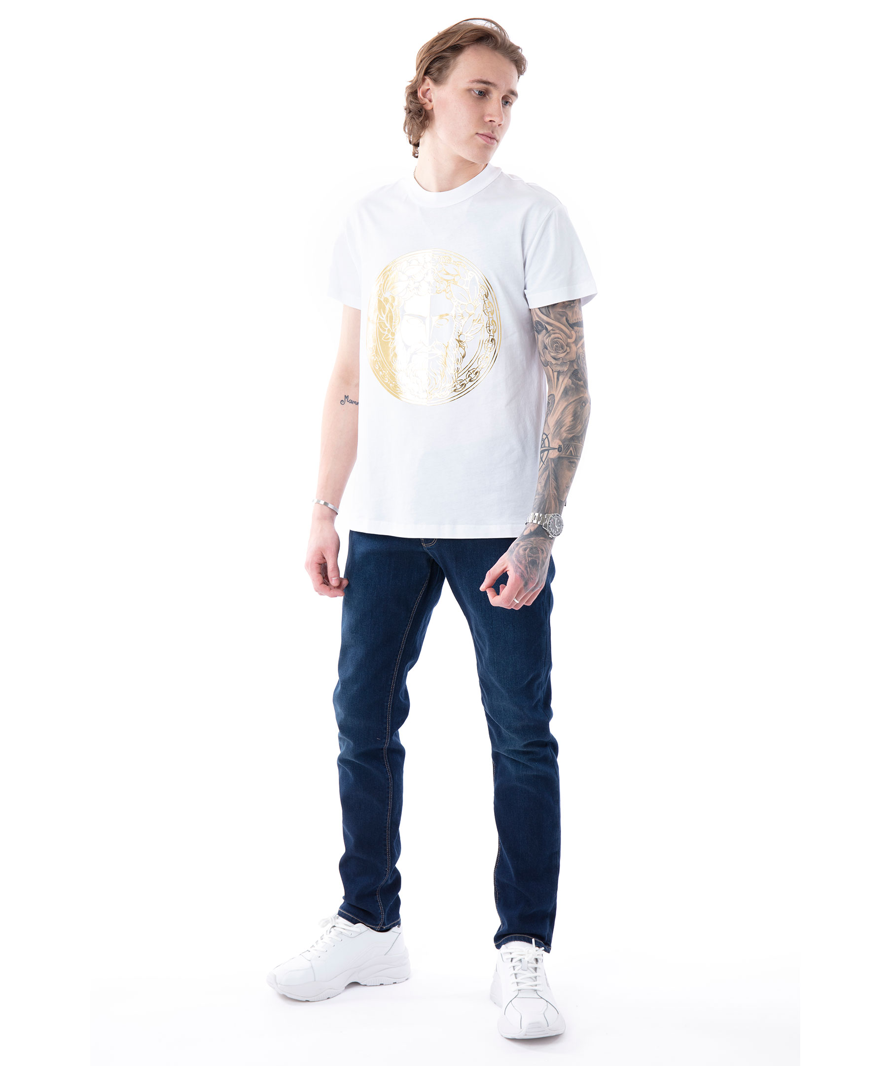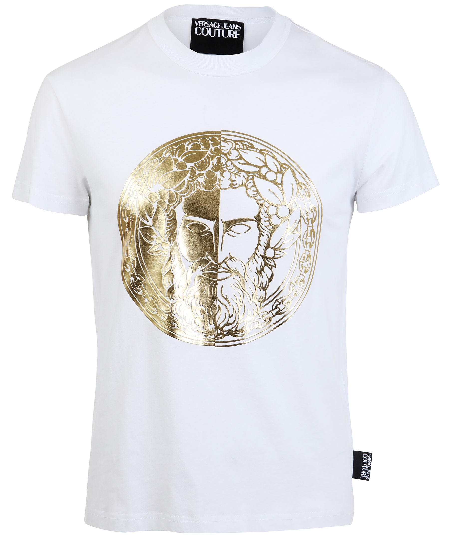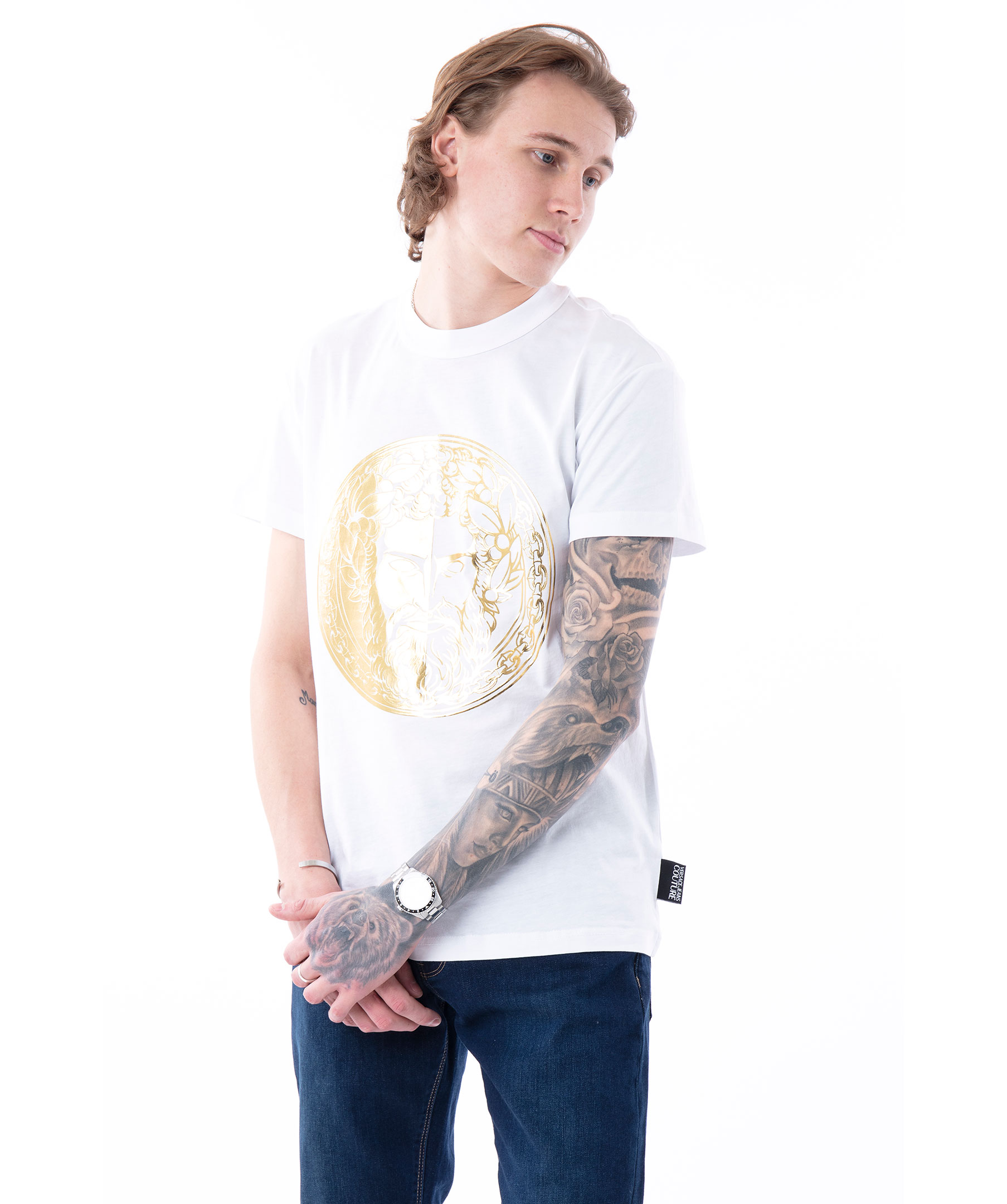 Vit t-shirt från Versace Jeans Couture. Stort guldfärgat, runt tryck på bröstet. Rundad halsringning. Tillverkad i bomull. Modellen är 180 cm lång och bär storlek M.