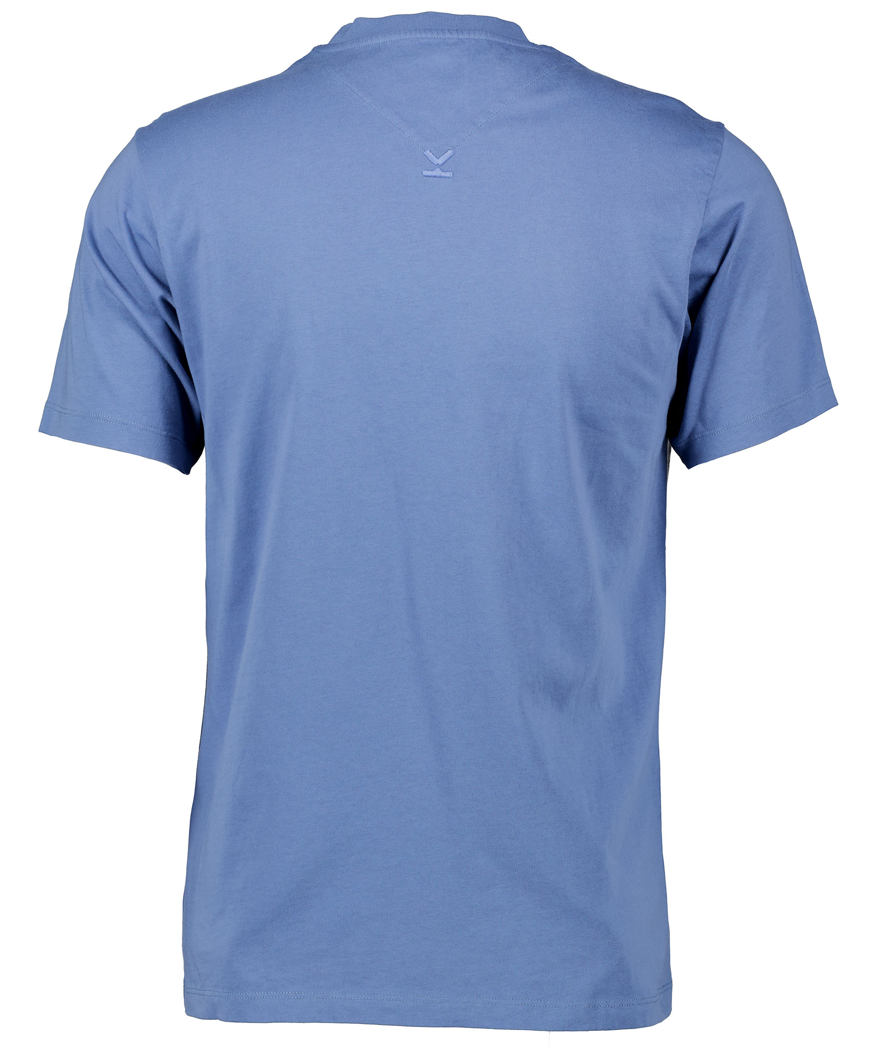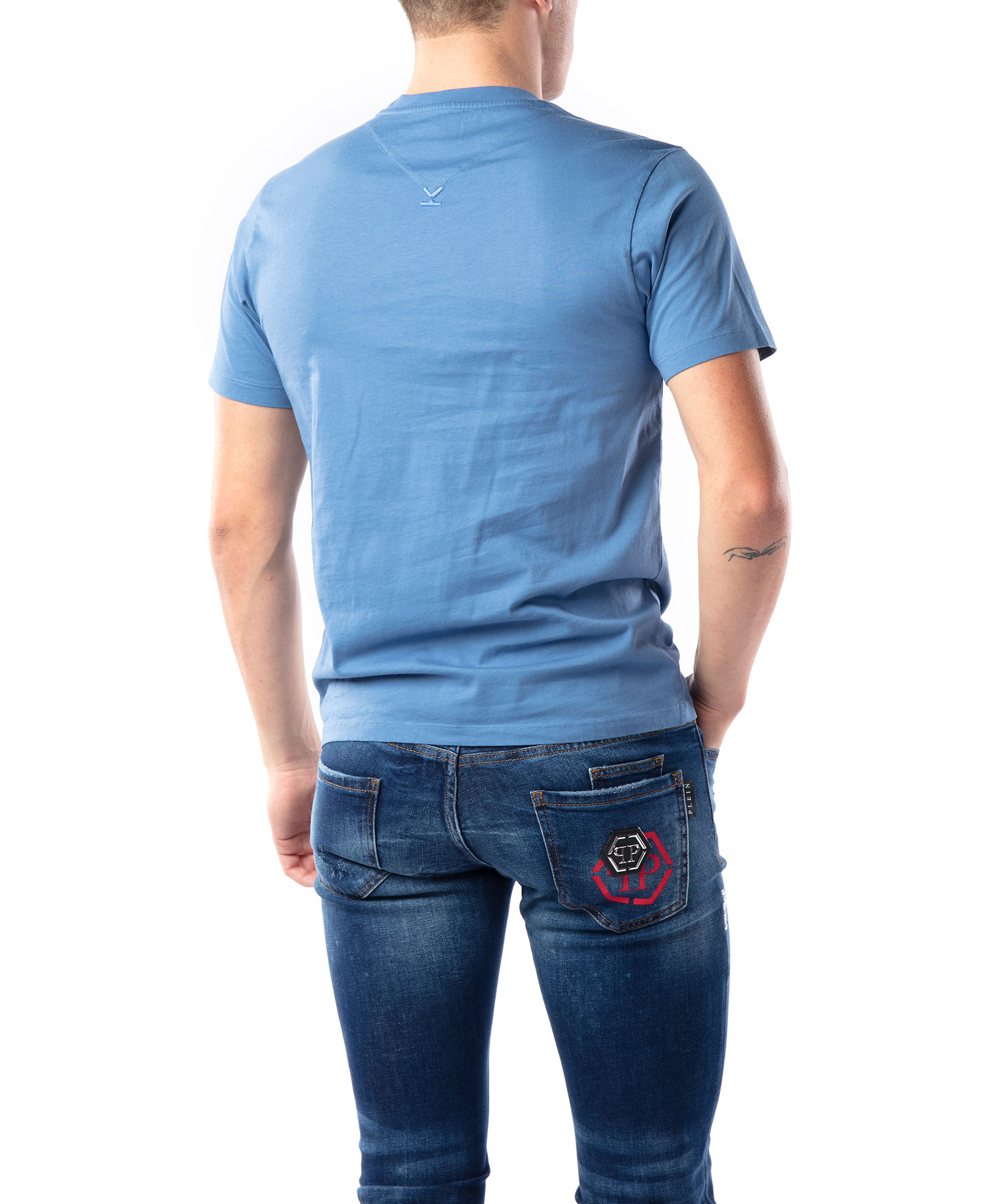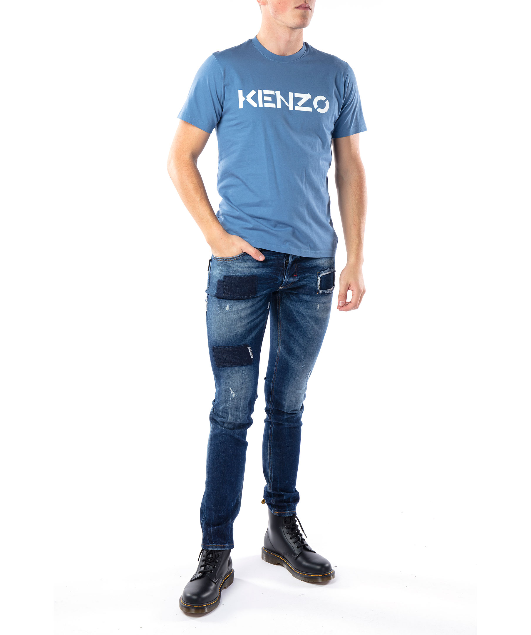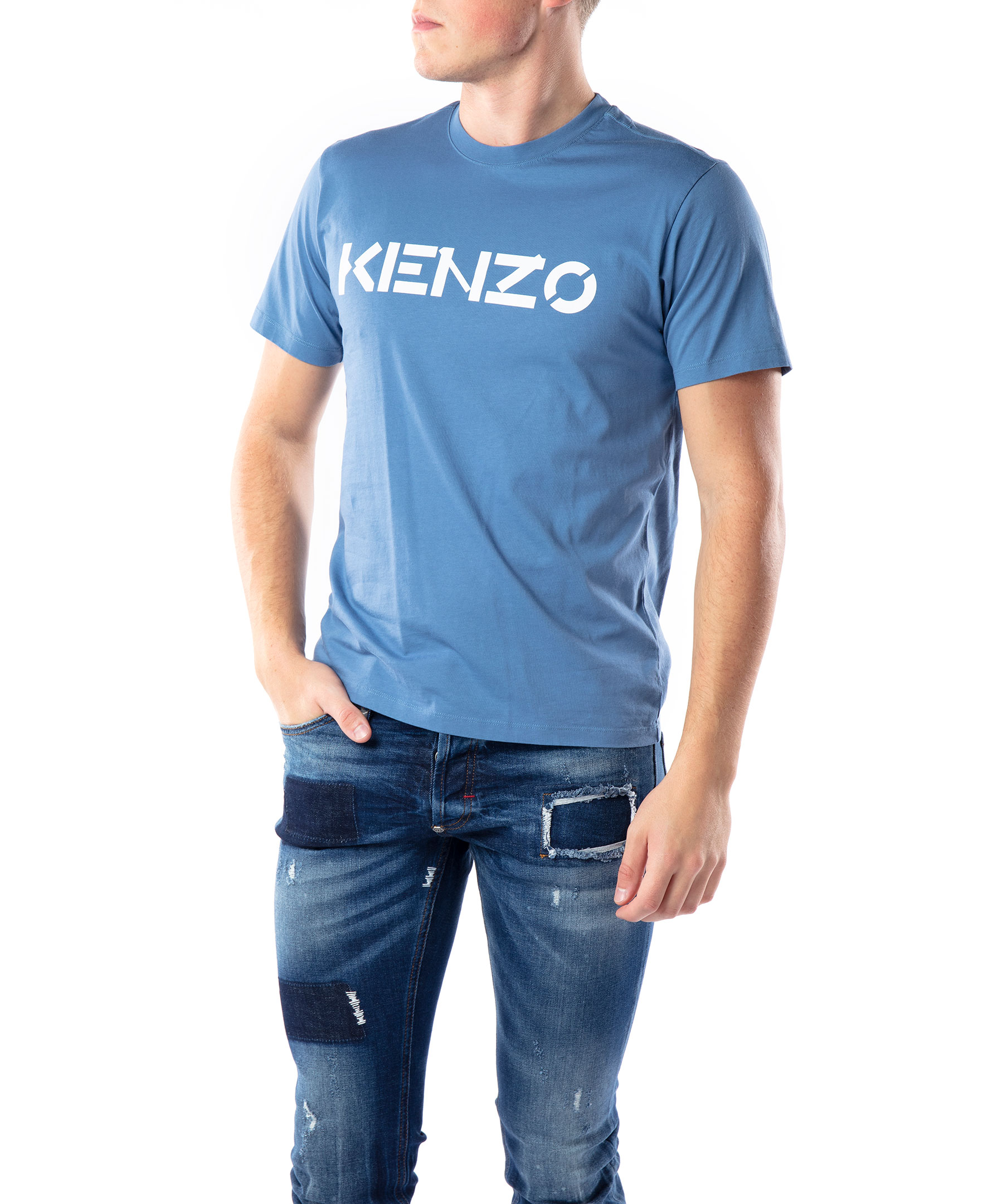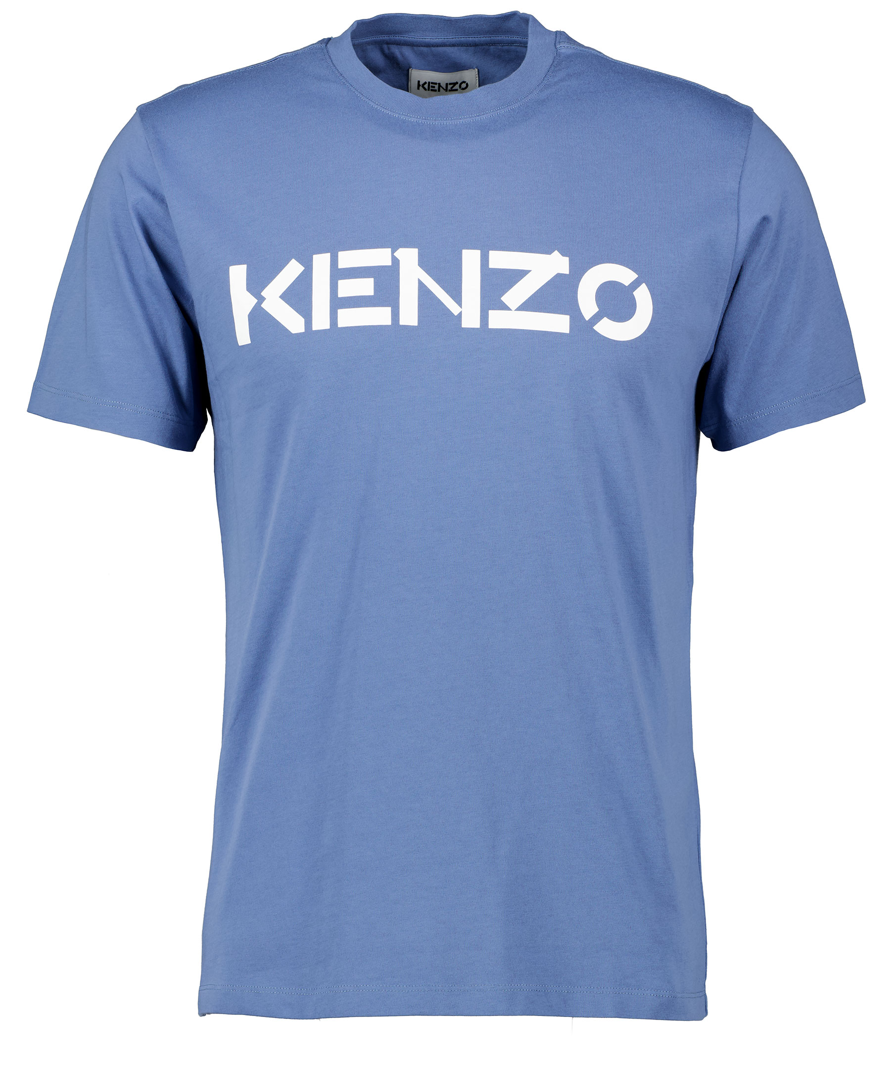 Blå t-shirt från Kenzo. Stort vitt tryck på bröstet, crewneck, tillverkad i 100% bomull. Modellen är 190 cm lång och bär storlek M.
