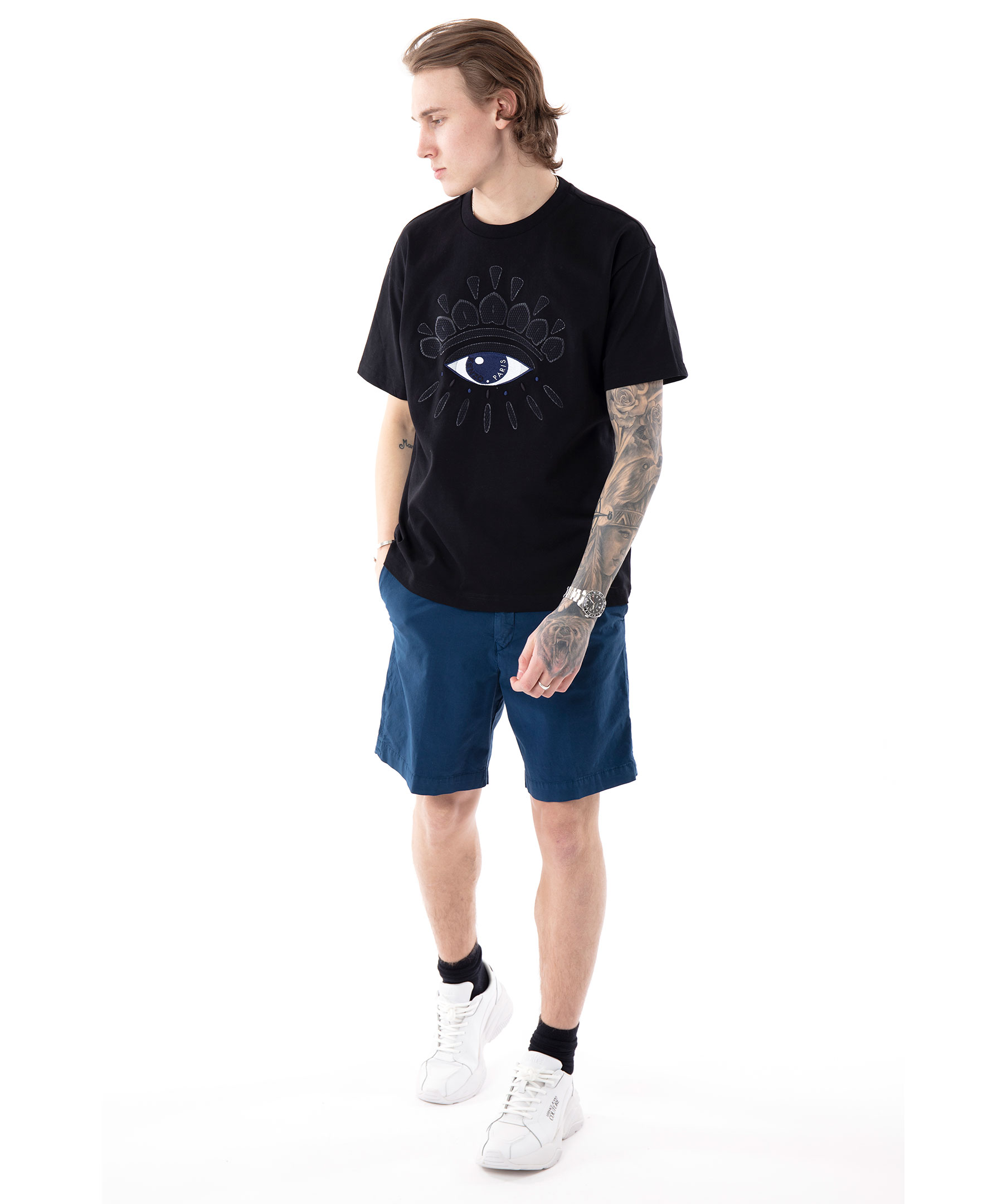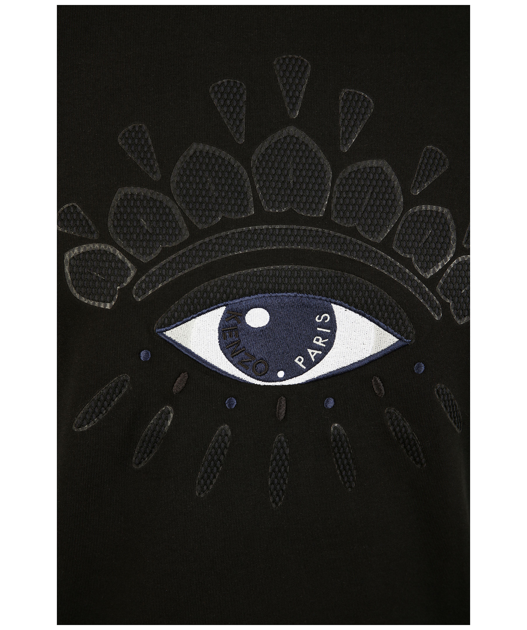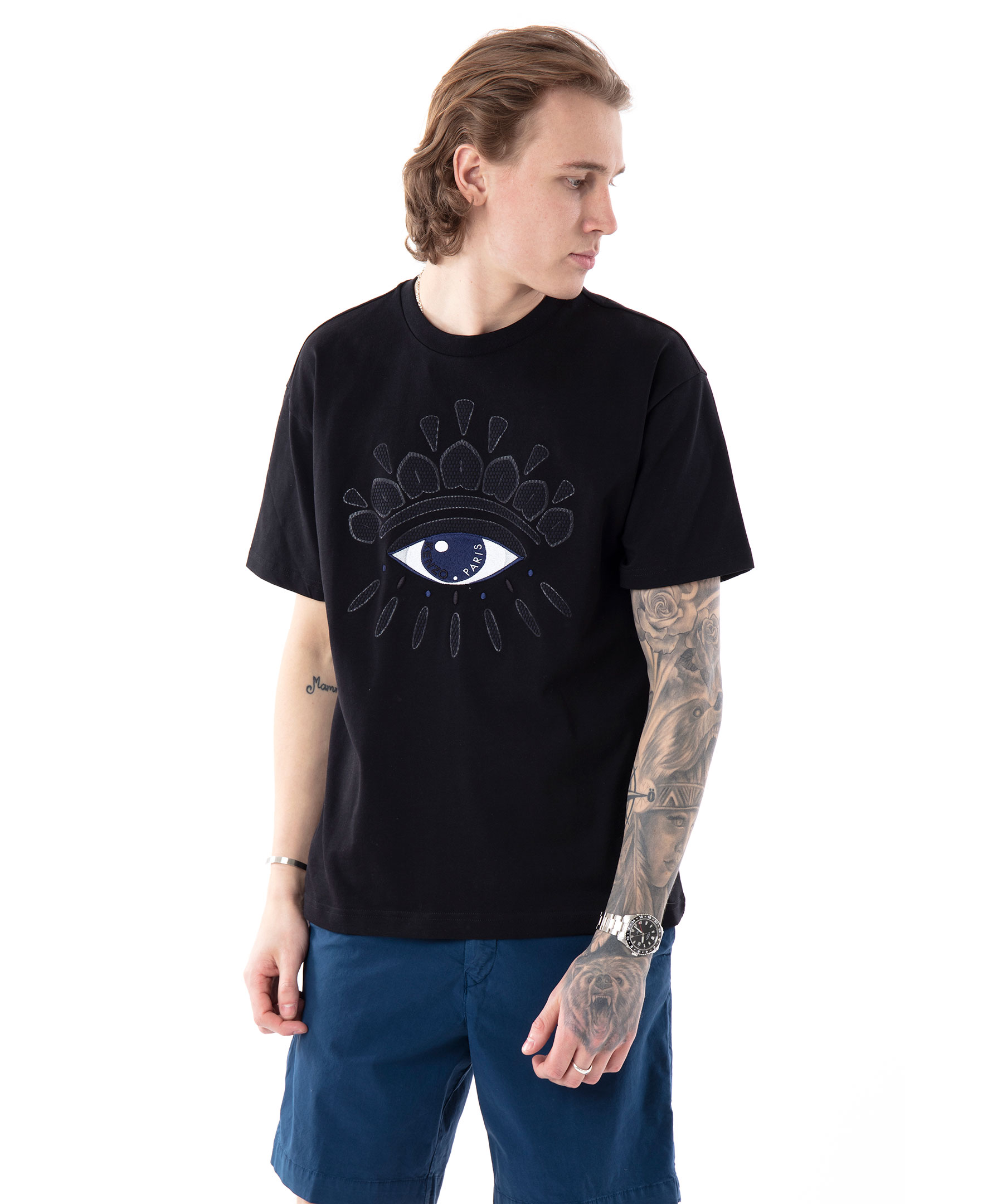 Svart t-shirt från Kenzo. Tröjan är tillverkad i ett kraftigt bomullstyg. Stort broderat öga på bröstet med dekorativa meshtygsdetaljer. Rundad hals. Modellen är 180 cm lång och bär storlek M.